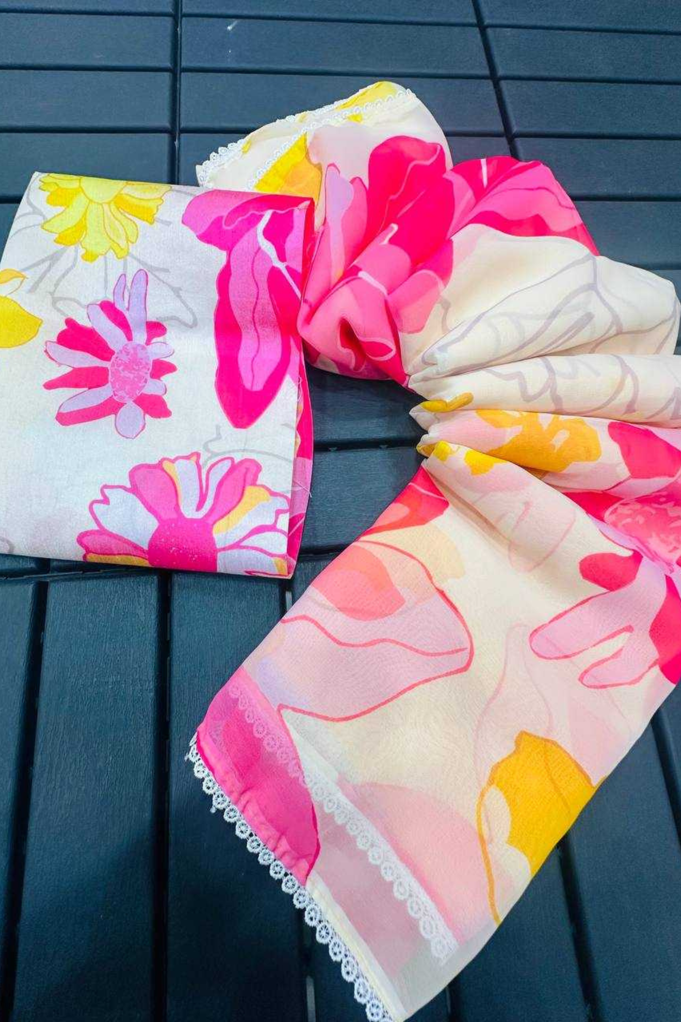 Step into elegance with this Designer Soft Georgette Saree, featuring a refreshing blend of sunshine yellow and soft white hues enhanced by beautiful pink floral prints. The saree is elevated with fancy lace detailing, a heavy pallu, and a stunning Mono Banglory Silk blouse — creating a graceful ensemble perfect for festive occasions, brunch events, or daytime celebrations.
