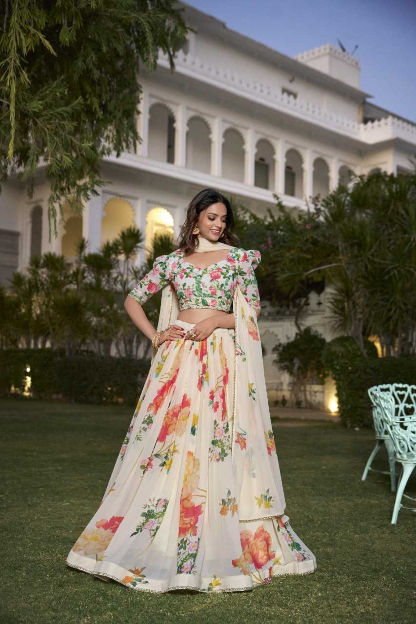 Step into elegance with this Floral Print Cream Georgette Lehenga Set, adorned with vibrant blooms for a refreshing festive look. The set comes with a georgette blouse and georgette dupatta, making it the perfect outfit for weddings, haldi, mehendi, and daytime celebrations.