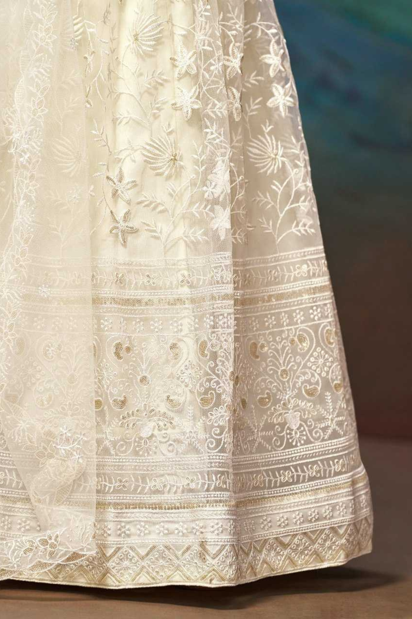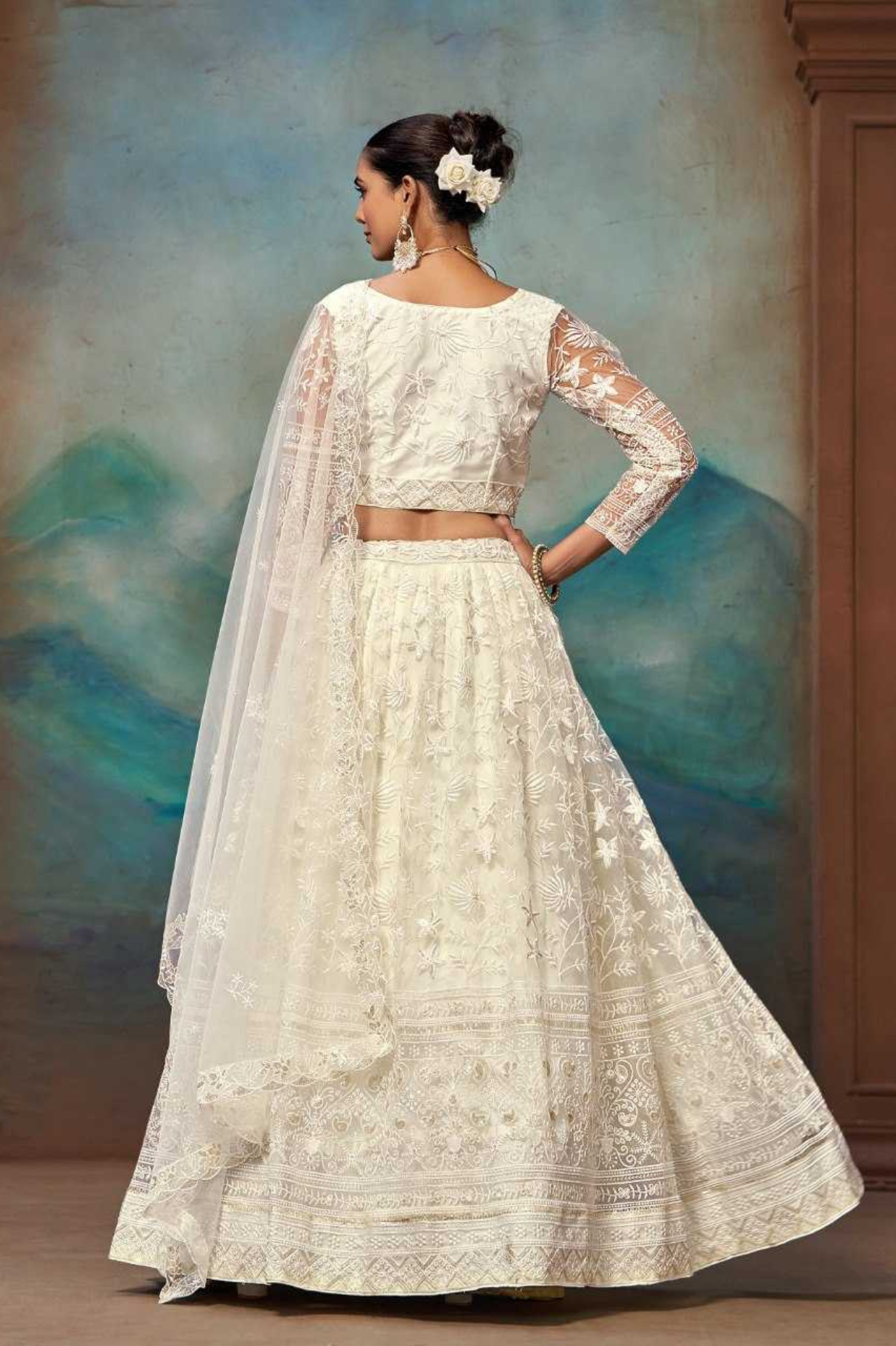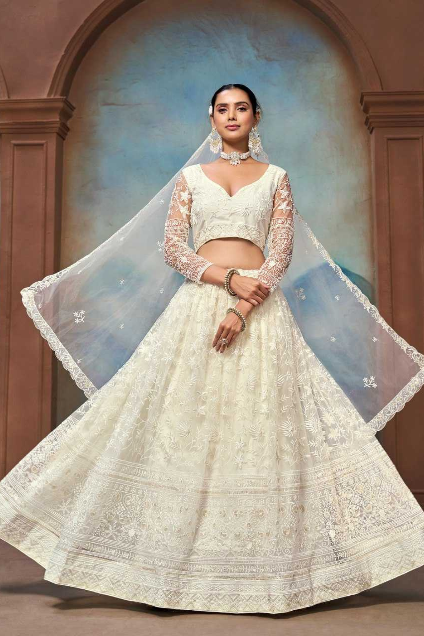 Step into elegance with this exquisite ivory butterfly net lehenga choli set that exudes sophistication and grace. The lehenga is crafted from butterfly net fabric featuring intricate embroidery and delicate floral motifs, paired with a stylish embroidered butterfly net blouse with sheer sleeves. Completing the look is a butterfly net dupatta adorned with fine embroidery, adding a touch of ethereal charm. Perfect for weddings, engagements, and festive occasions.