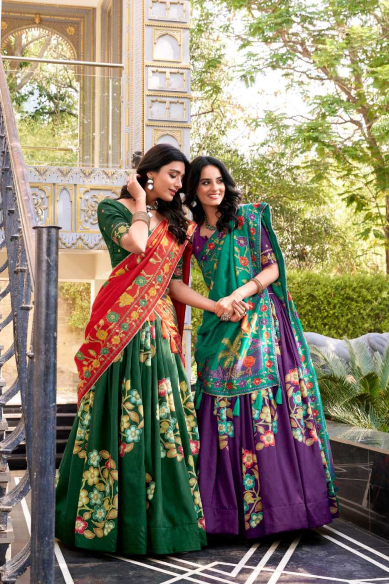 A perfect blend of grace and tradition, this Tussar Silk lehenga set features rich printed & foil work with lace and tassel accents. Designed with canvas & can-can for added volume, this outfit is an ideal pick for festivals, Navratri nights, and grand celebrations.