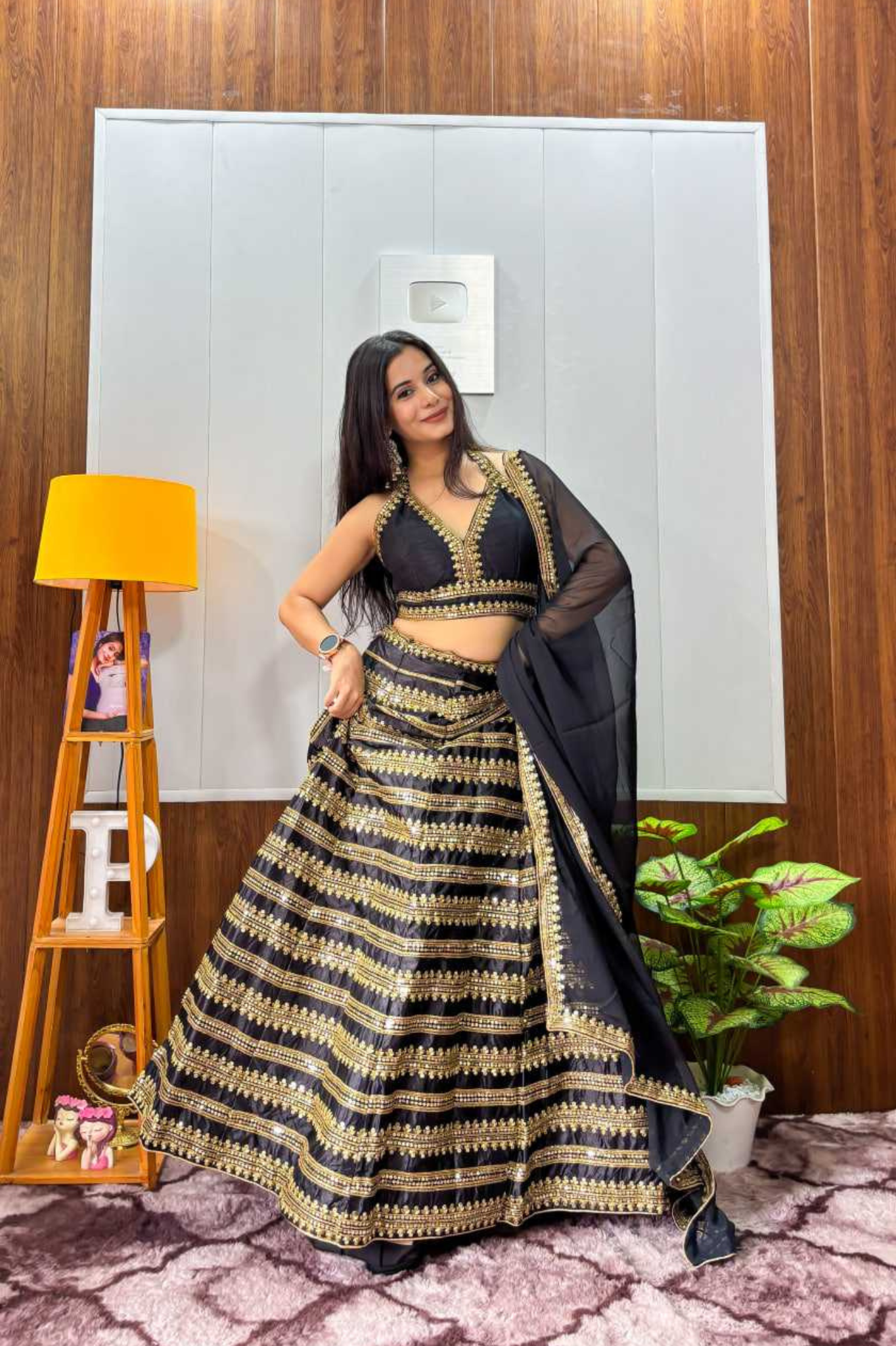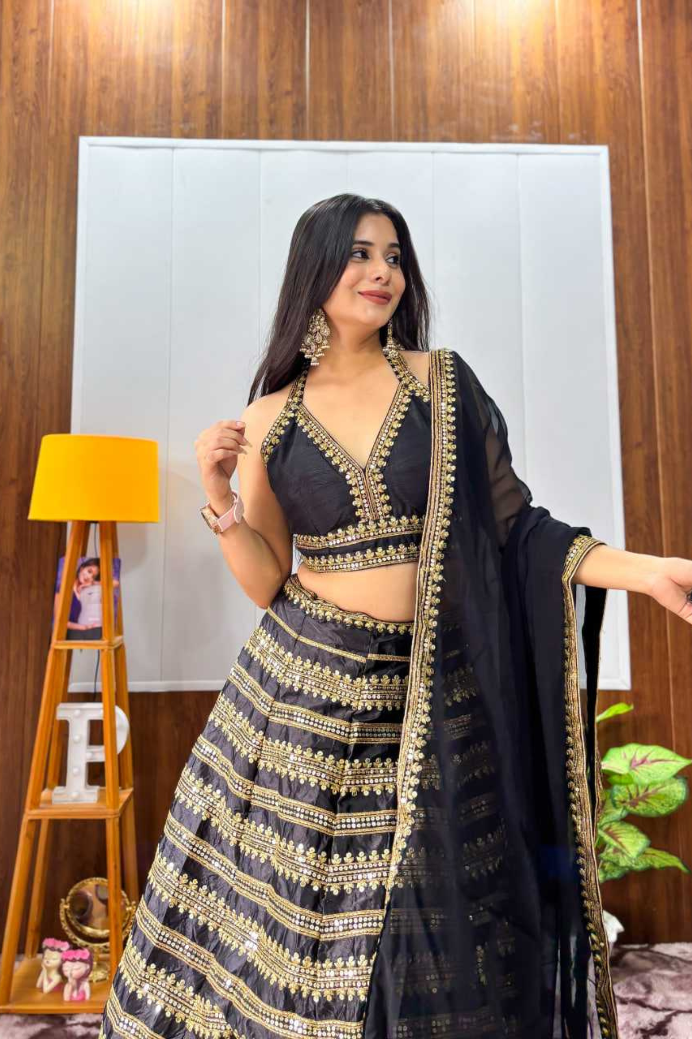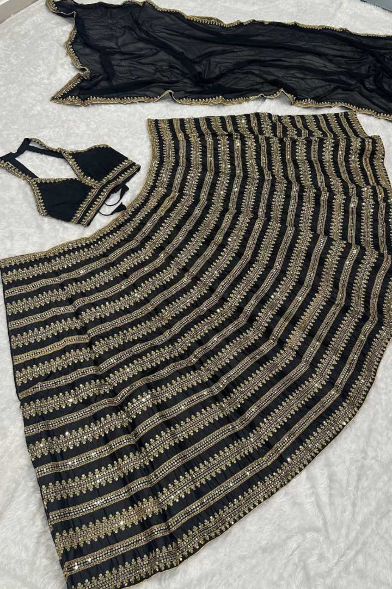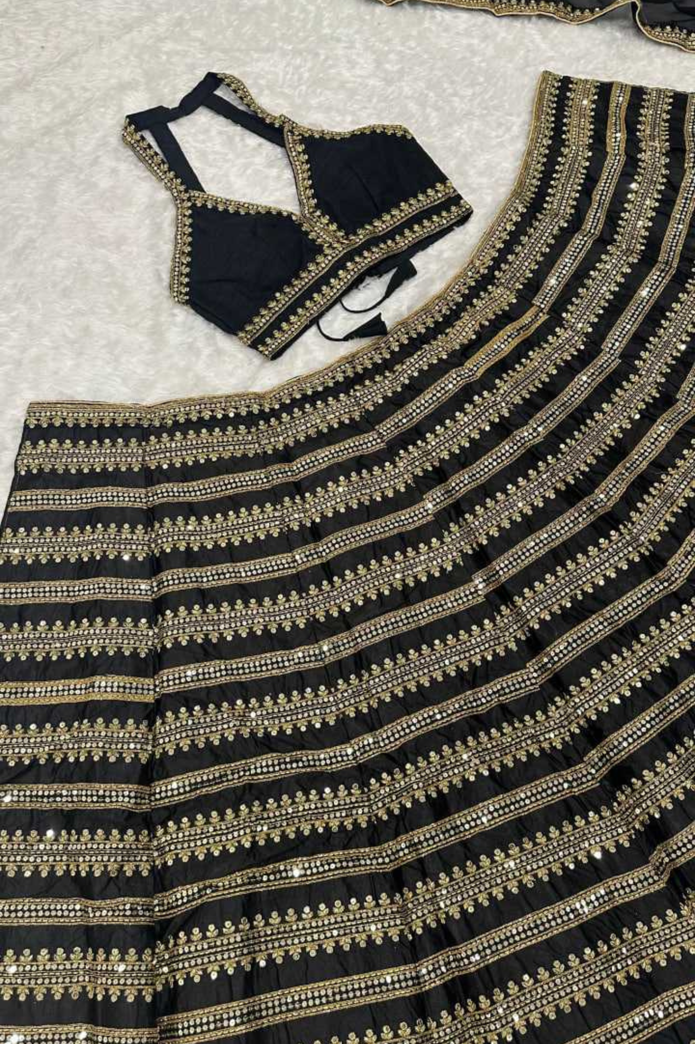 This stunning black lehenga choli set is crafted in heavy Kasturi silk with exquisite sequins and dori work, offering a rich and elegant appeal. Designed with a 3-meter flair and attached cancan, the lehenga ensures a graceful silhouette. The heavy Banglori silk blouse features sequins and dori lace border work and comes unstitch for custom fitting. Completing the look is a georgette dupatta adorned with sequins and dori work, making it the perfect choice for festive occasions, weddings, and traditional celebrations.