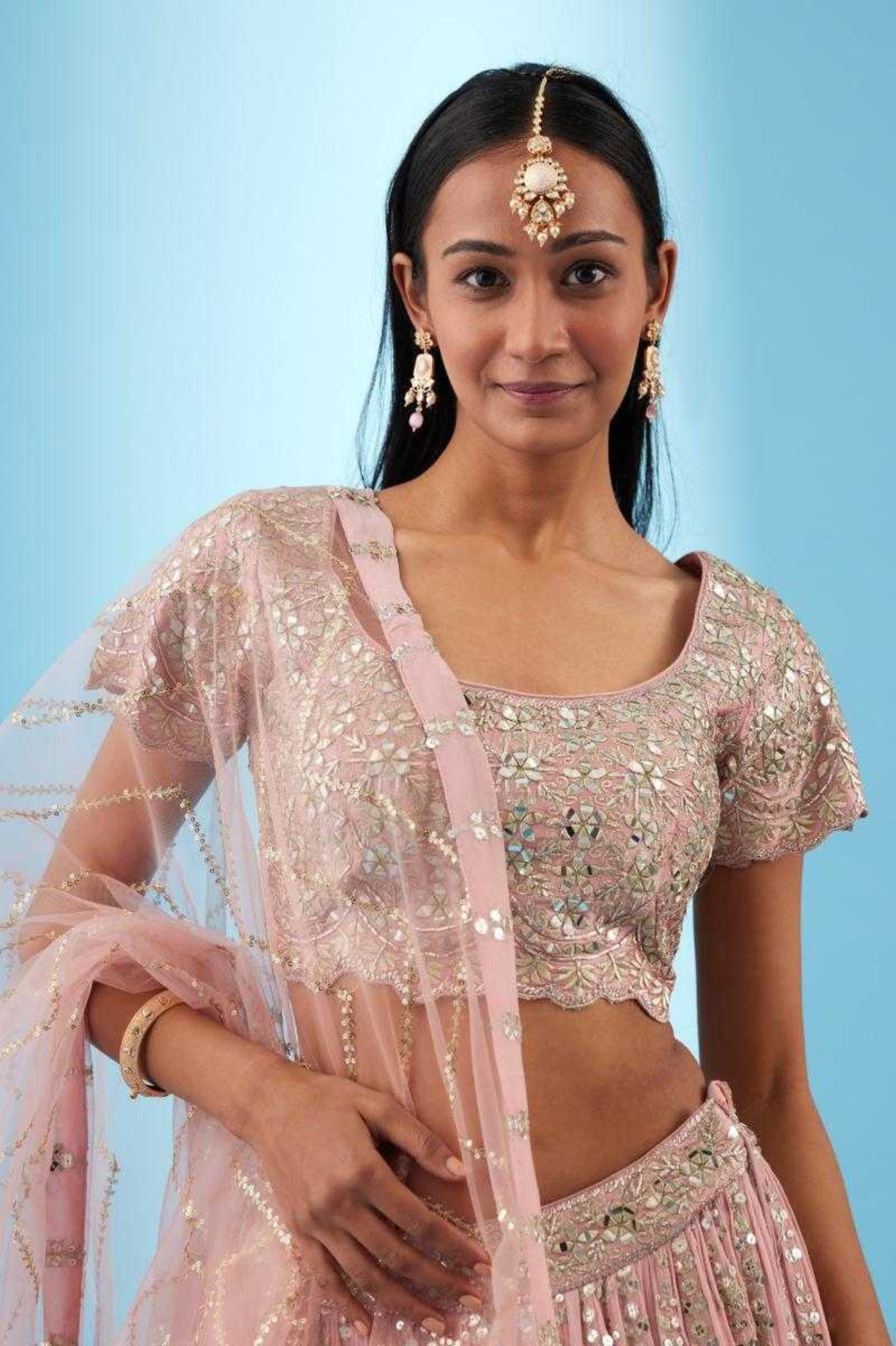 Elevate your festive charm with this blush pink faux georgette lehenga set, beautifully detailed with sequin and embroidery work. Paired with a faux georgette blouse and a sheer net dupatta, this ensemble exudes grace and modern elegance. Perfect for weddings, cocktails, and grand celebrations.
