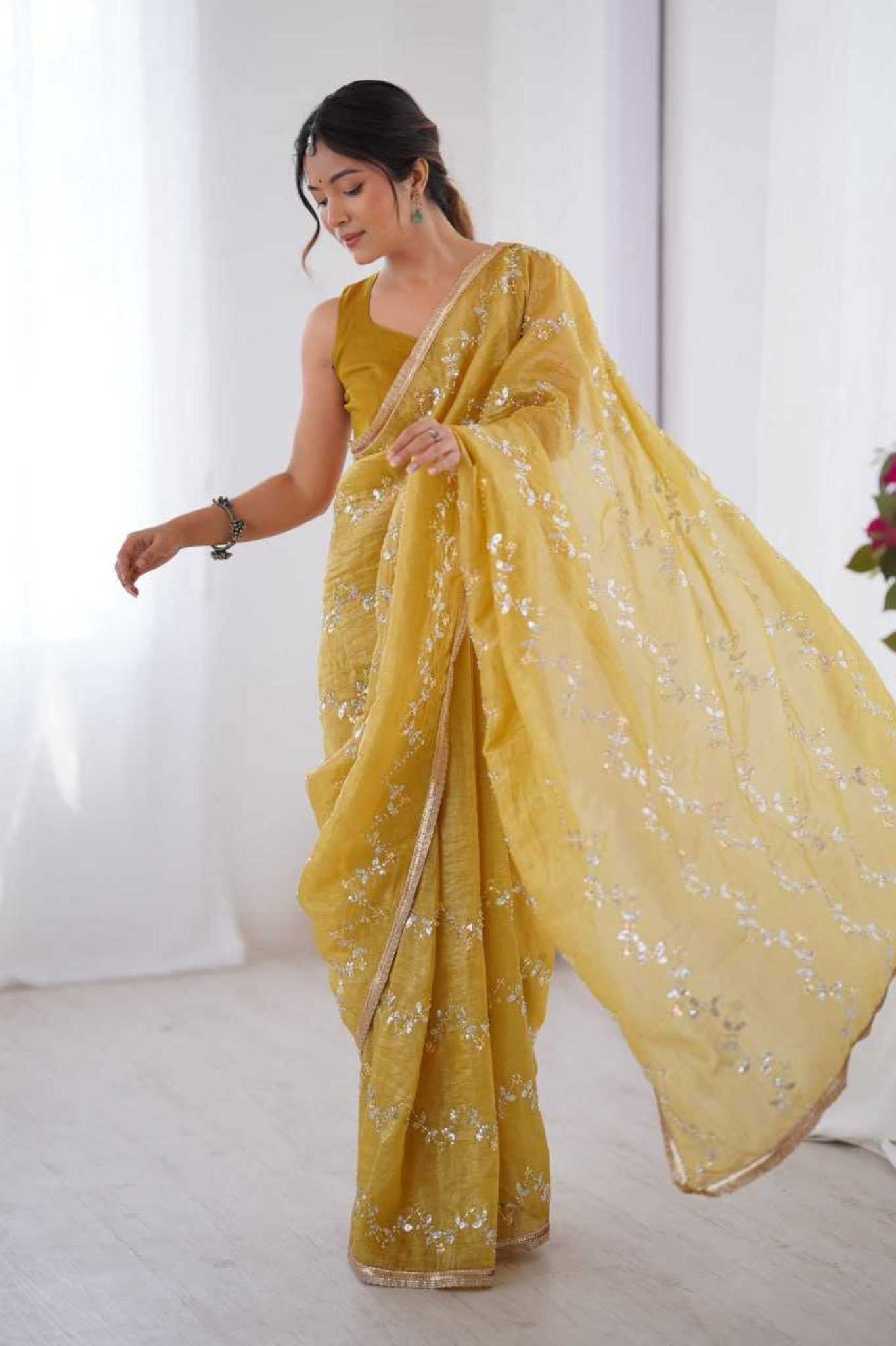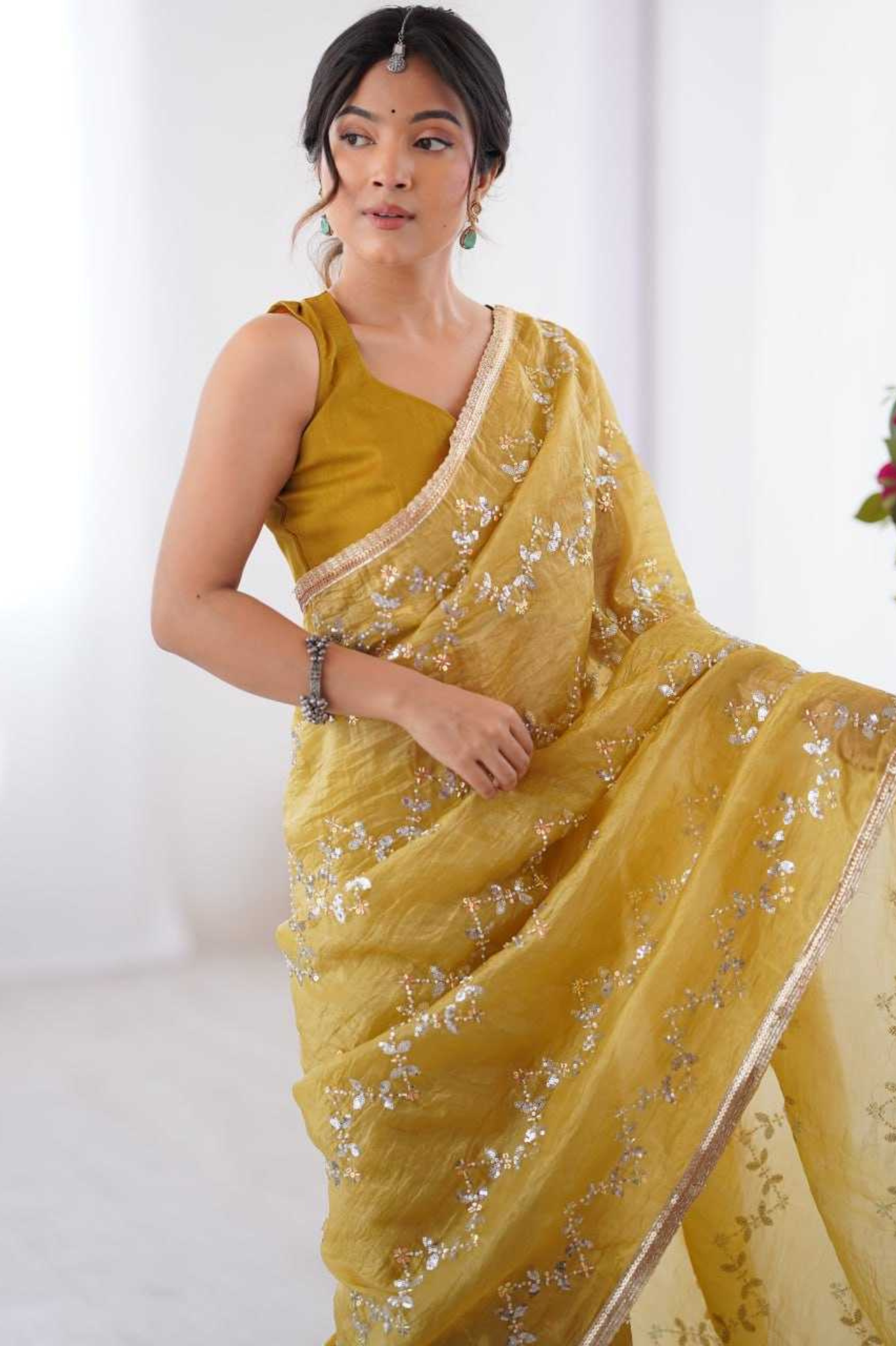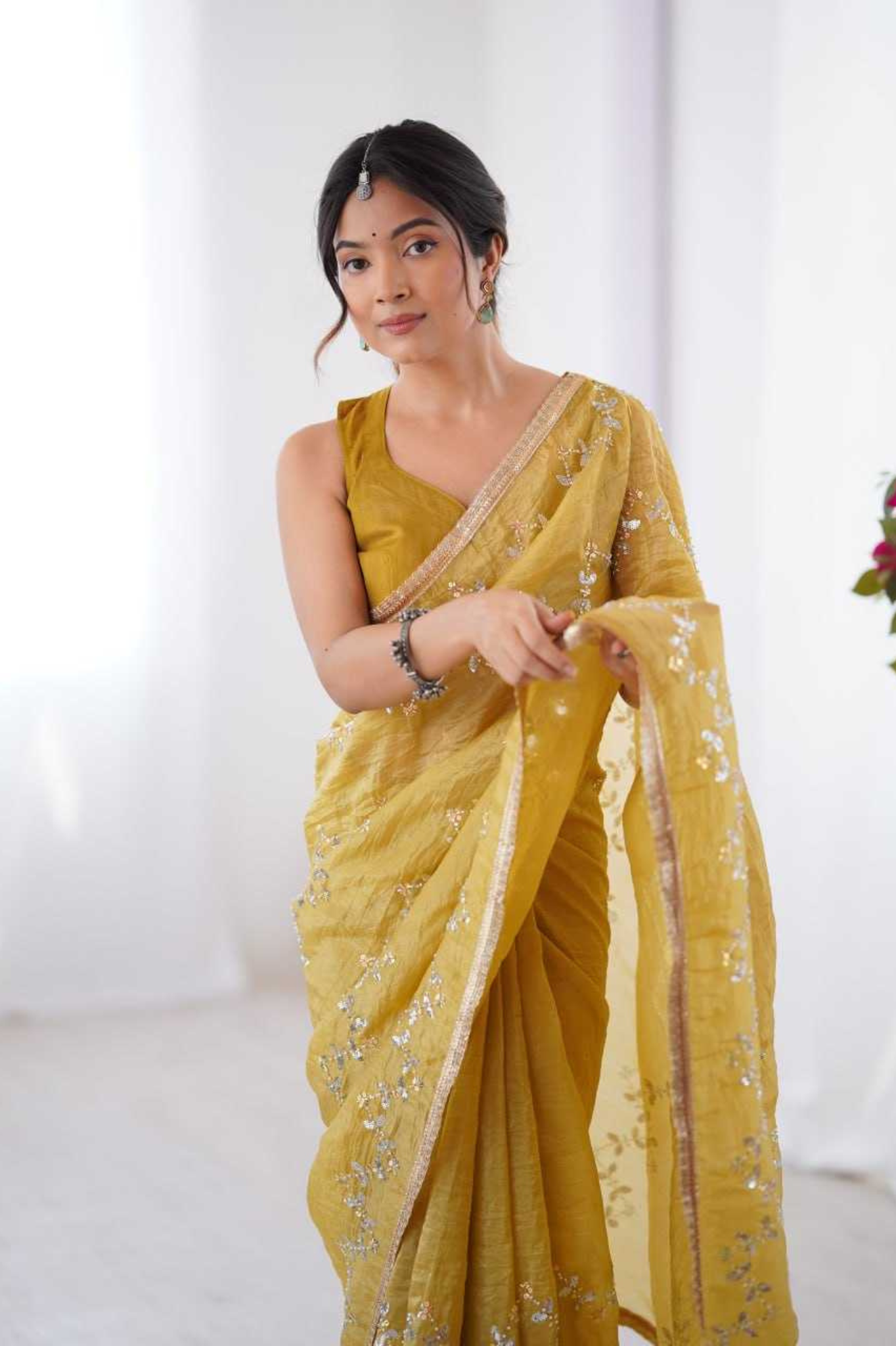 Shine with elegance in this yellow saree crafted from heavy smooth gold crush fabric. The drape is beautifully adorned with designer moti and zigzag striped sequin embroidery work all over, giving it a rich and festive appeal. Paired with a heavy mono Banglori plain blouse featuring a lace border, this saree is a timeless choice for weddings, parties, and special celebrations.