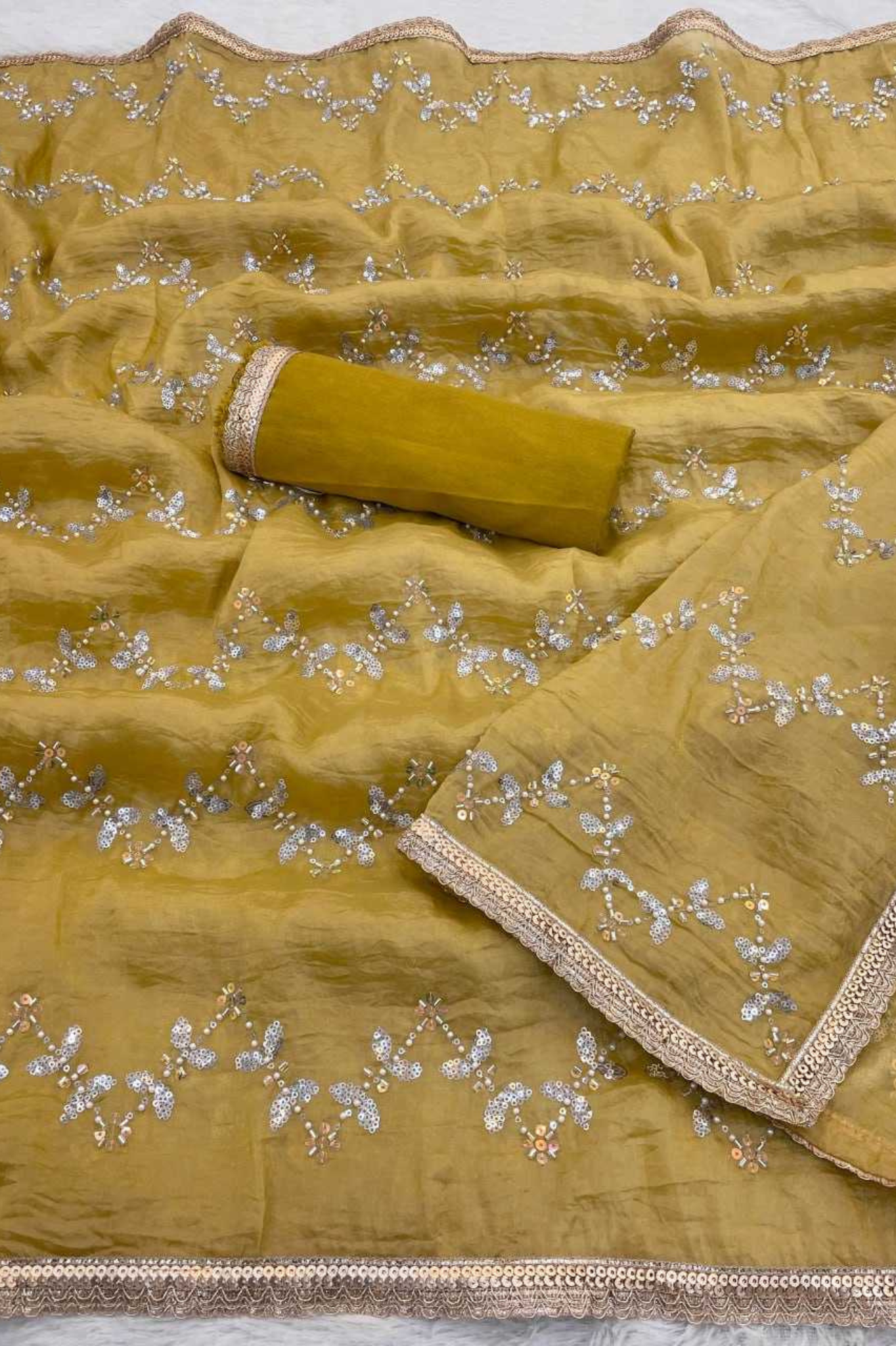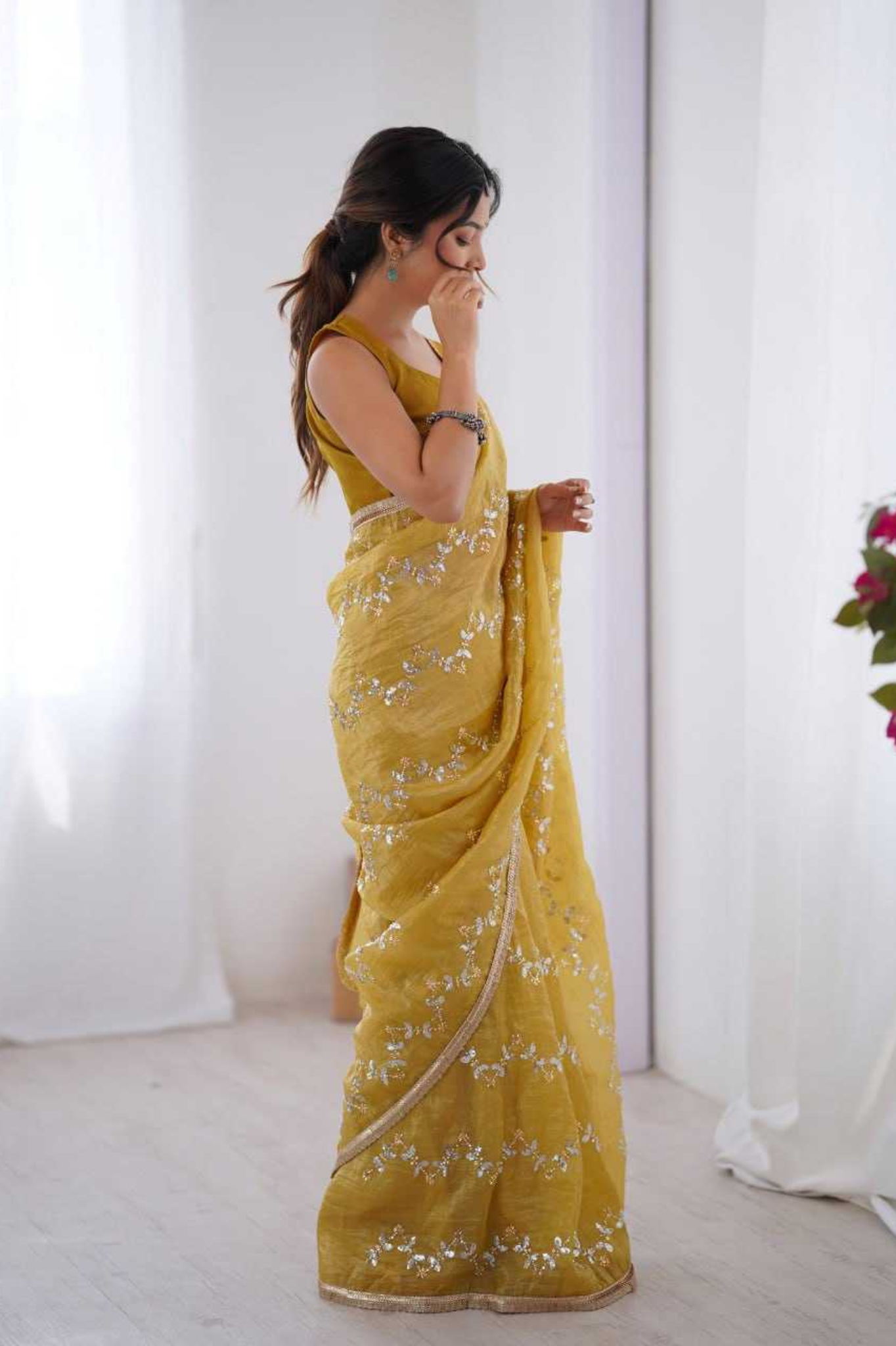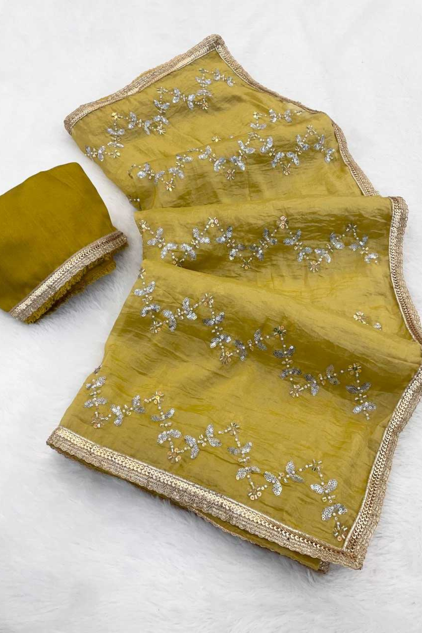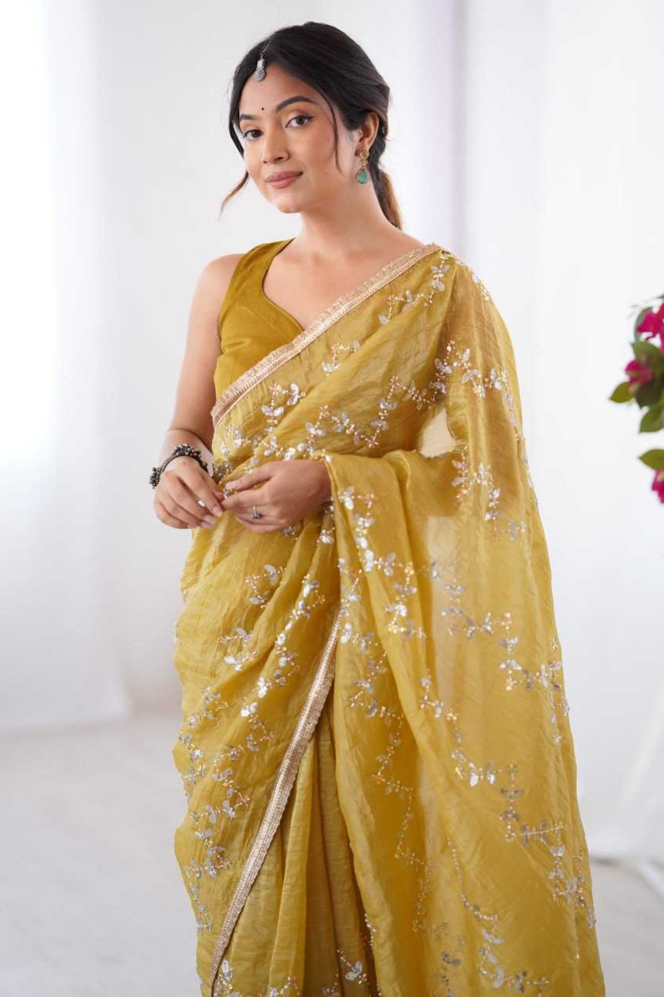 Shine with elegance in this yellow saree crafted from heavy smooth gold crush fabric. The drape is beautifully adorned with designer moti and zigzag striped sequin embroidery work all over, giving it a rich and festive appeal. Paired with a heavy mono Banglori plain blouse featuring a lace border, this saree is a timeless choice for weddings, parties, and special celebrations.