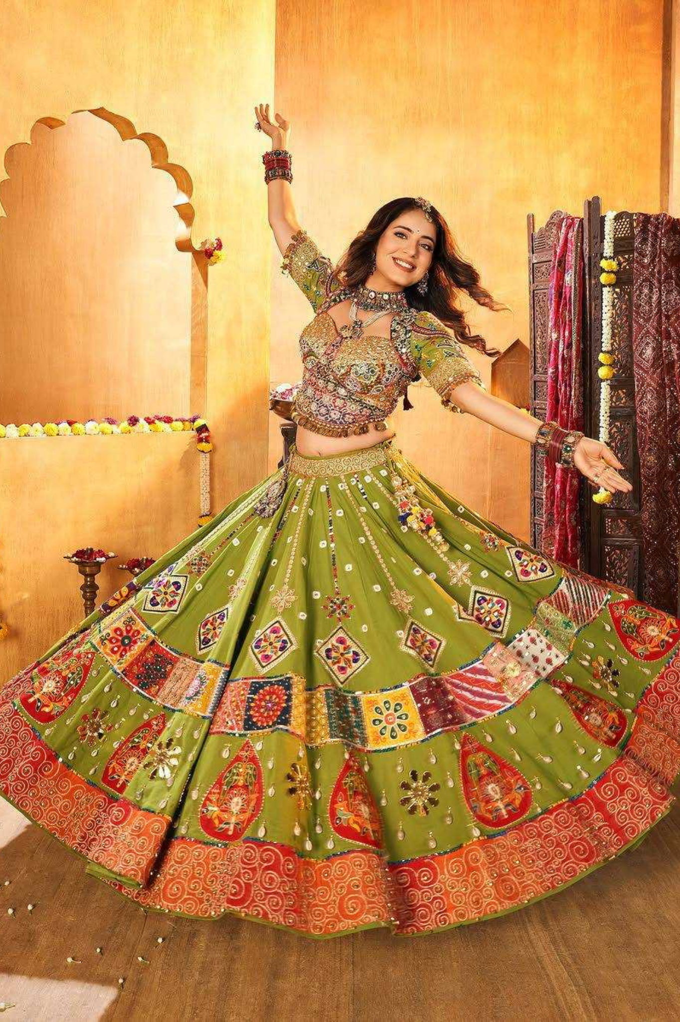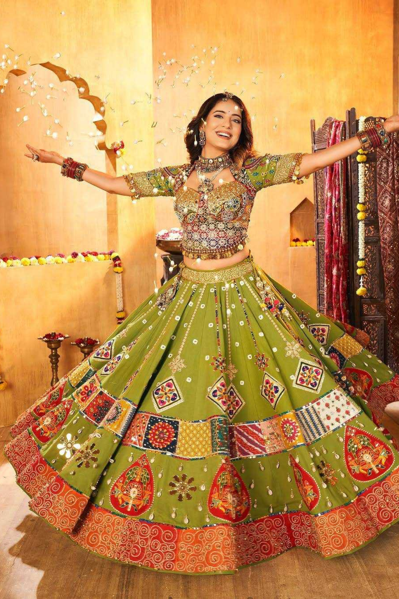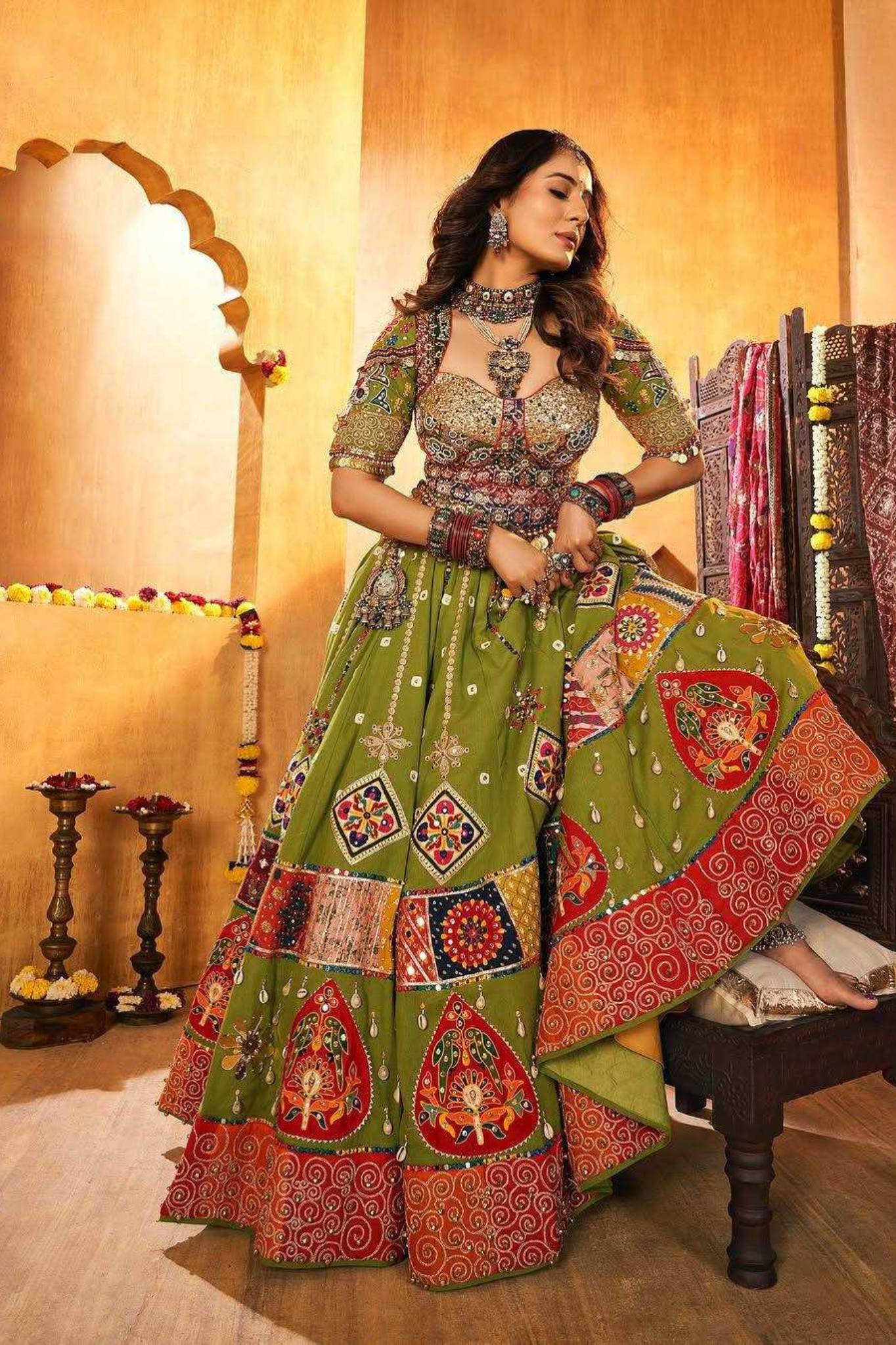 Green Muslin Cotton Navratri Lehenga Choli with Real Mirror & Kodi Work