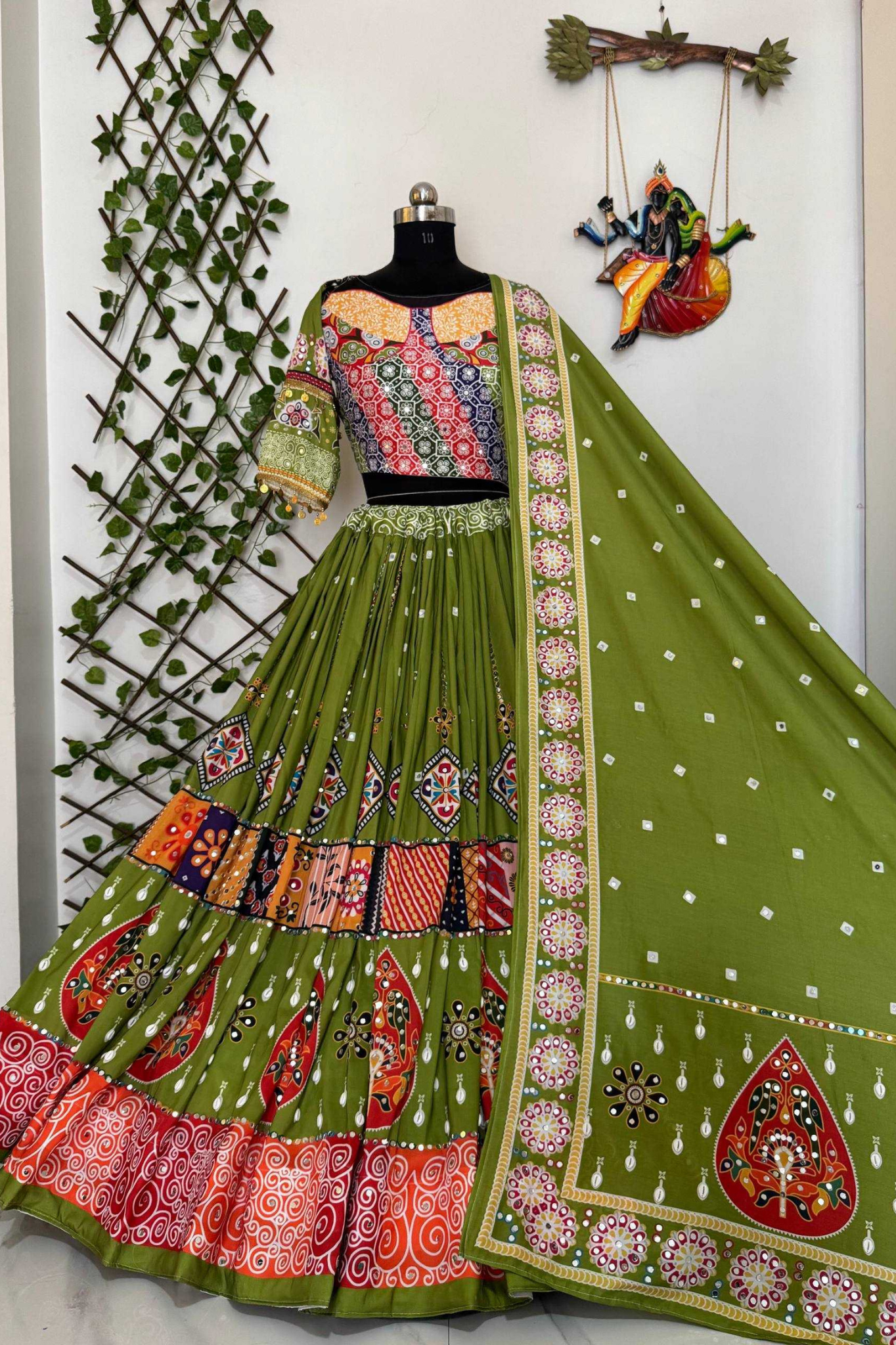 Step into the festive season with this elegant green muslin cotton lehenga choli, featuring digital prints, real mirror work, kodi...