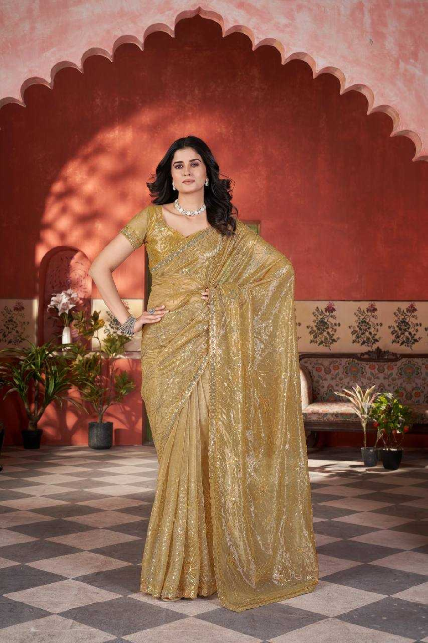 Shine with elegance in this golden saree crafted from heavy smooth gold crush fabric. The drape is beautifully adorned with designer moti and zigzag striped sequin embroidery work all over, giving it a rich and festive appeal. Paired with a heavy mono Banglori plain...