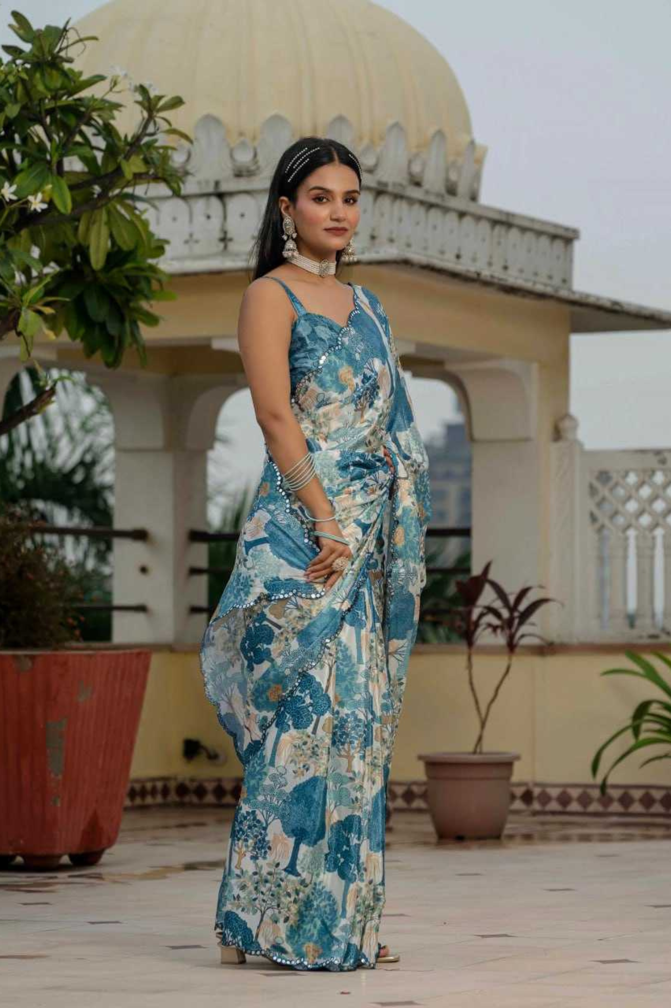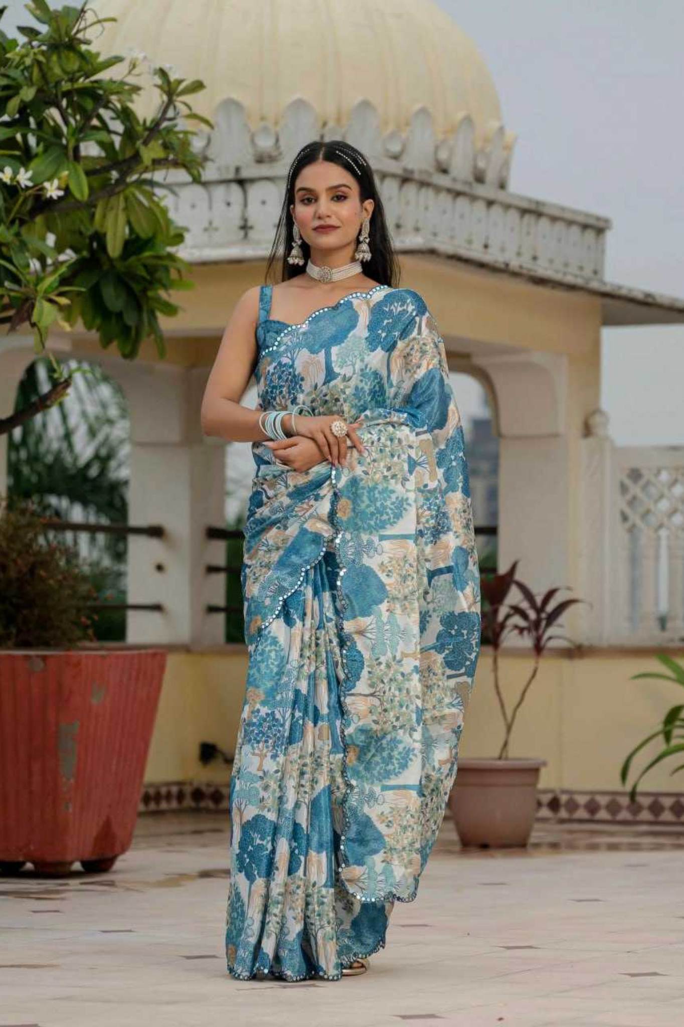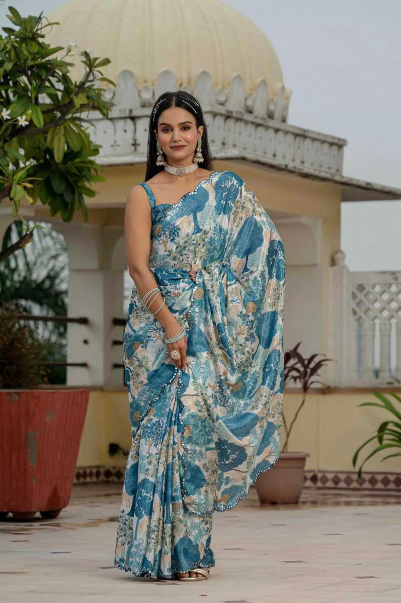 Fabric: Heavy Chinnon Pattern: Beautiful printed design enhanced with delicate Kutchi work and mirror lace border Blouse: Matching Heavy Chinnon blouse piece (0.8 meter, unstitched) Saree Type: Ready to Wear Occasion: Perfect for festive events, parties, and casual gatherings