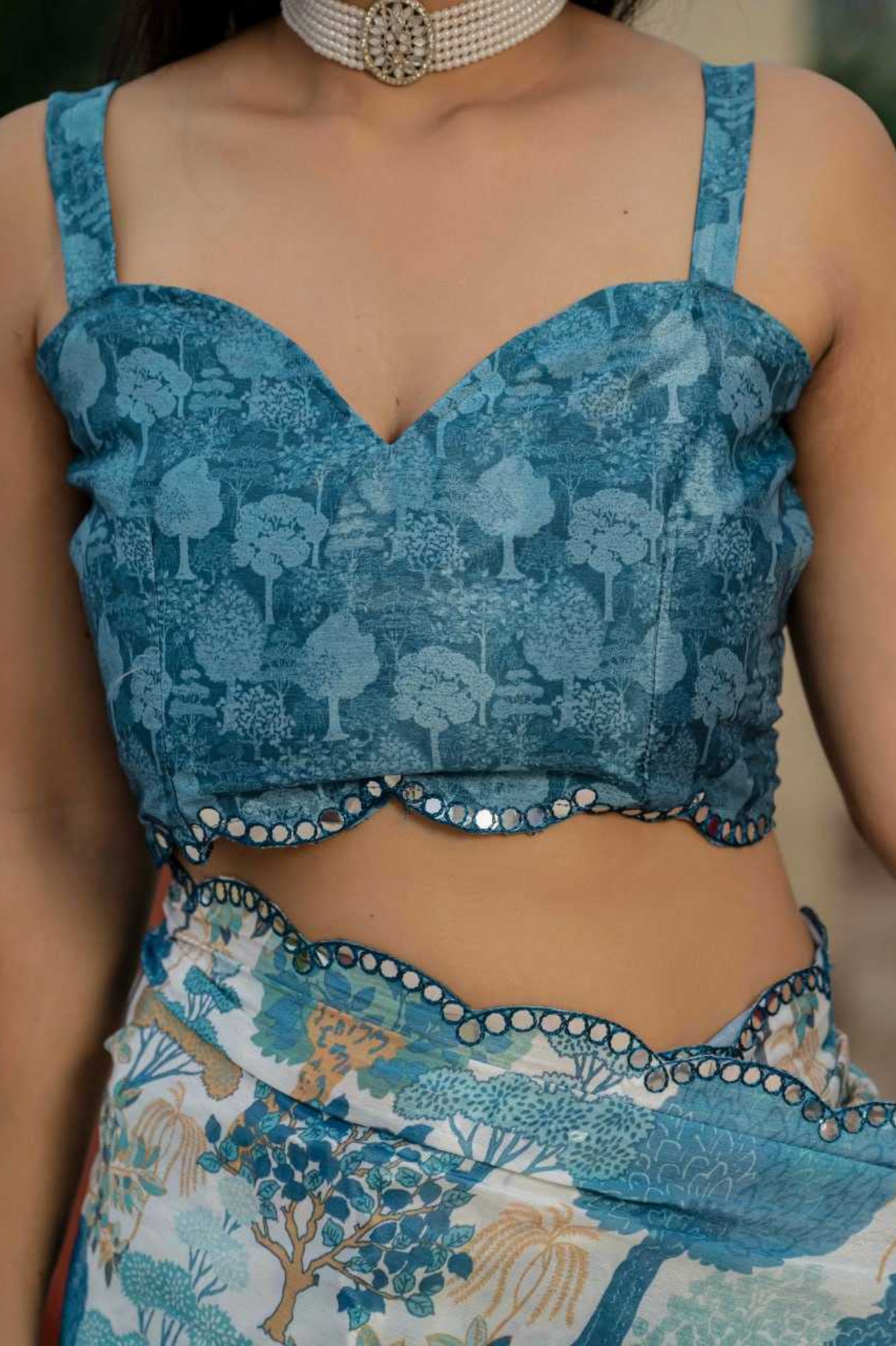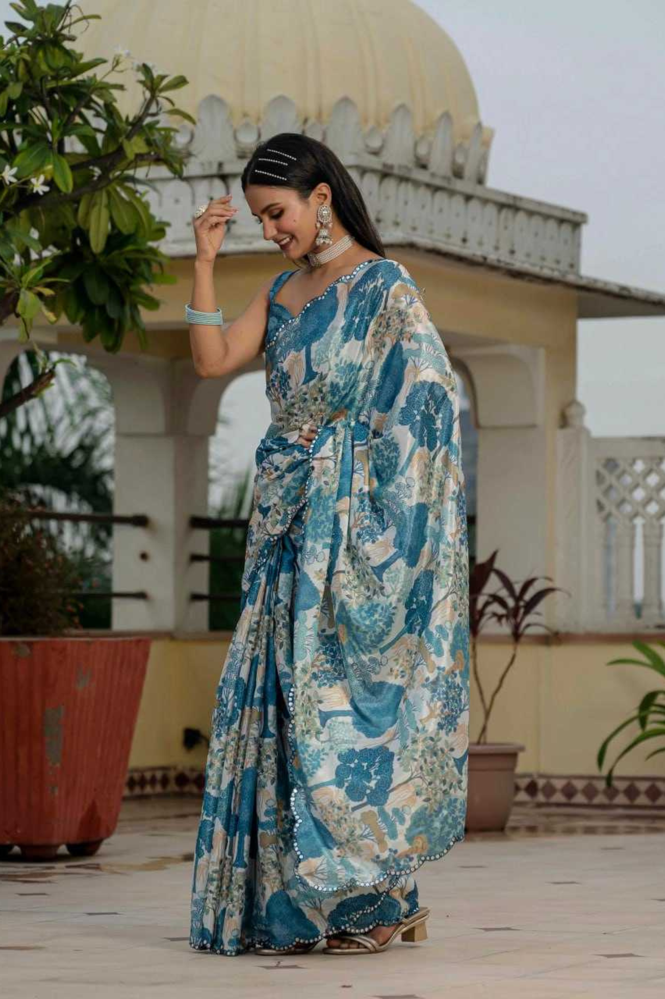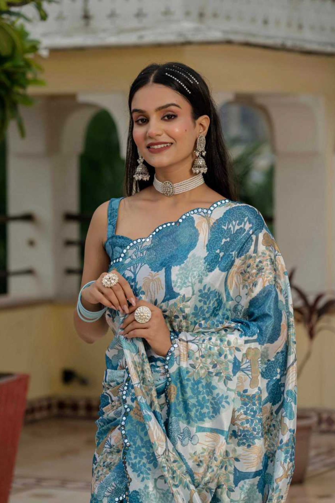 Fabric: Heavy Chinnon Pattern: Beautiful printed design enhanced with delicate Kutchi work and mirror lace border Blouse: Matching Heavy Chinnon blouse piece (0.8 meter, unstitched) Saree Type: Ready to Wear Occasion: Perfect for festive events, parties, and casual gatherings