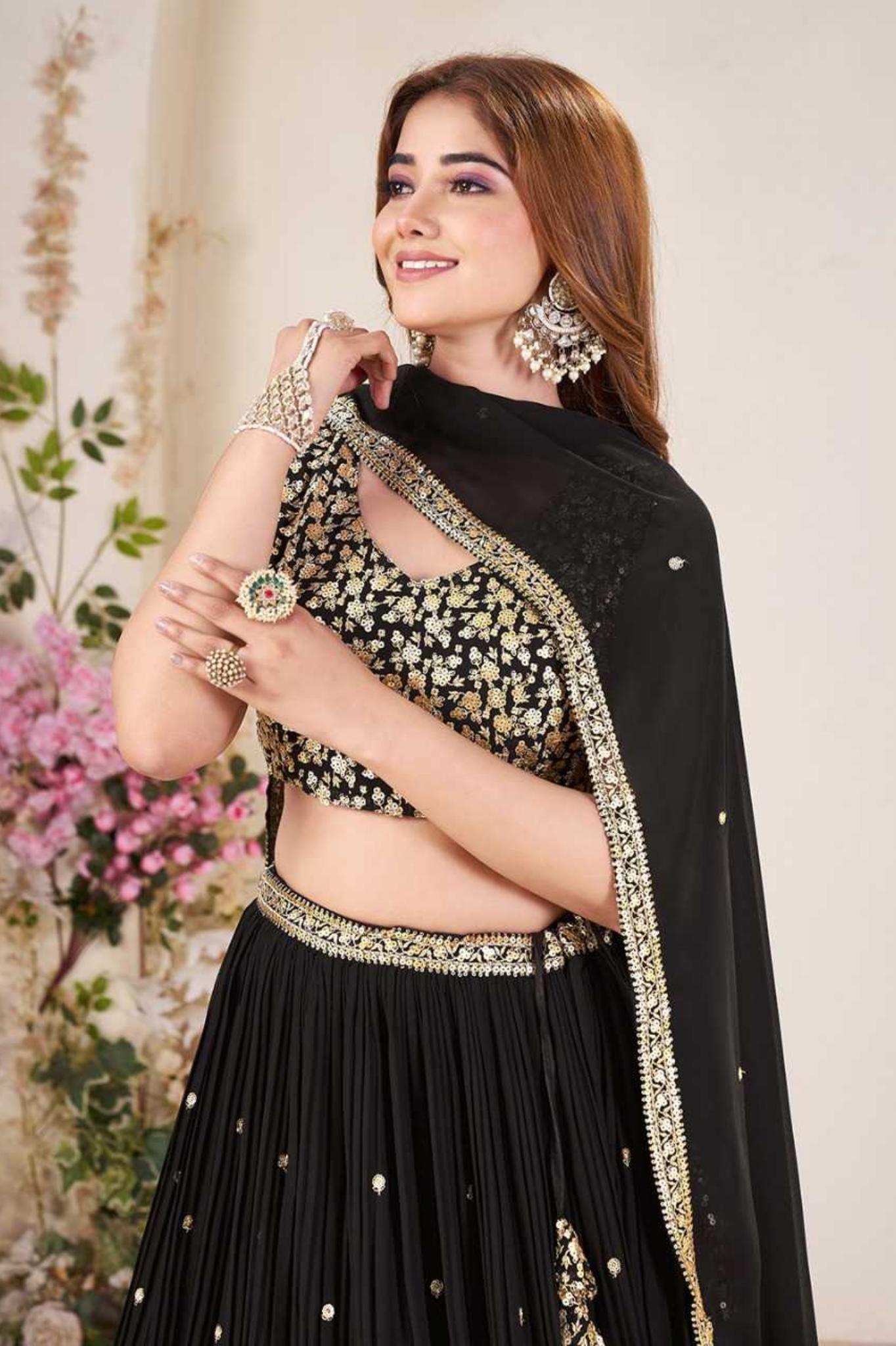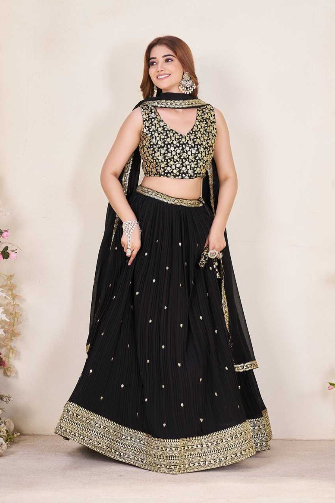 Dazzle in elegance with this black georgette lehenga choli set adorned with golden embroidery and intricate detailing. The lehenga is crafted from georgette fabric with a broad embellished border, paired with a stylish embroidered georgette blouse for a regal look. Completing the set is a georgette dupatta enhanced with delicate embroidery and lace, making it a perfect choice for weddings, receptions, and festive occasions.