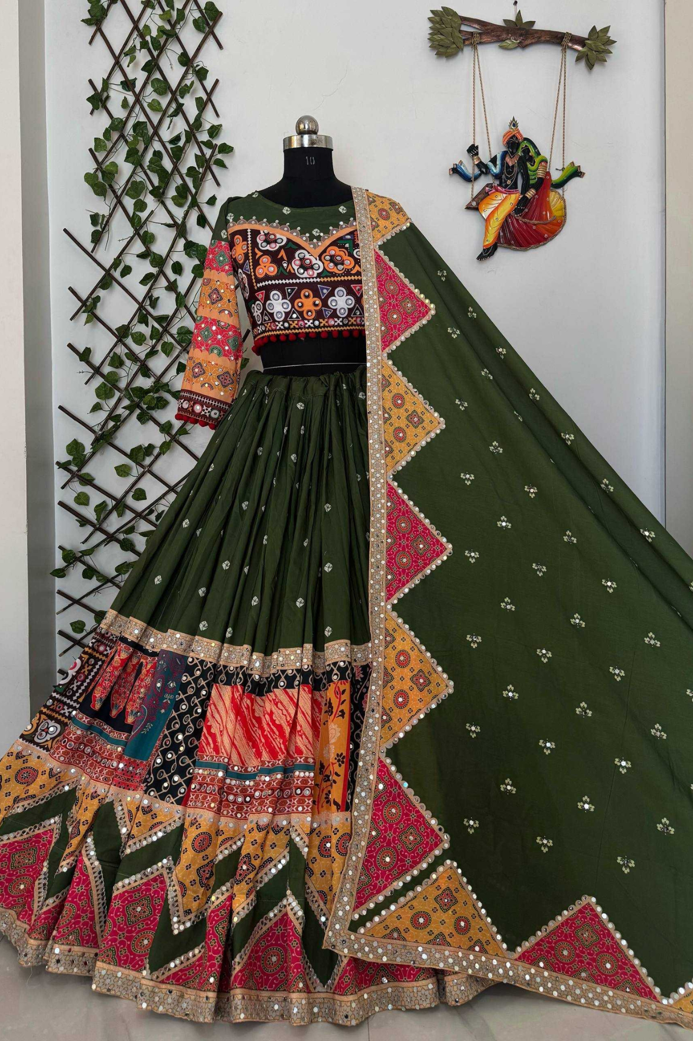Emerald Green Muslin Cotton Mirror Work Lehenga Set