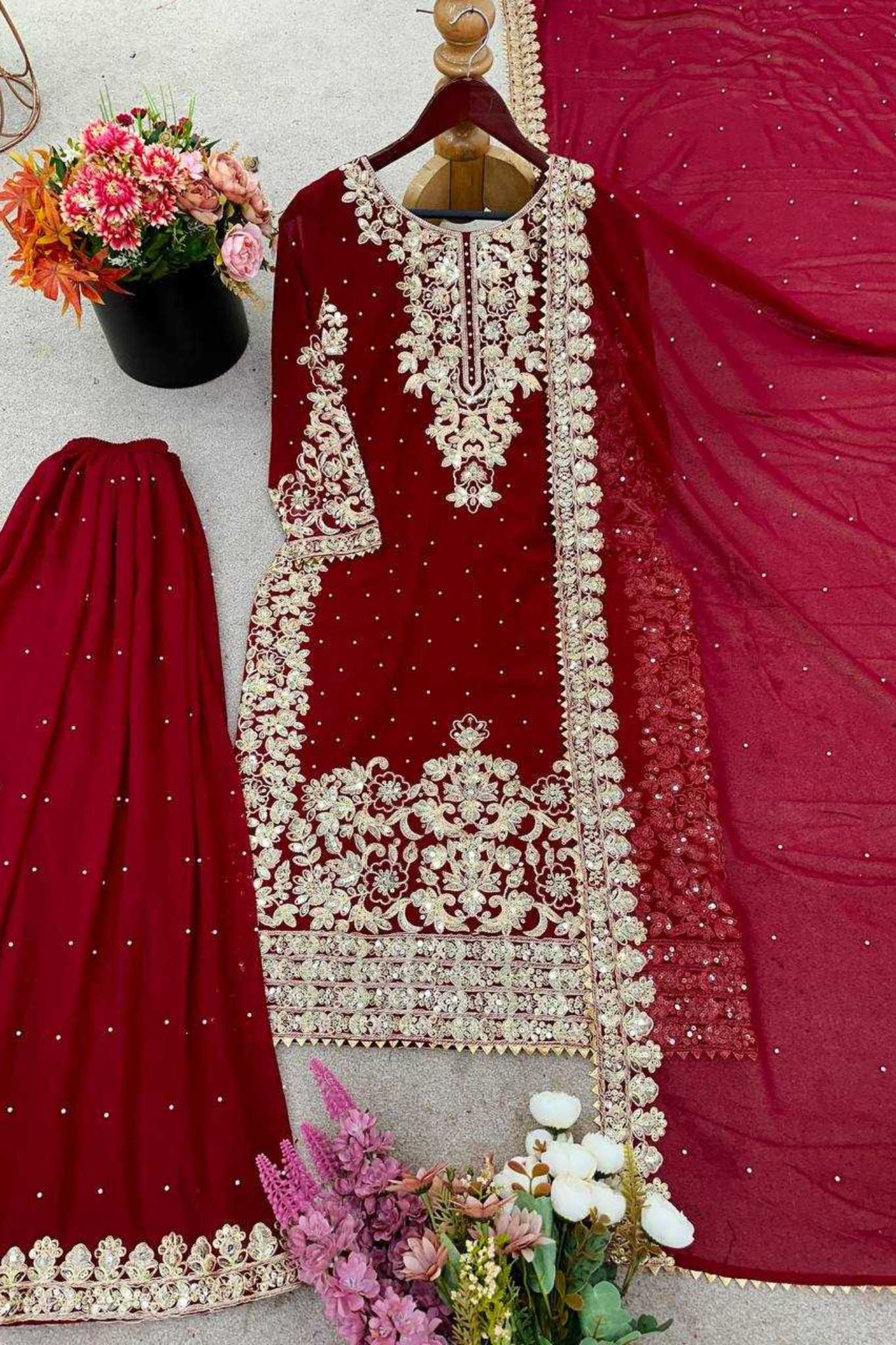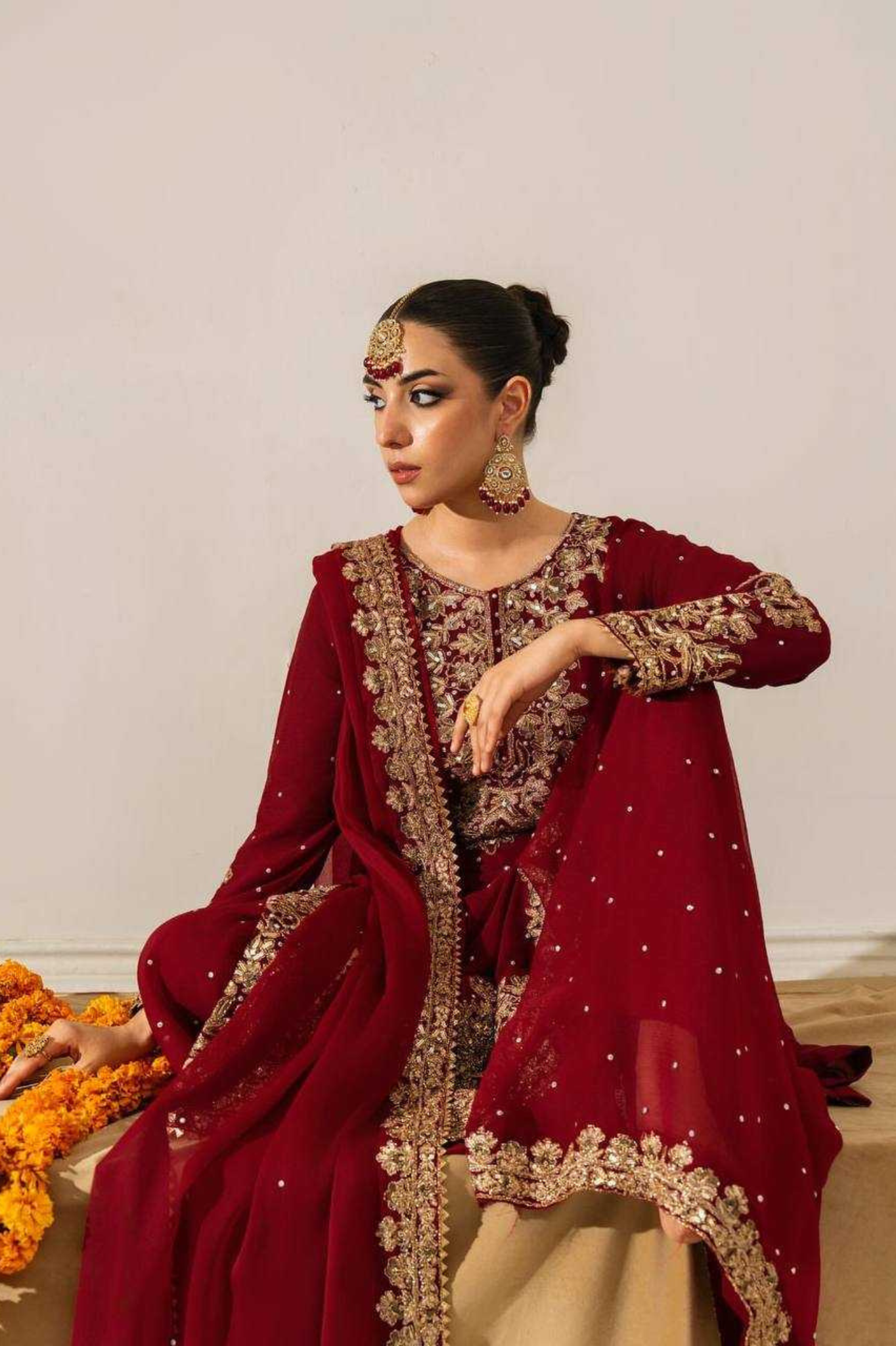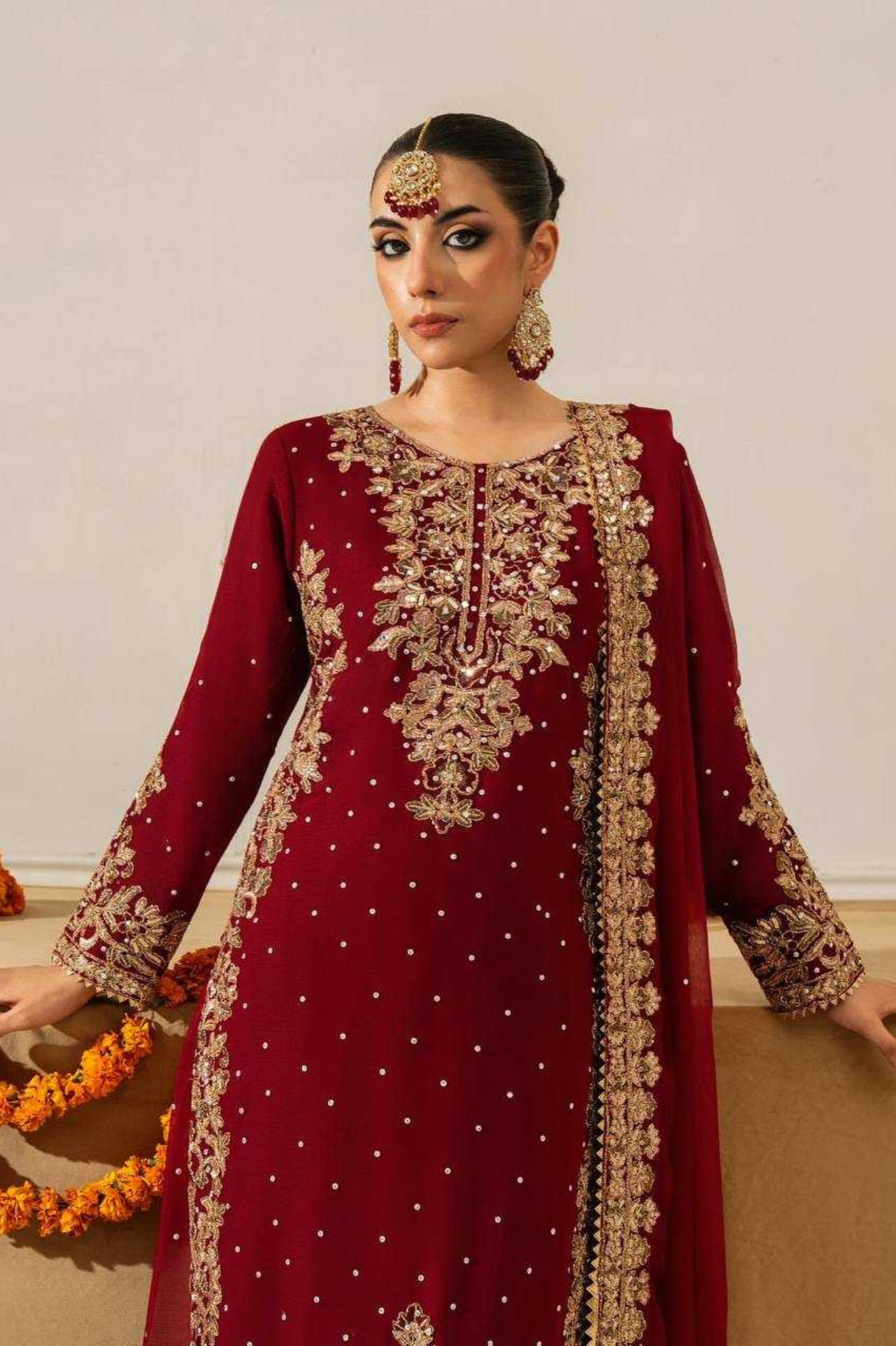 Elegance meets tradition in this stunning maroon heavy georgette suit, adorned with intricate coding sequence and moti work. The top features full sleeves, a comfortable heavy micro cotton inner, and a flattering 45–46 inch length for a regal appeal.