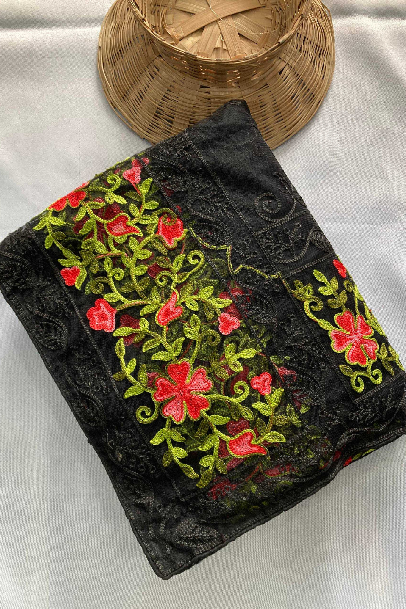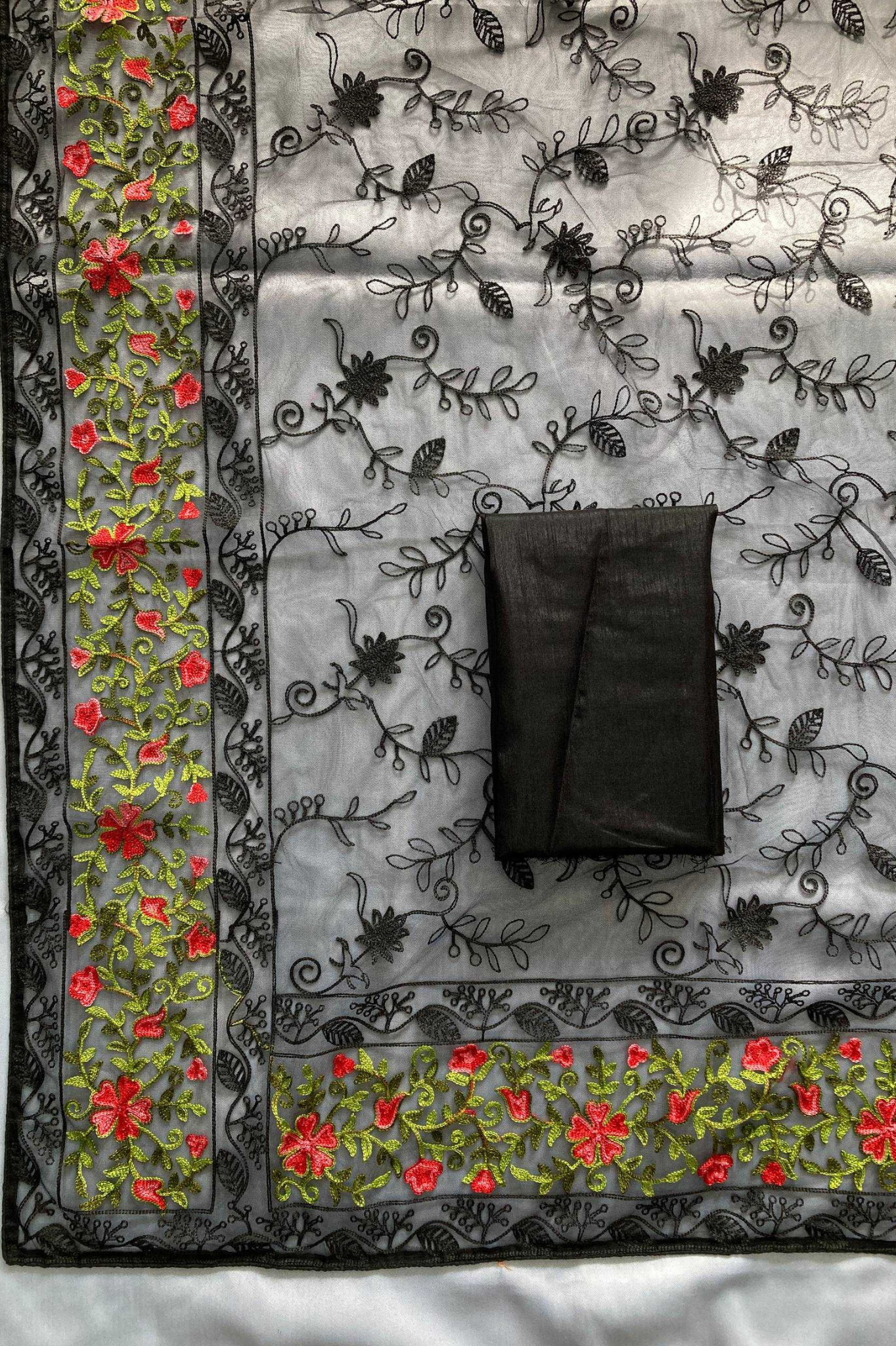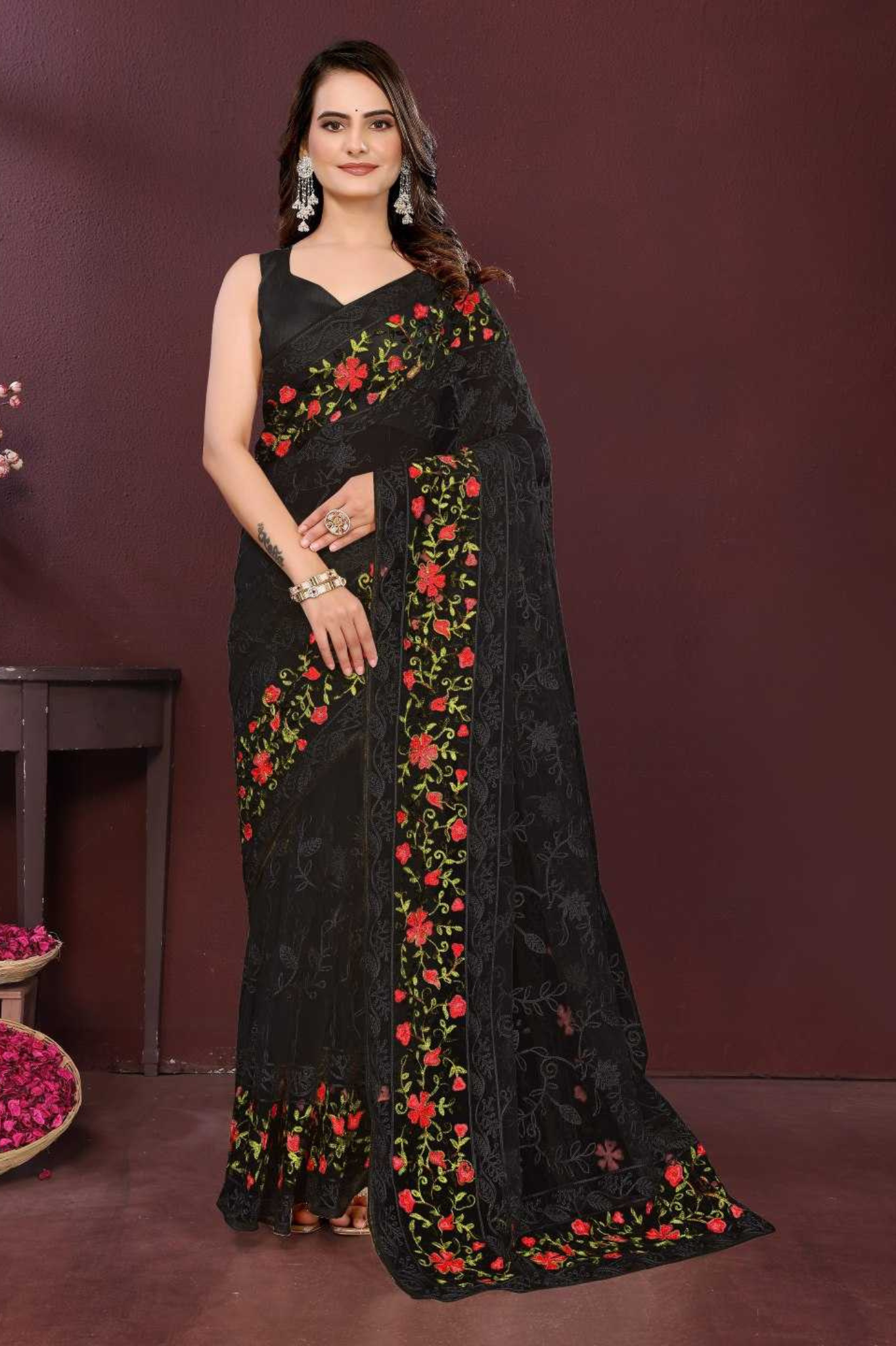 The soft net fabric ensures a luxurious drape and ethereal look, while the vibrant floral motifs add a romantic charm to both color variants ā Ivory Cream and Classic Black.