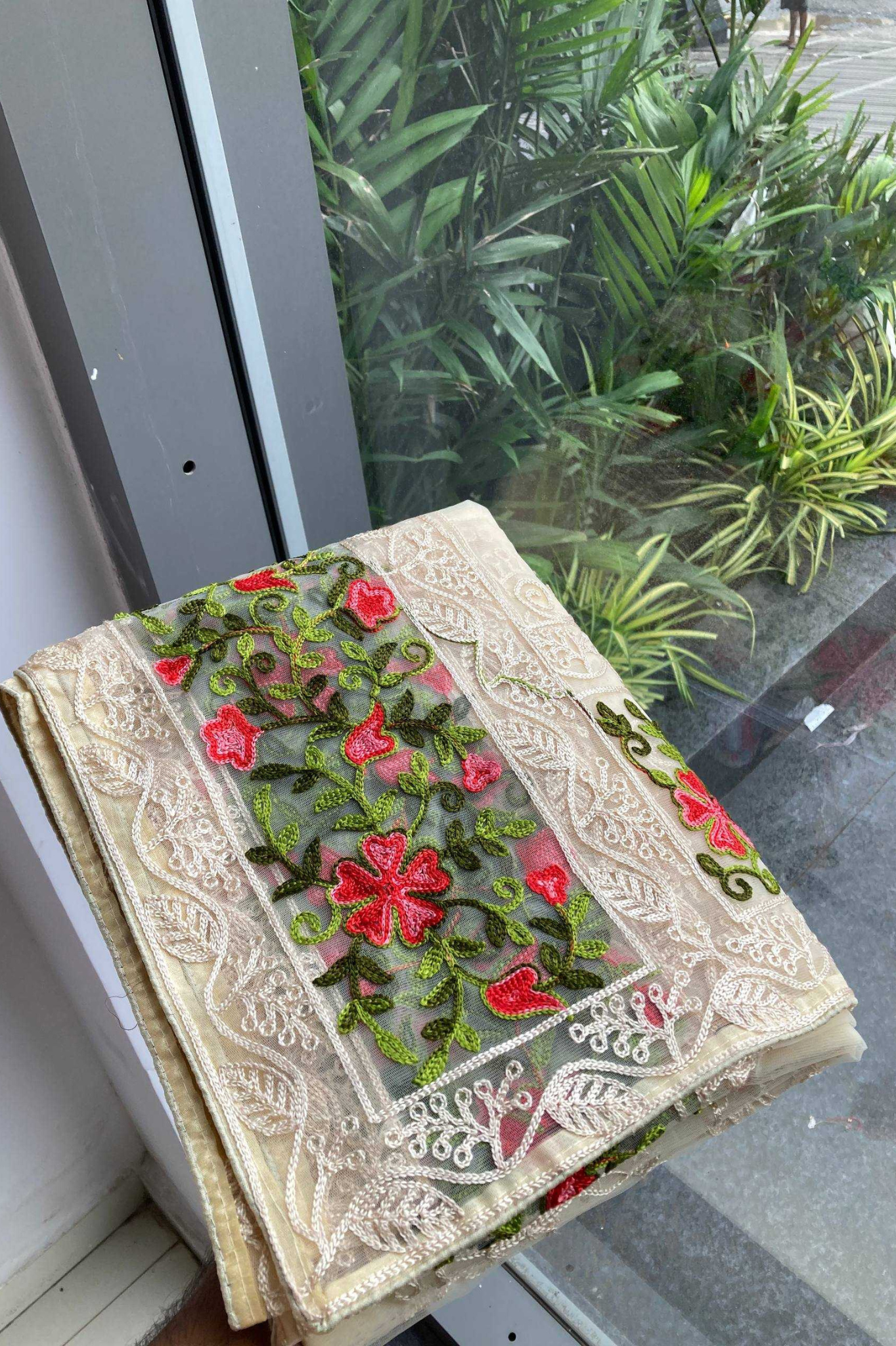Work: C-Pallu Chikankari Embroidery with Floral Lace Border