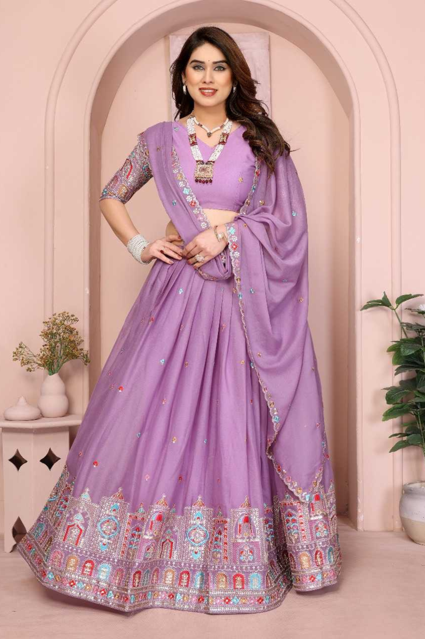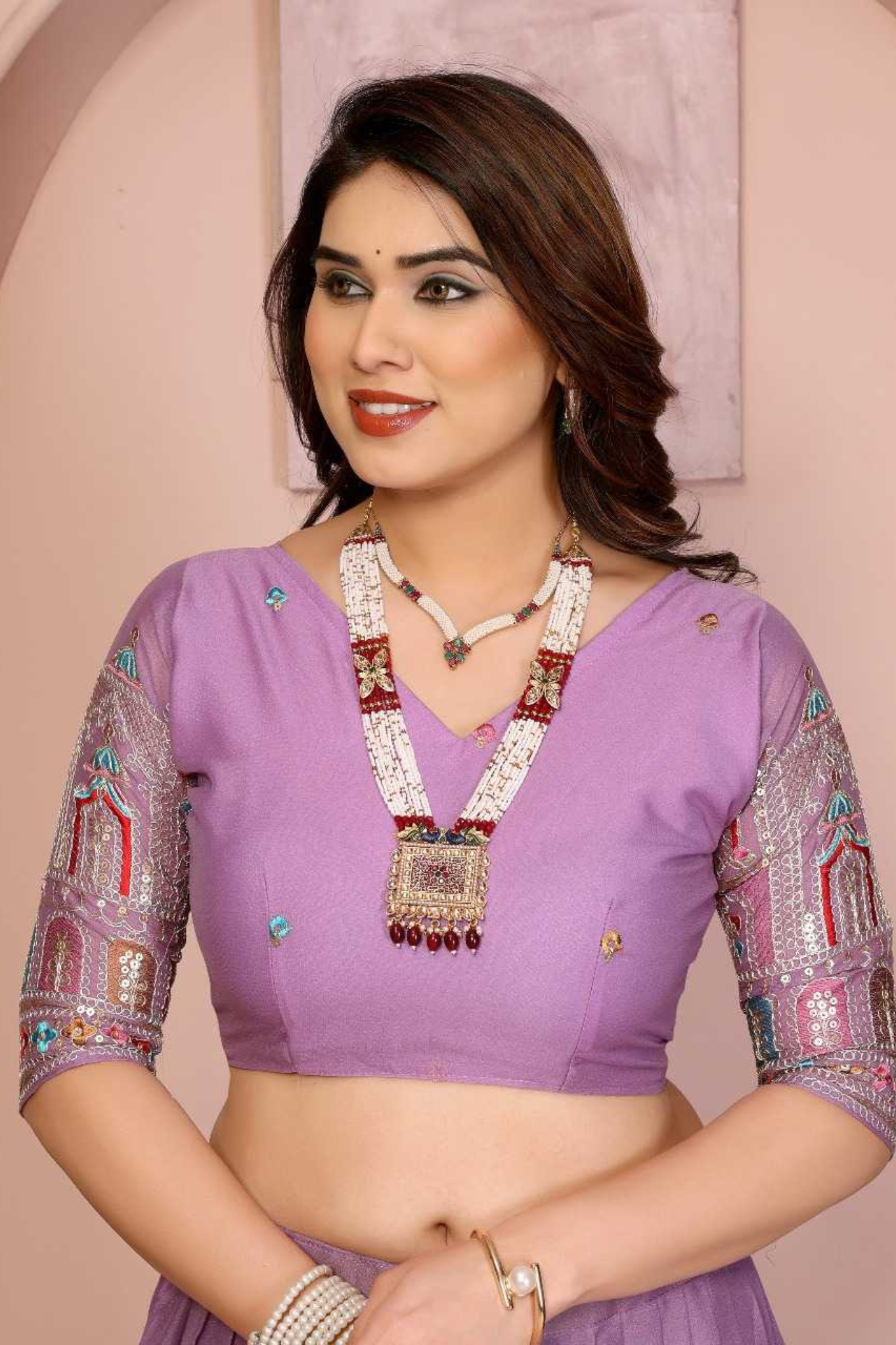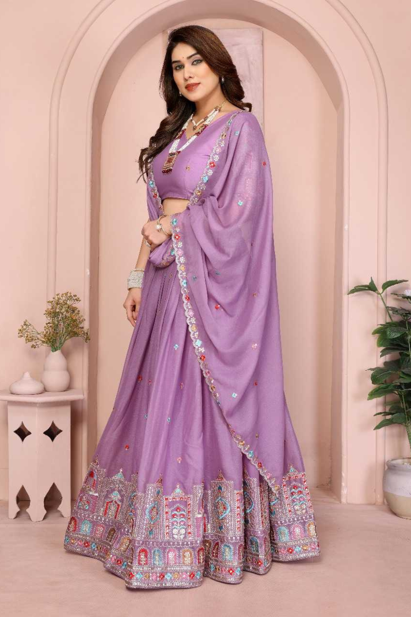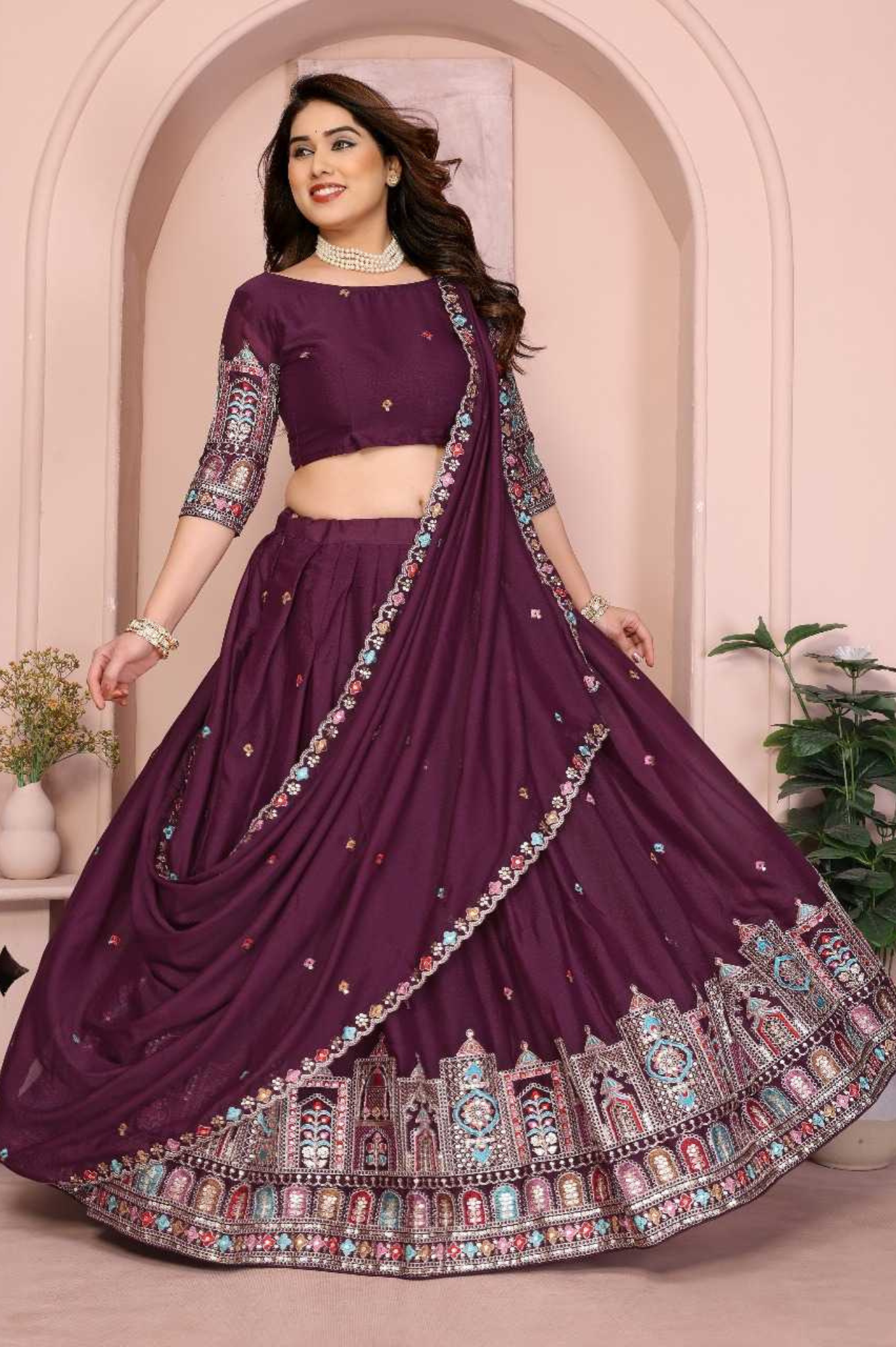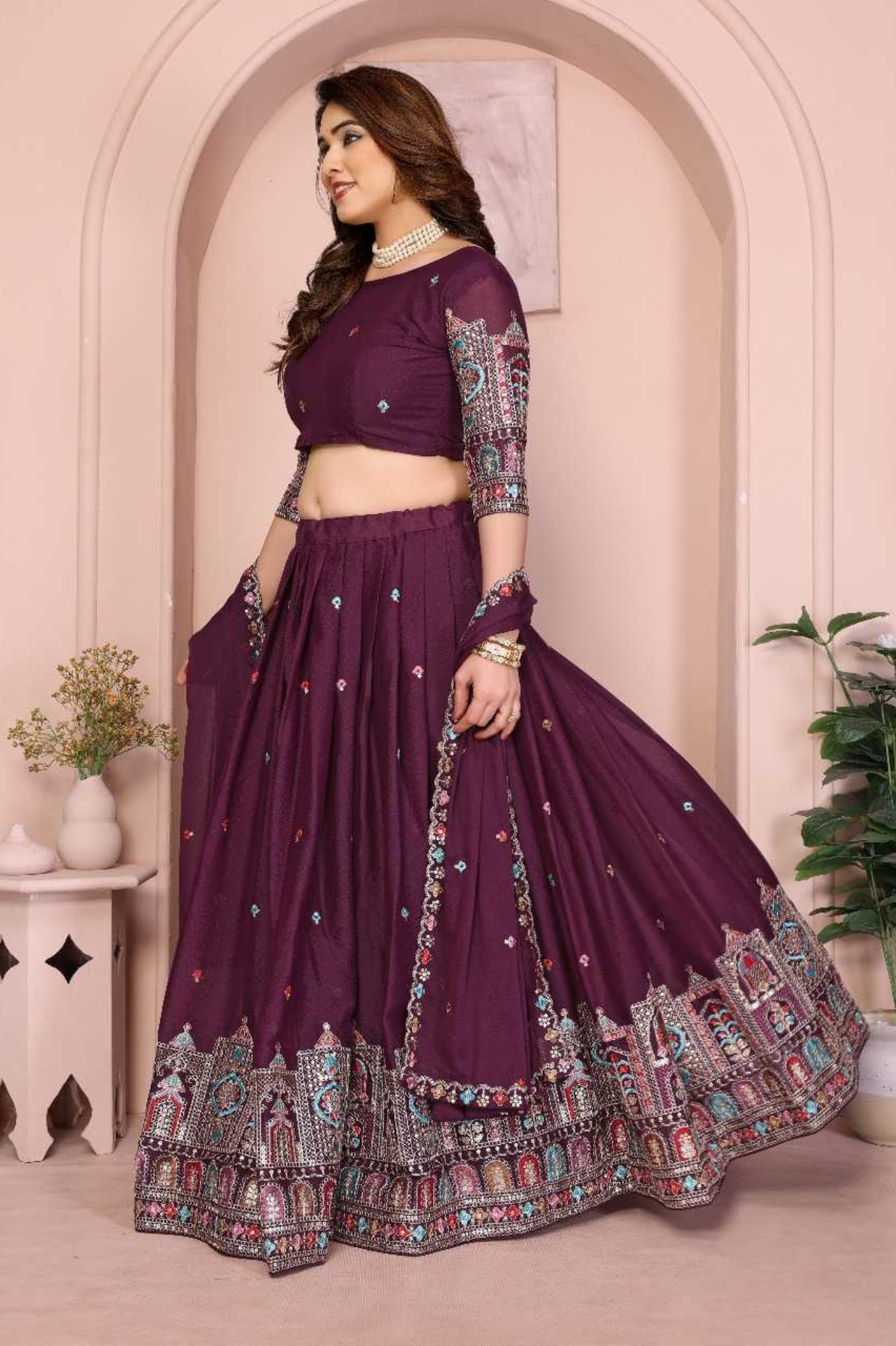 Step into elegance with this Star Georgette lehenga set in a majestic plum shade. The lehenga is adorned with exquisite embroidery and intricate patterns along the hemline, giving it a royal and festive vibe. The matching blouse crafted in Star Georgette features complementing embroidery for a refined look, while the dupatta in the same fabric comes with a delicately embroidered border, completing the ensemble with grace.