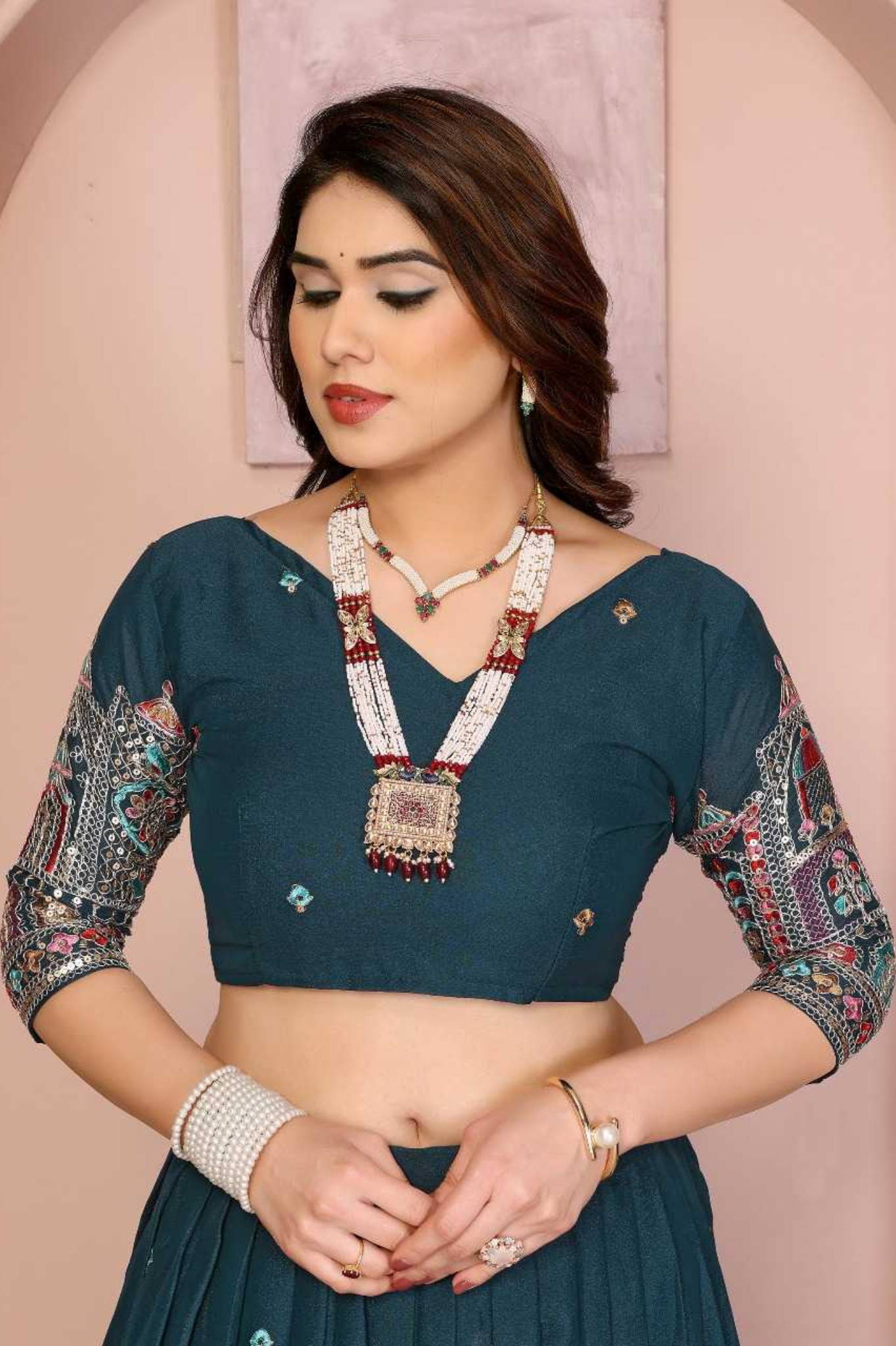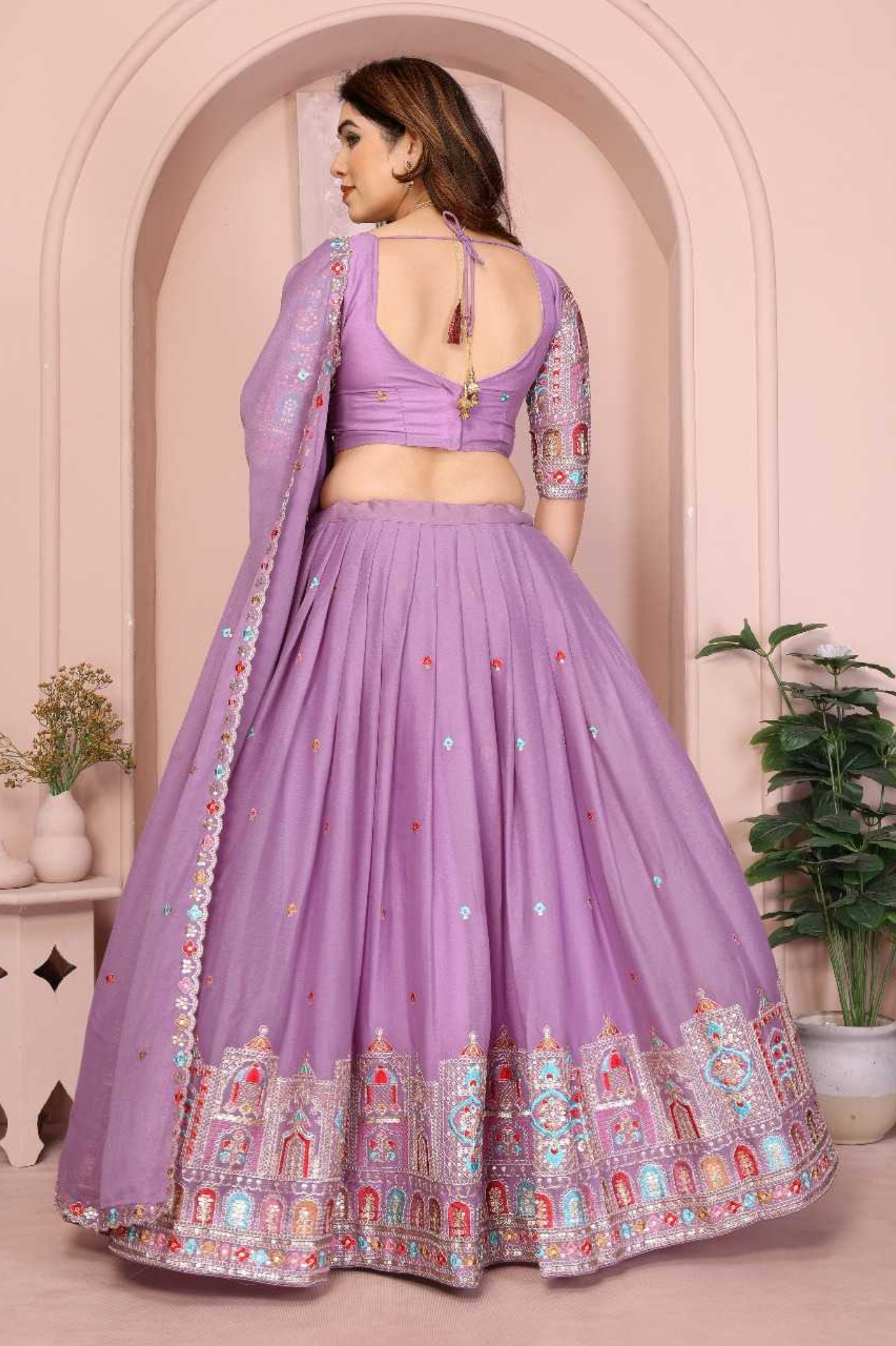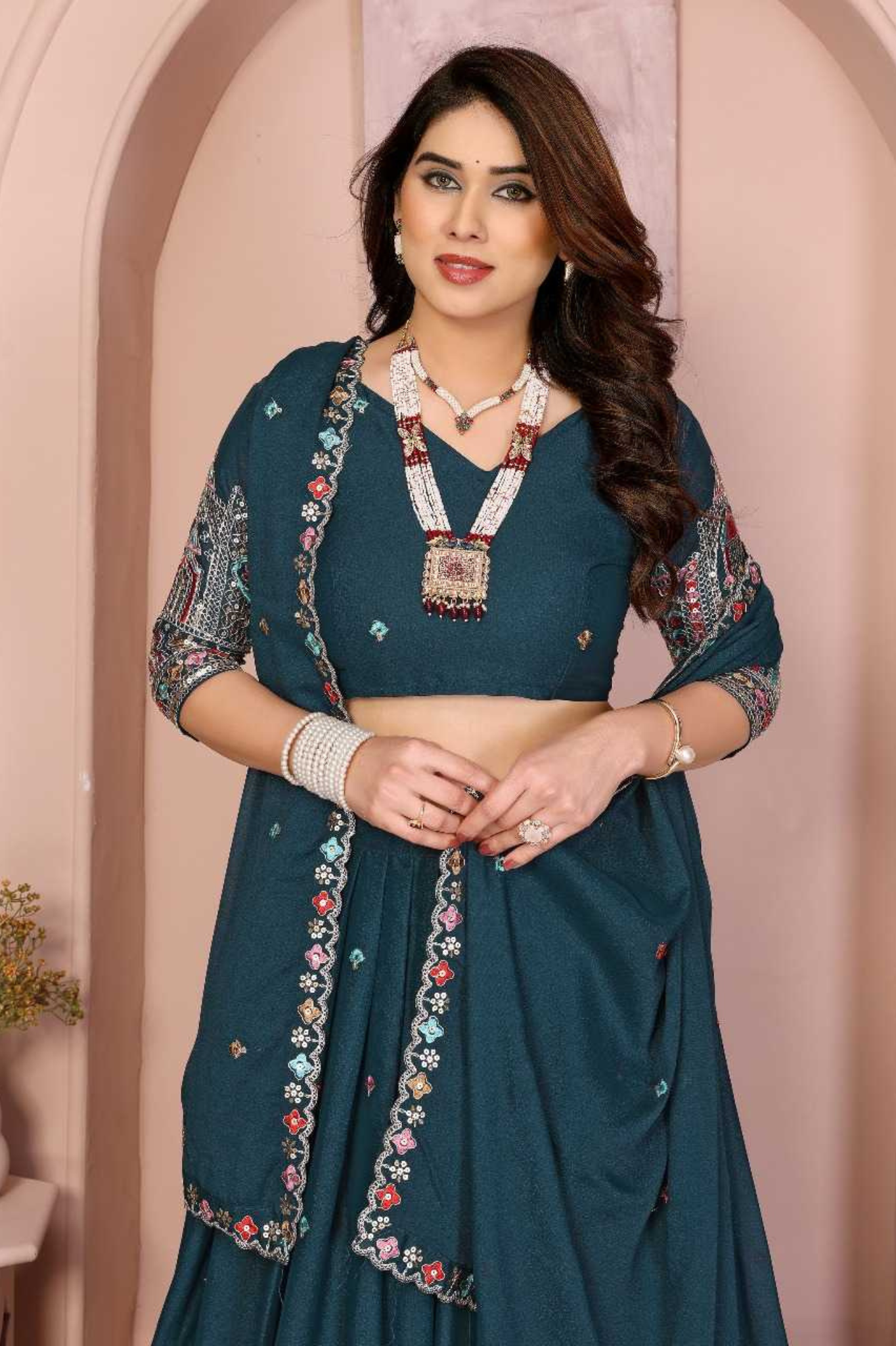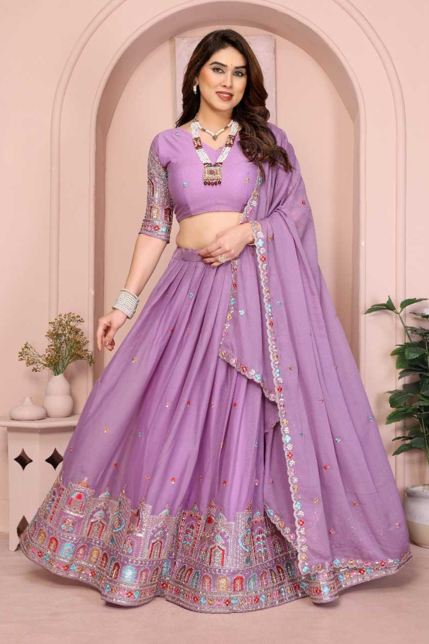 Step into elegance with this Star Georgette lehenga set in a majestic plum shade. The lehenga is adorned with exquisite embroidery and intricate patterns along the hemline, giving it a royal and festive vibe. The matching blouse crafted in Star Georgette features complementing embroidery for a refined look, while the dupatta in the same fabric comes with a delicately embroidered border, completing the ensemble with grace.