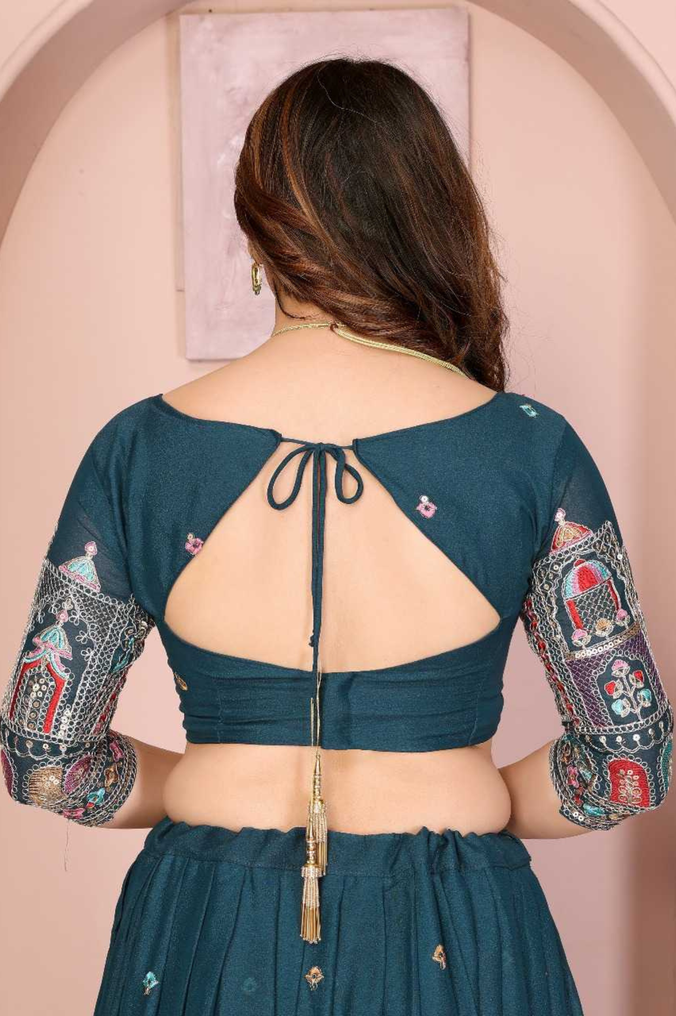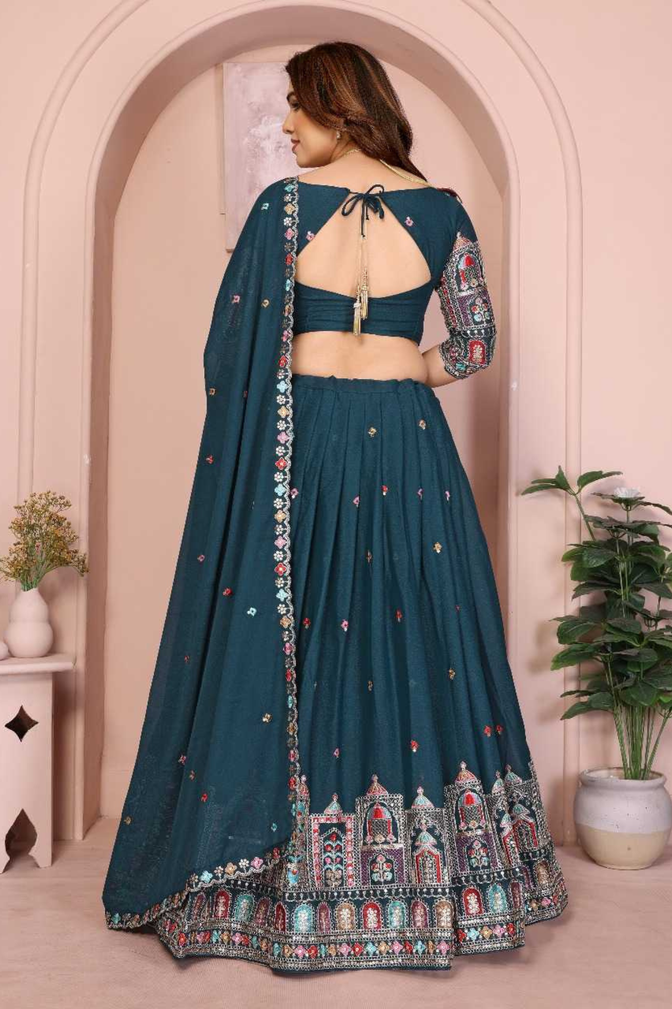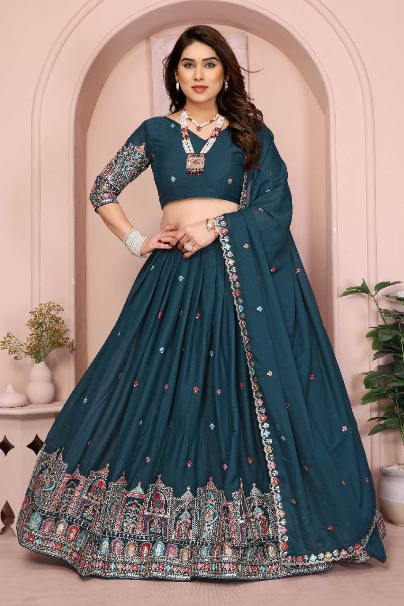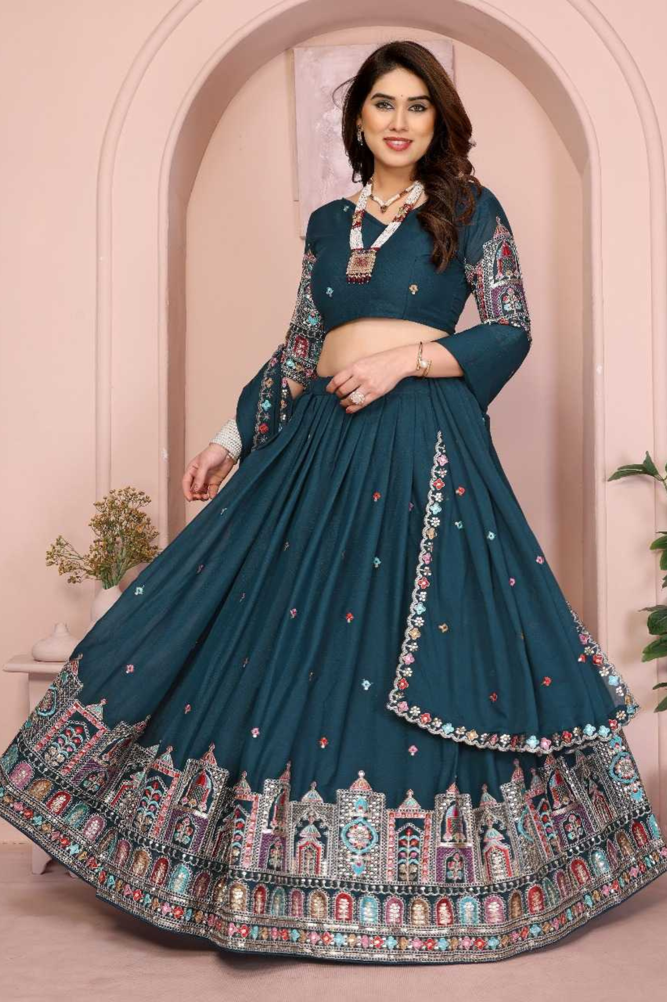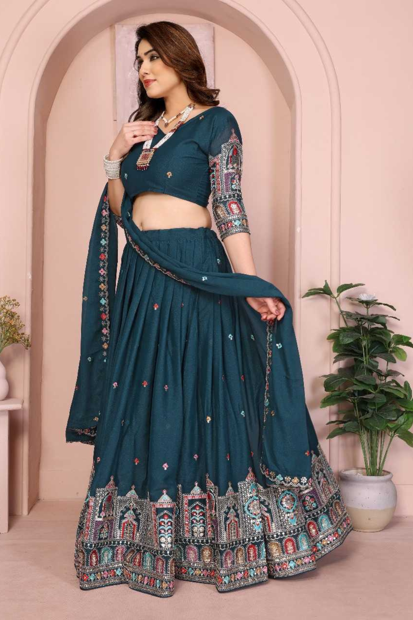 Step into elegance with this Star Georgette lehenga set in a majestic plum shade. The lehenga is adorned with exquisite embroidery and intricate patterns along the hemline, giving it a royal and festive vibe. The matching blouse crafted in Star Georgette features complementing embroidery for a refined look, while the dupatta in the same fabric comes with a delicately embroidered border, completing the ensemble with grace.