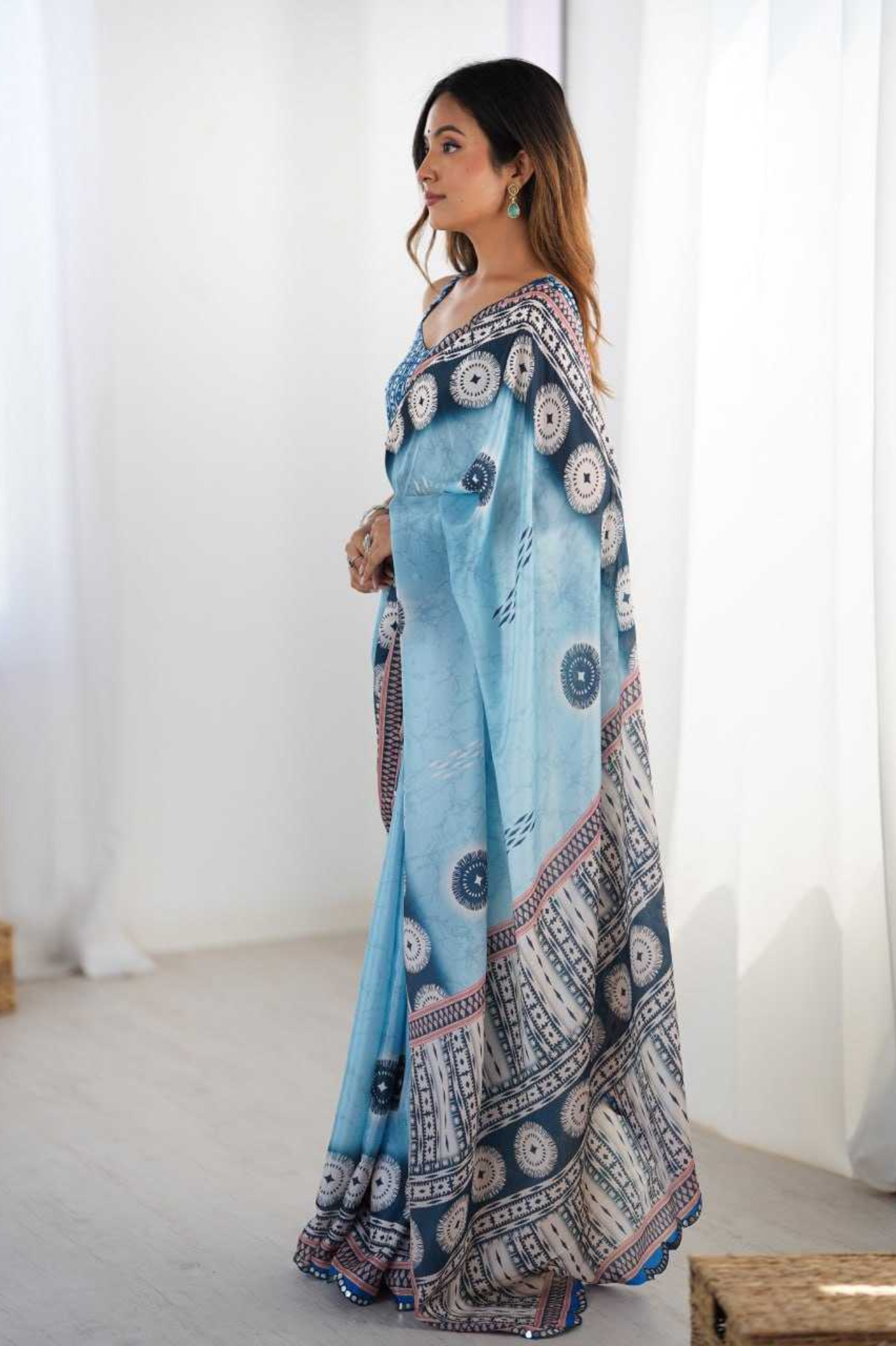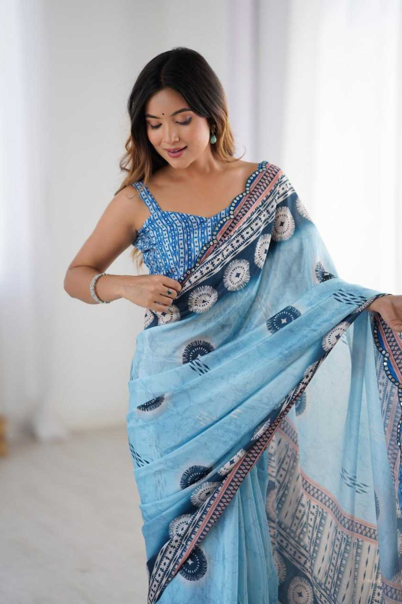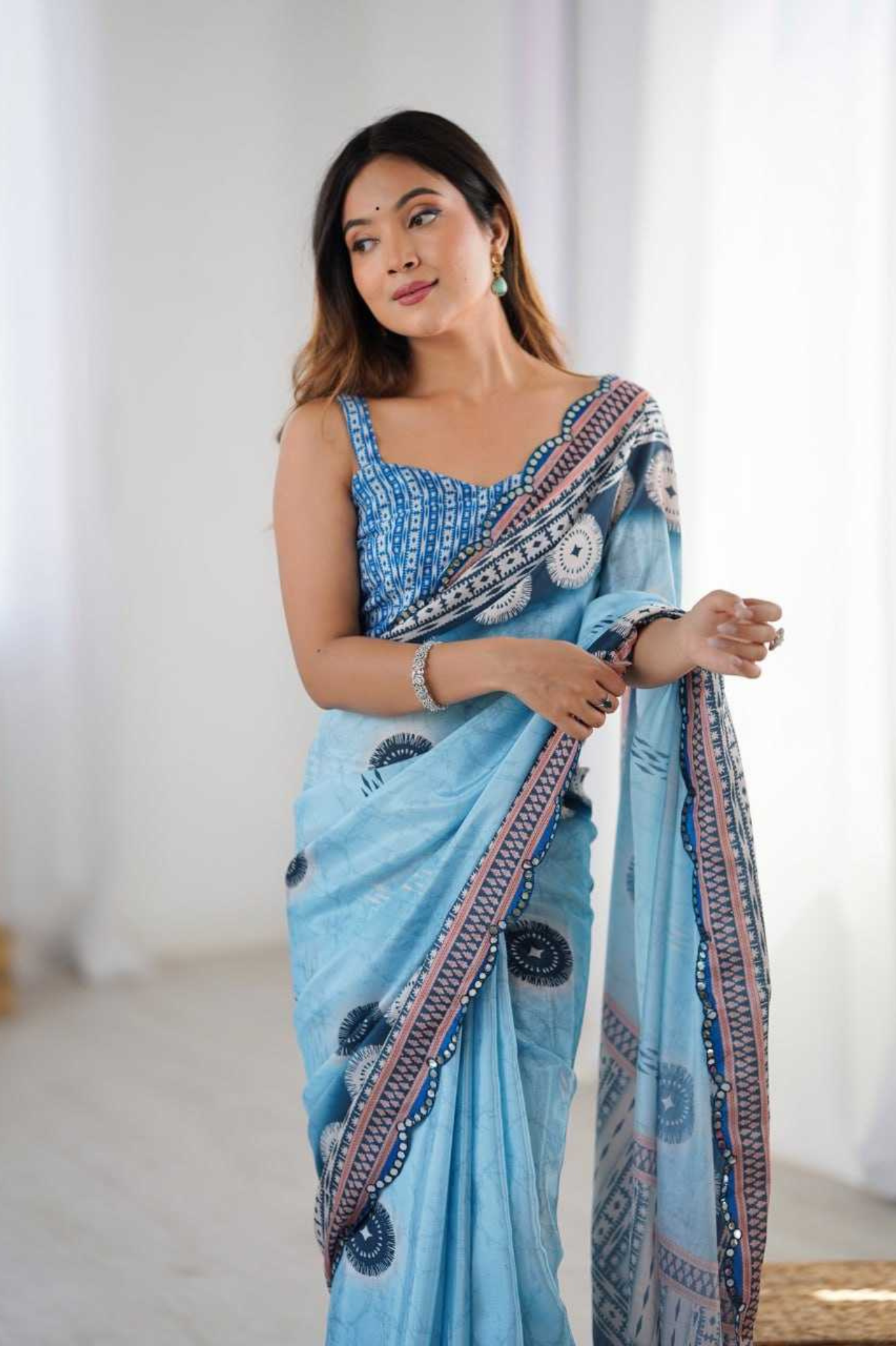 Elevate your festive wardrobe with this heavy Chinnon saree in a refreshing sky blue shade. Featuring intricate traditional print work and a beautifully detailed Kutchi mirror lace border, this saree blends cultural charm with modern elegance.