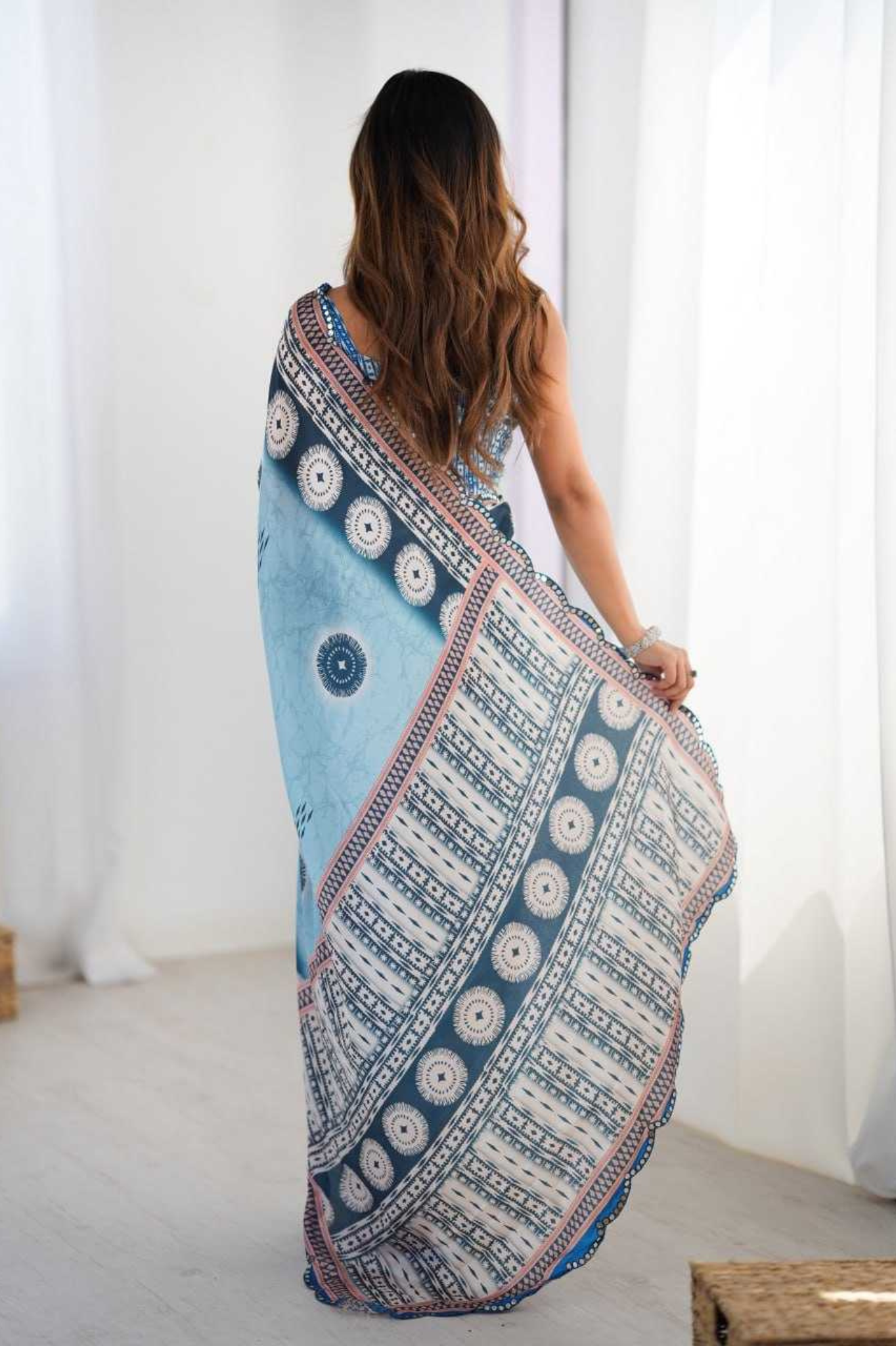 Sky Blue Chinnon Saree with Kutchi Mirror Lace Border