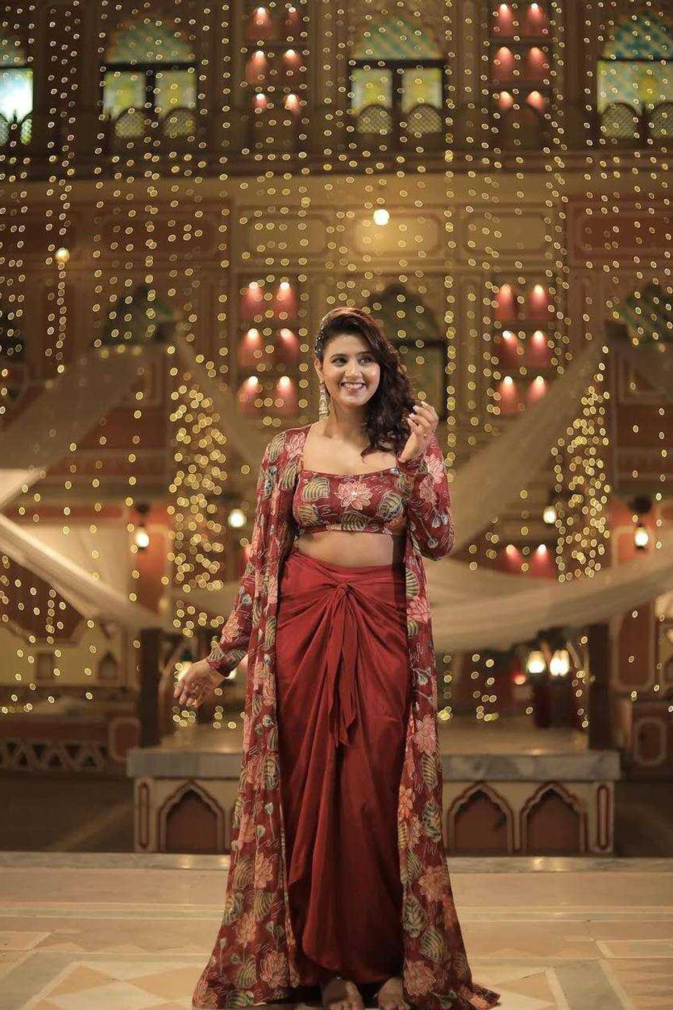 Turn heads at parties and festive occasions with this chic three-piece Indo-Western set in rich maroon tones. The set features a printed crepe silk tube blouse with micro inner lining, a stylish draped knotted skirt in crepe silk, and a flowy long shrug crafted from printed crepe silk. The fusion of modern draping with traditional prints makes this outfit a perfect pick for weddings, receptions, and cocktail events.