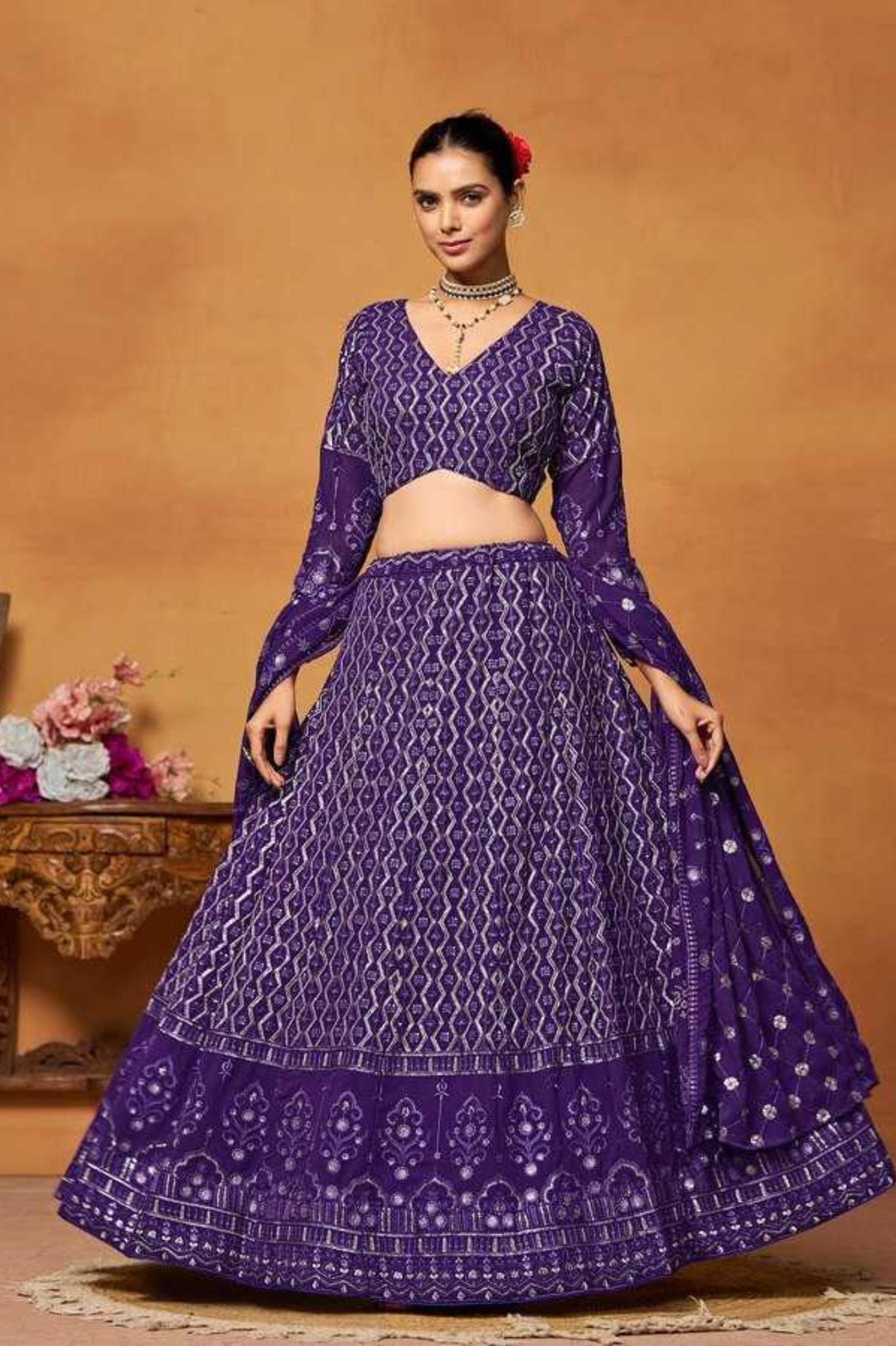 Elevate your festive charm with this Purple Faux Georgette Lehenga Set, designed with intricate embroidery for a regal look. The lehenga, dupatta, and bottom are all crafted from premium faux georgette fabric, ensuring lightweight elegance and effortless drape.