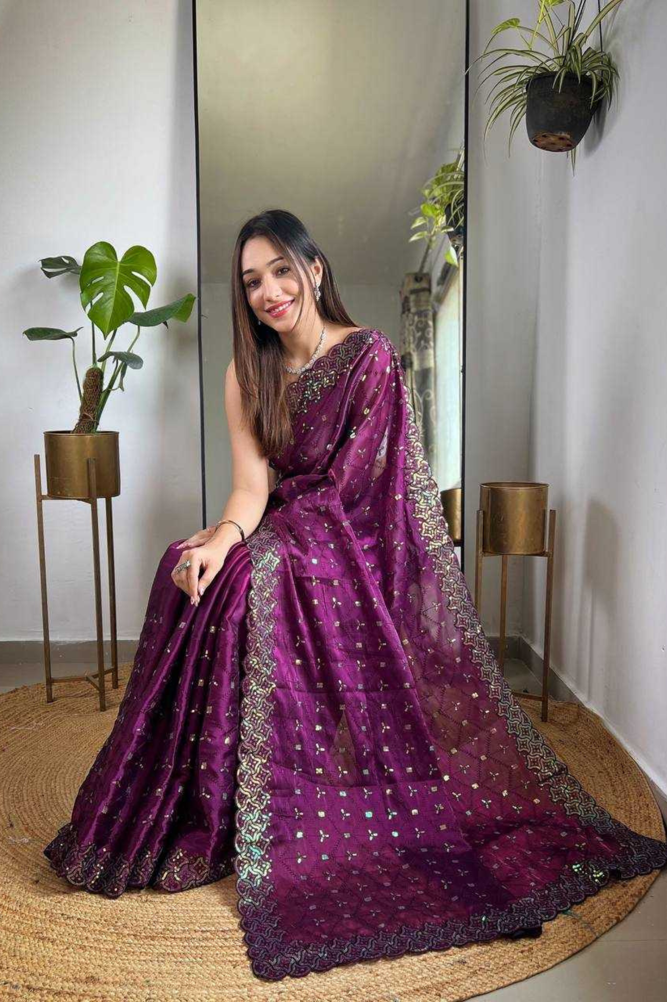 Elevate your festive charm with this elegant wine Soft Geemichu Silk Saree, crafted with intricate embroidery and delicate sequence-thread work throughout the body and border. The cutwork detailing adds a luxurious touch, making it a perfect pick for weddings, parties, and celebrations.