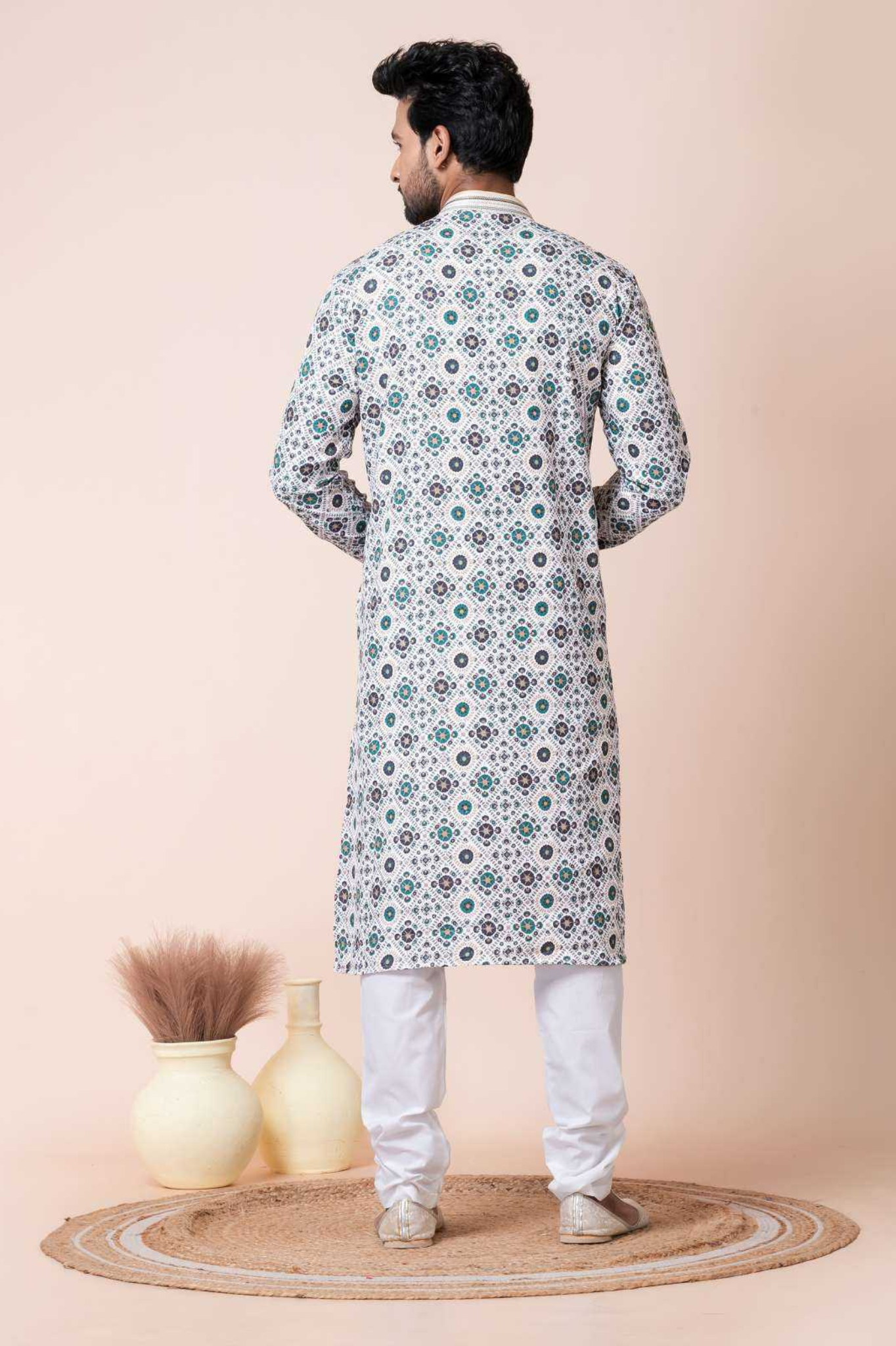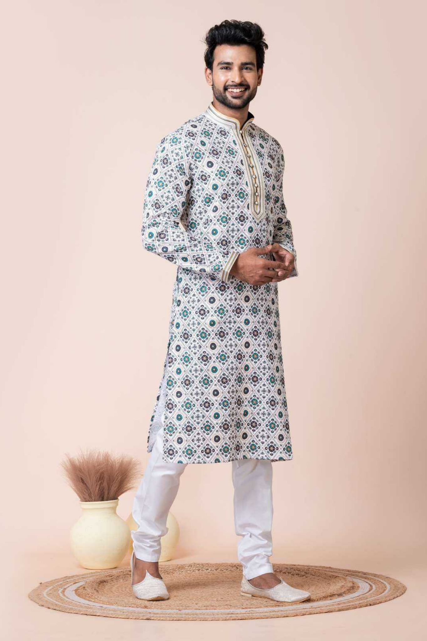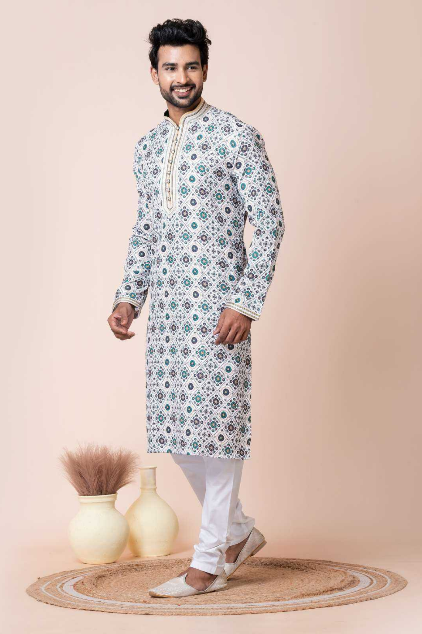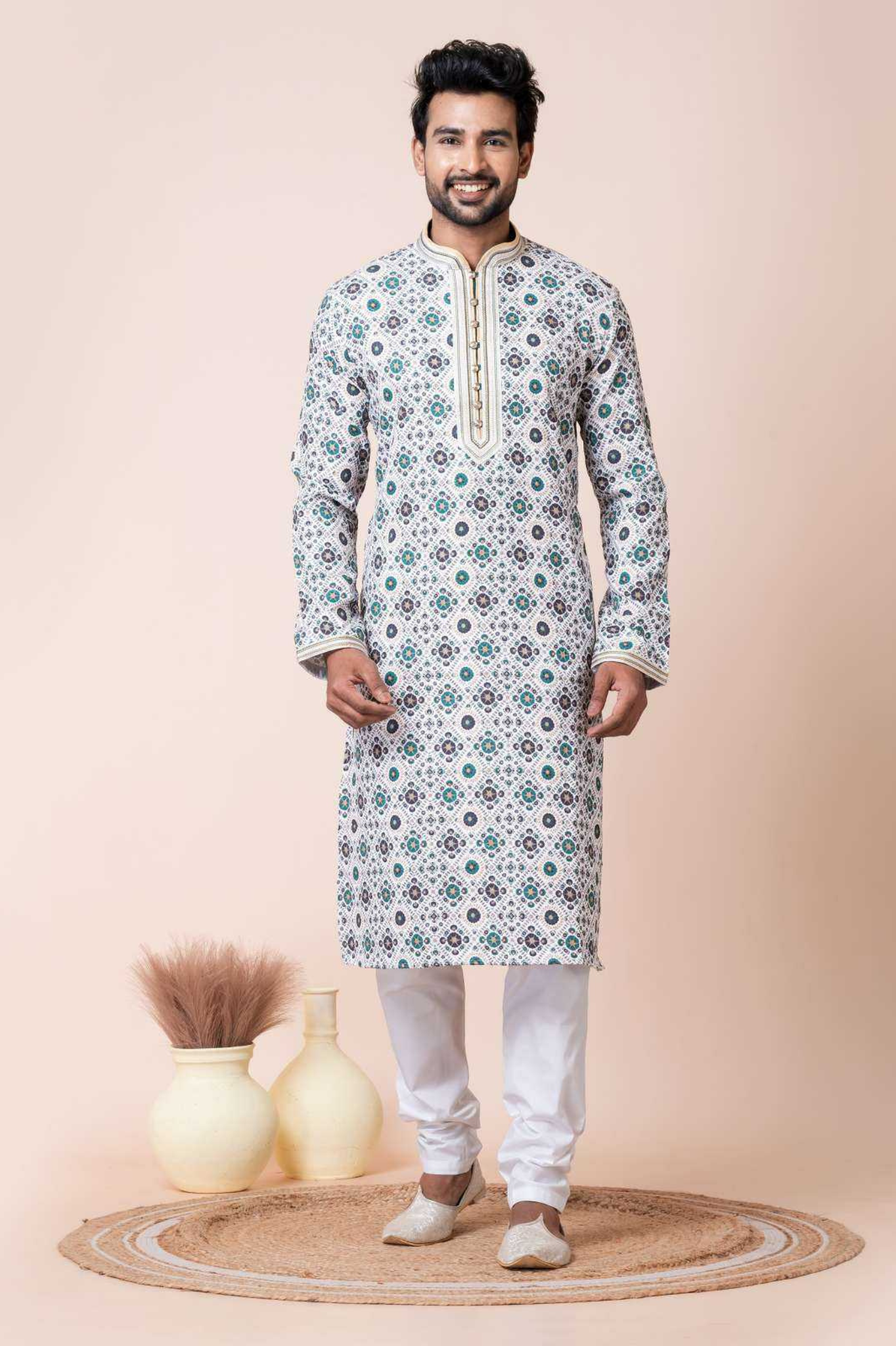 Upgrade your ethnic wardrobe with this men’s kurta crafted from a durable mono cotton-polyester fabric. Featuring a fresh all-over geometric floral print in green and grey tones on a white base, this kurta brings a modern twist to traditional attire. The highlighted placket and collar detailing add extra sophistication, making it a perfect pick for festive events, family gatherings, and celebrations. Paired with a white pajama for a complete, graceful look.