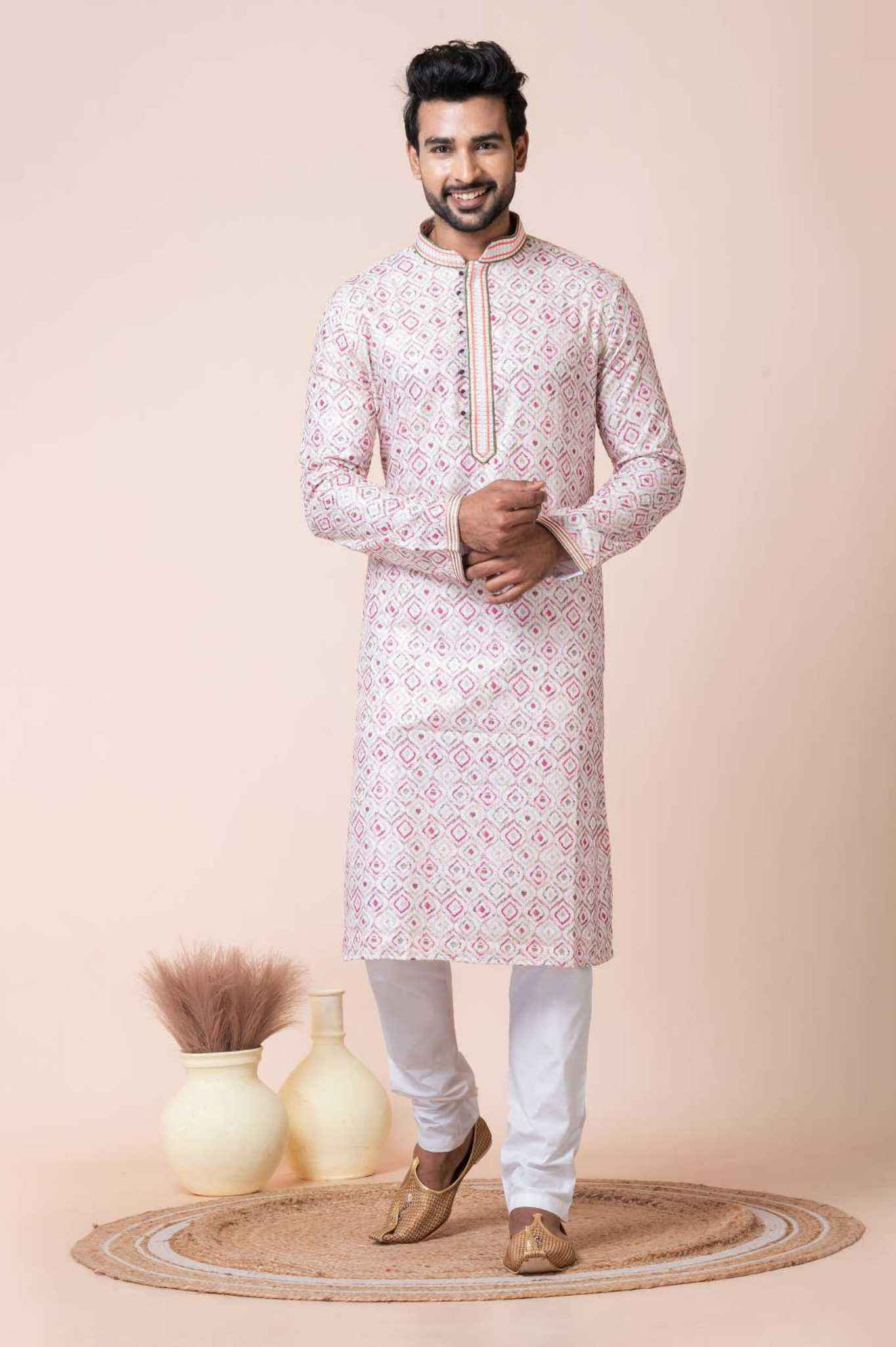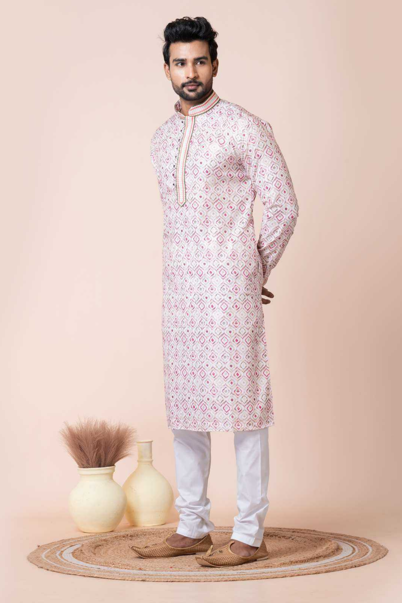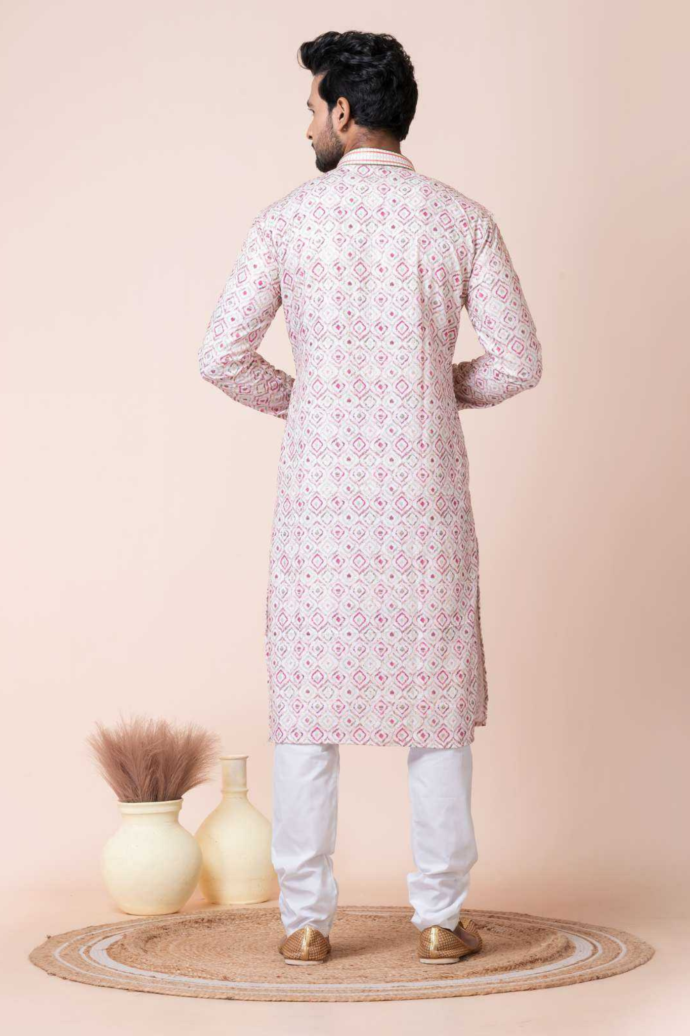 Upgrade your ethnic wardrobe with this men’s kurta crafted from a durable mono cotton-polyester blend. Featuring an elegant all-over geometric diamond print in subtle pink and white shades, this kurta adds a refined charm to festive and casual occasions. The highlighted placket and collar design lend a striking finish, making it a versatile choice for both daytime and evening wear. Paired with a classic white pajama for a complete ethnic look.