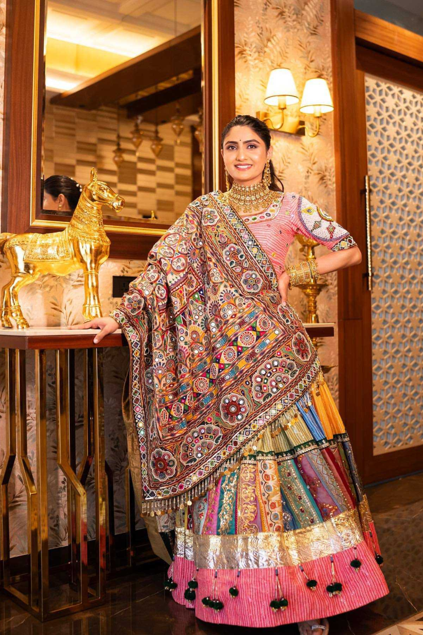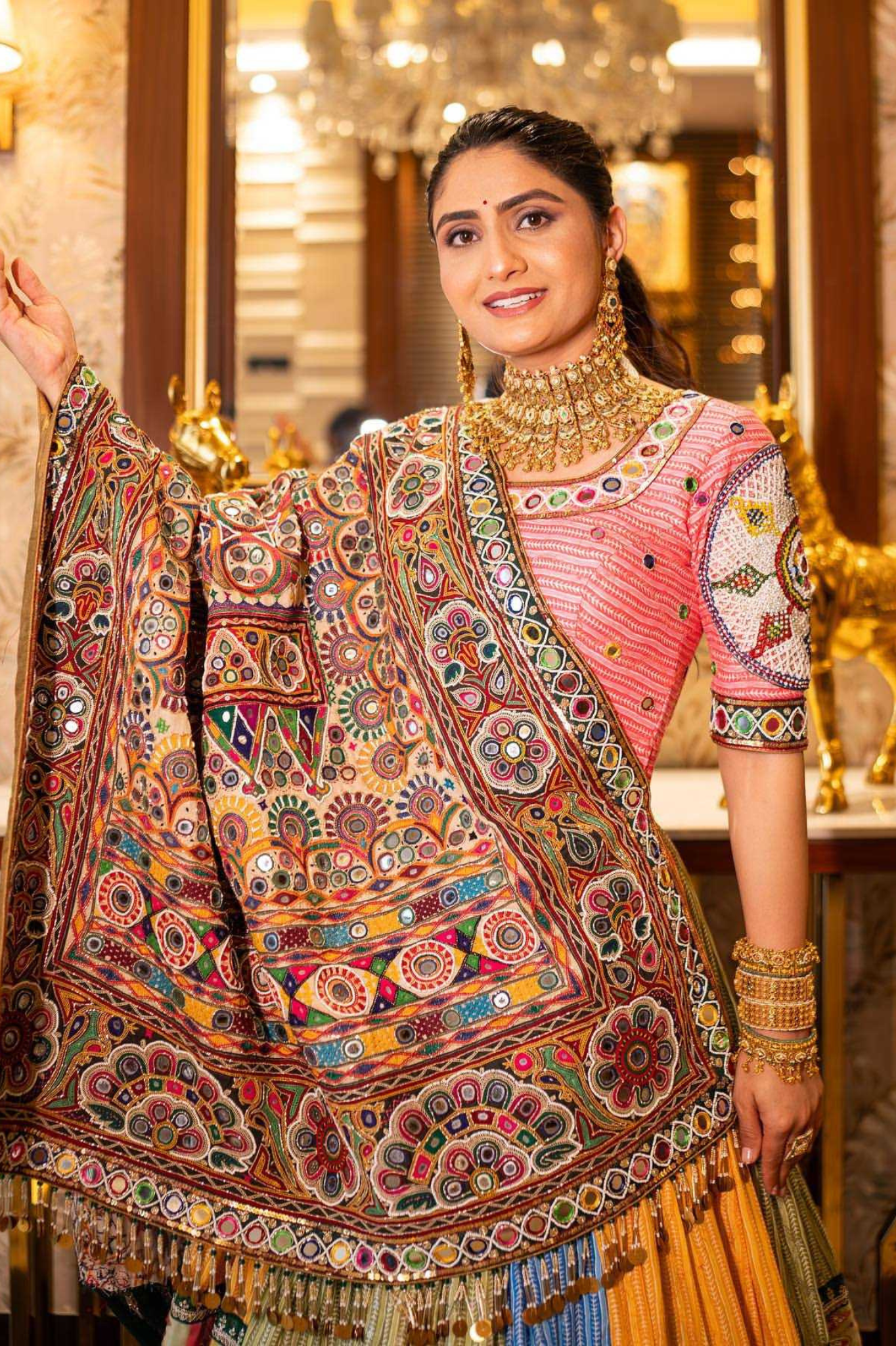 Elevate your festive look with this stunning heavy muslin cotton lehenga, beautifully designed with digital prints, real mirror work, and lampi lace detailing. It comes fully stitched up to size XXL (44) with a canvas patta border, a graceful 4-meter flair, and a comfortable micro inner. Paired with an unstitched muslin cotton choli featuring digital print and real mirror work for custom fitting, and a 2-meter muslin cotton dupatta adorned with digital prints, mirror work, and delicate handwork lace. This ensemble is a perfect blend of elegance and tradition, making it ideal for Navratri, weddings, and festive occasions.