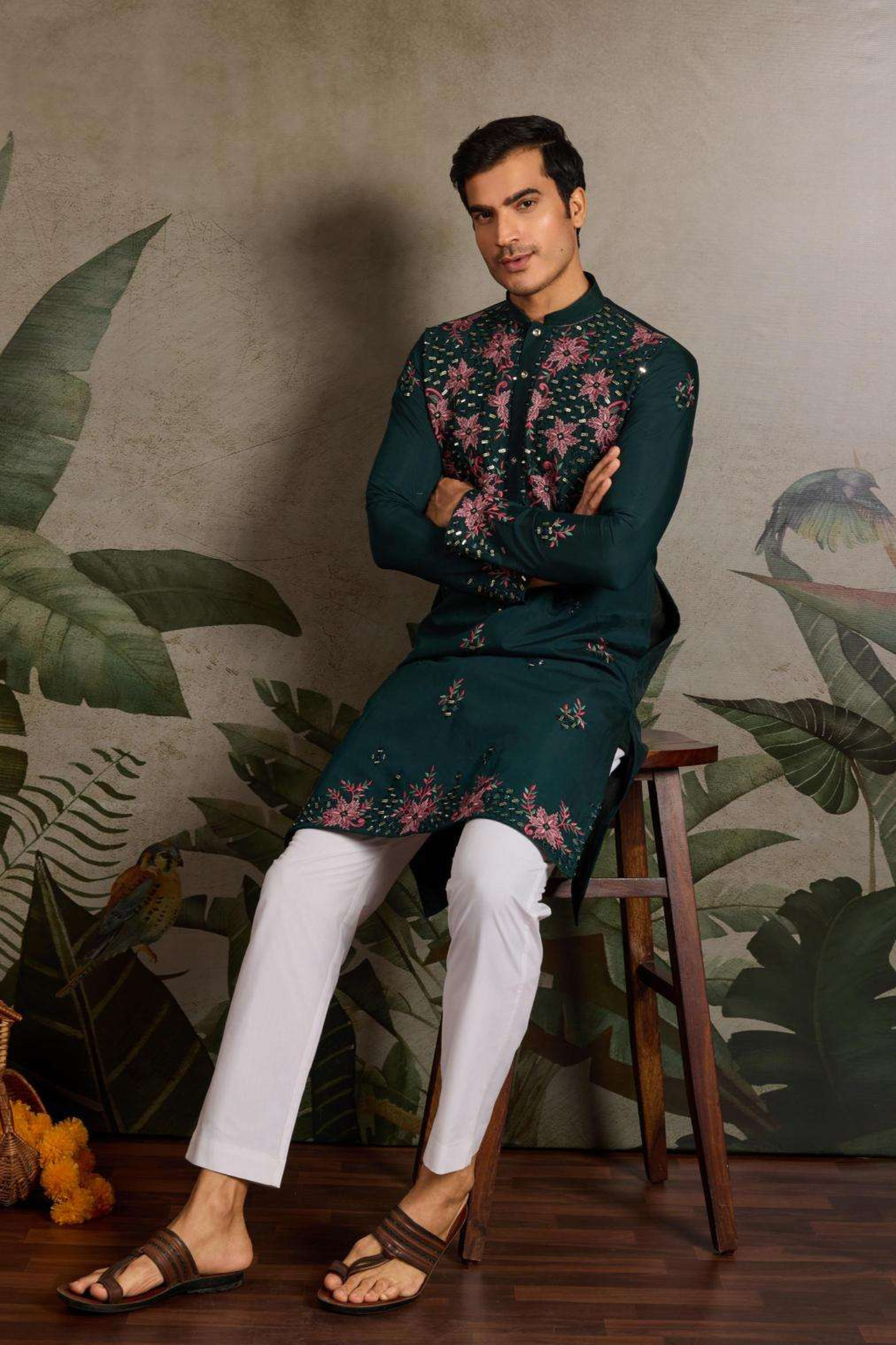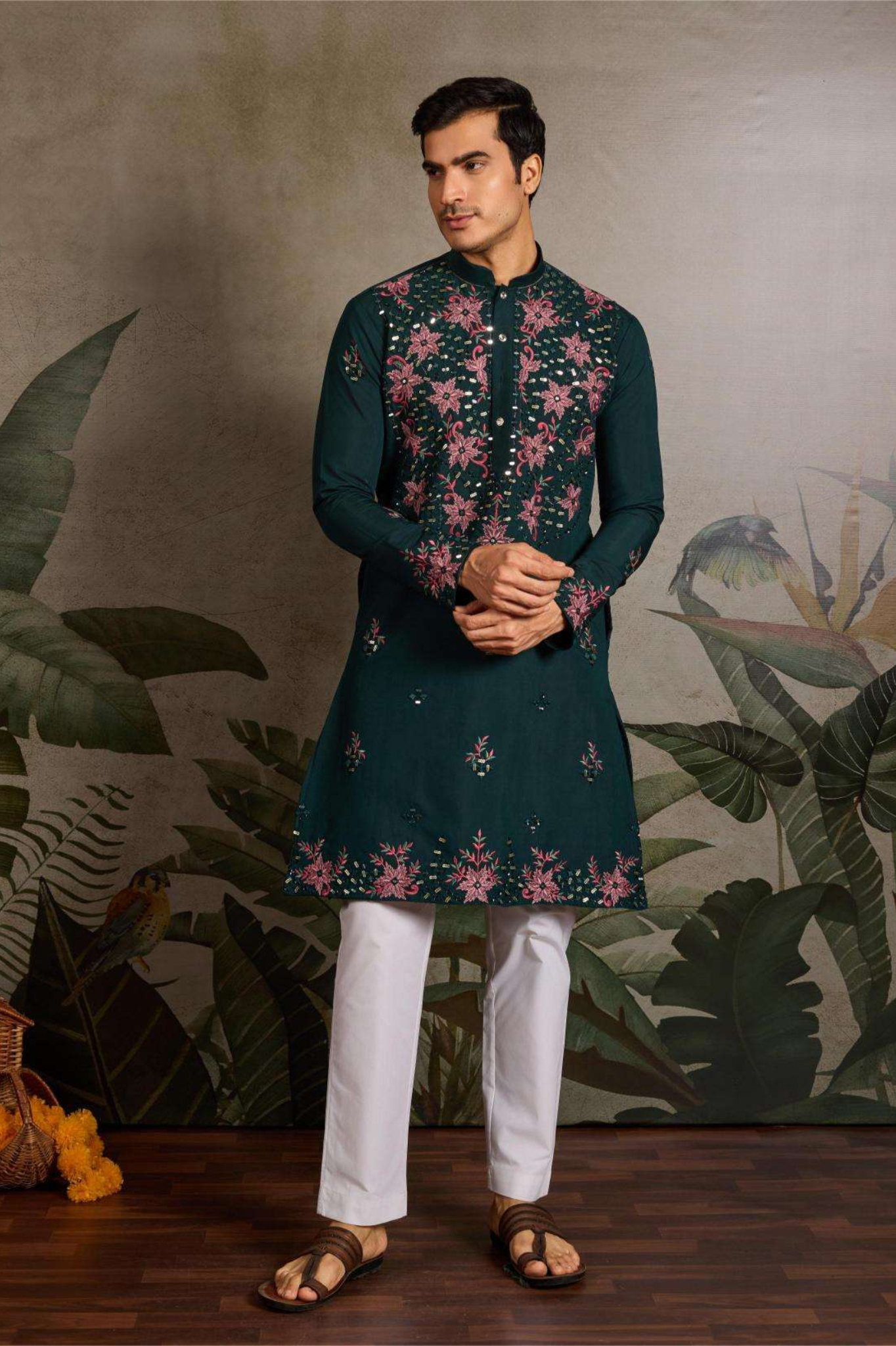 This Bottle Neck Kurta Set is crafted for elegance and grandeur, featuring exquisite embroidery in floral patterns on the front side and sleeves with lace work (0.8 MTR) and detailed embroidery on the back side with sleeves (1.1 MTR). Paired with a crisp white pant, this outfit brings a perfect balance of regal style and modern sophistication.
