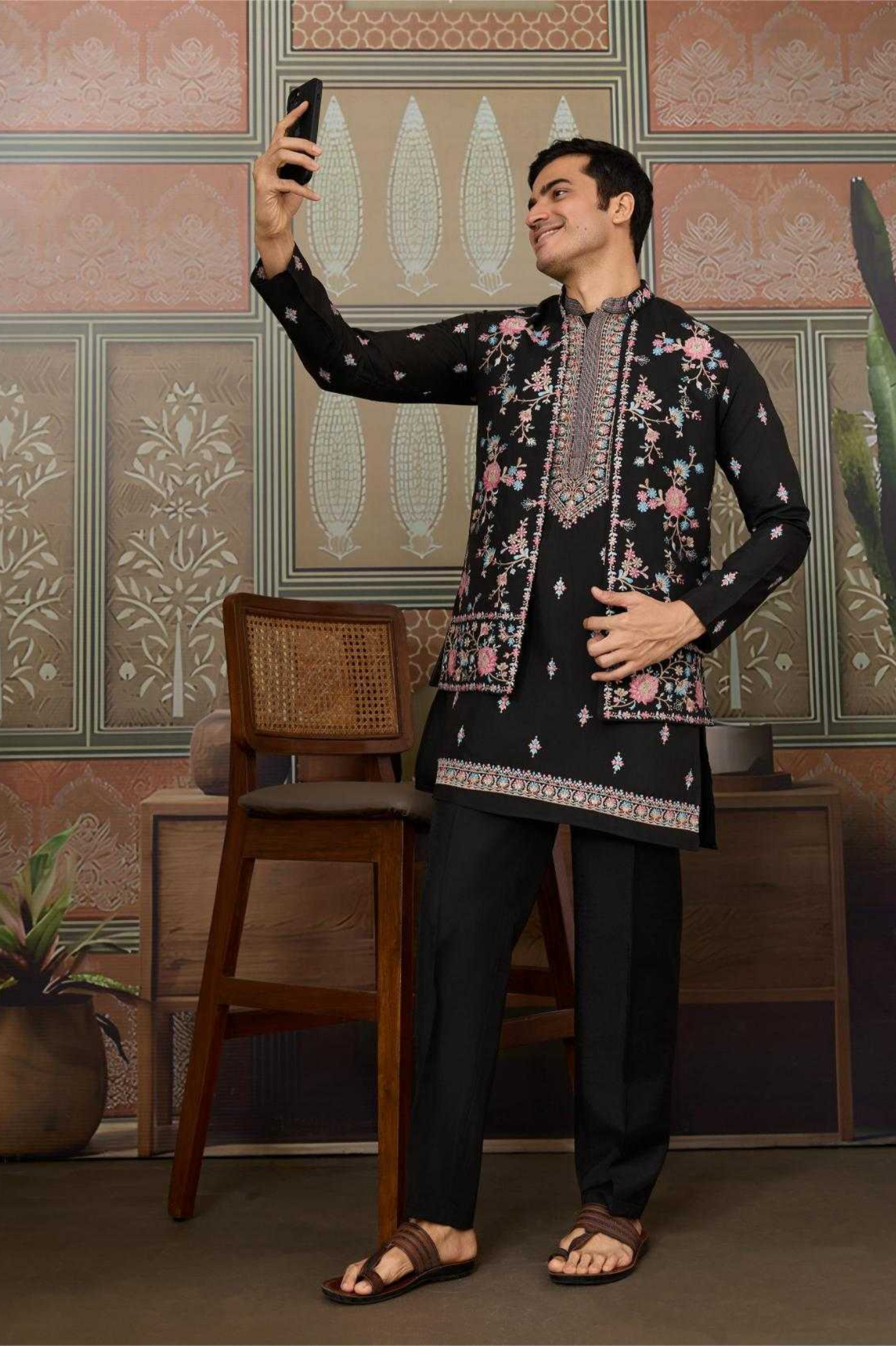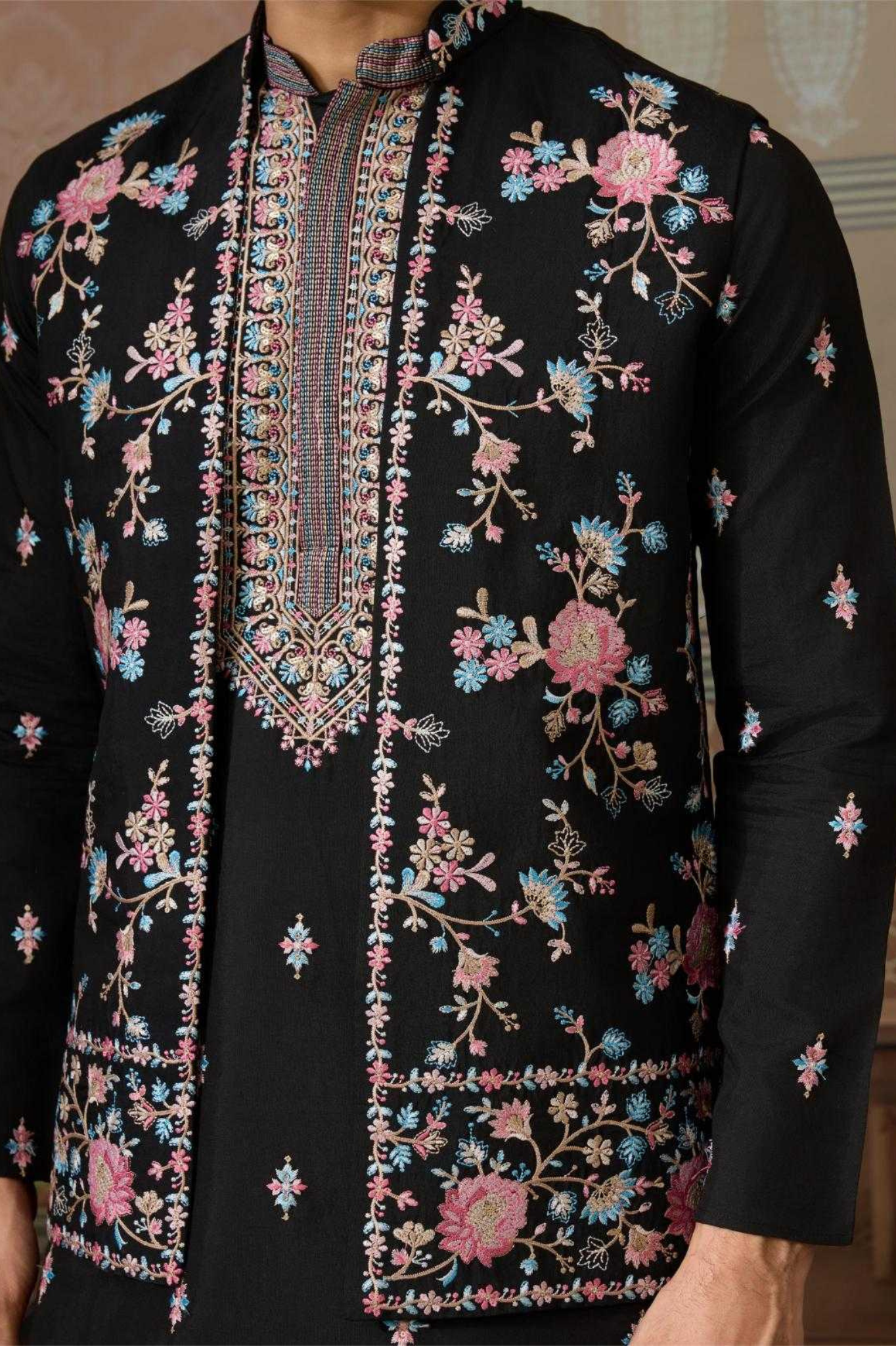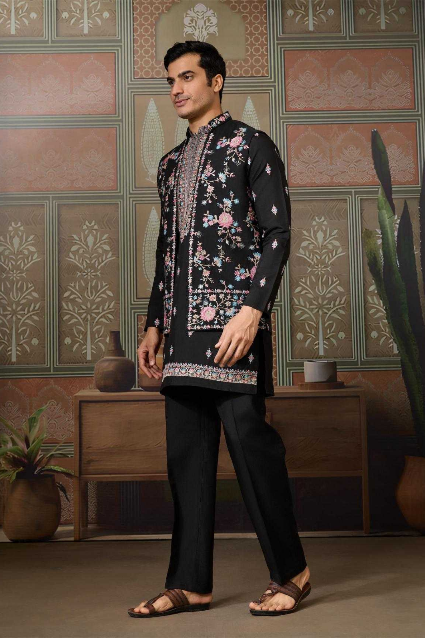 A regal 3-piece men’s ethnic set crafted for festive elegance. The kurta is designed in rich navy blue fabric, detailed...