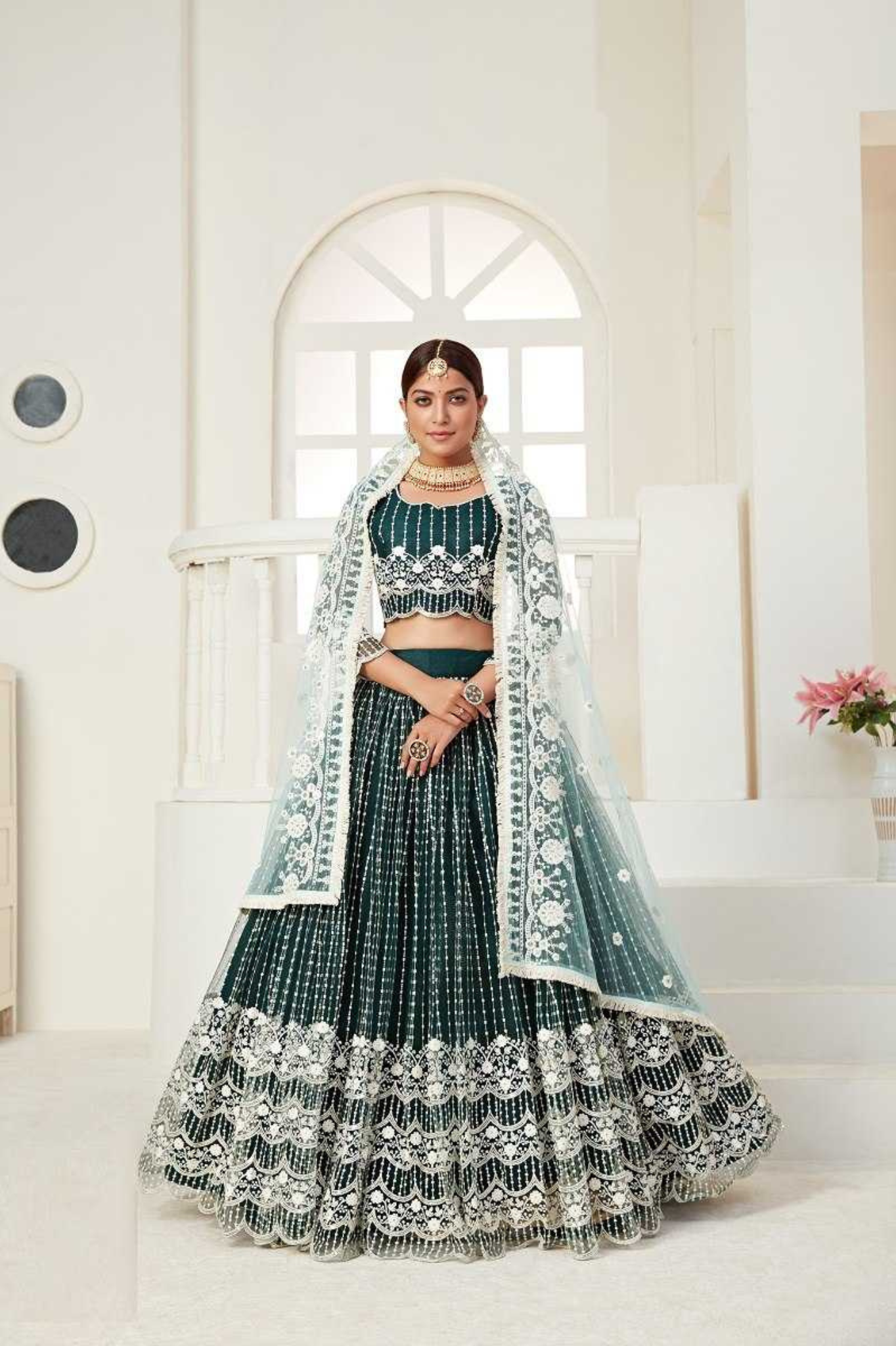 Grace your special moments with this elegant green butterfly net lehenga choli featuring intricate multi-thread and sequin embroidery work. The richly designed lehenga paired with a beautifully crafted butterfly net dupatta makes it a perfect outfit for weddings, receptions, and grand ceremonies. The choli comes with a stylish round neck and sleeves, enhancing its regal appeal.