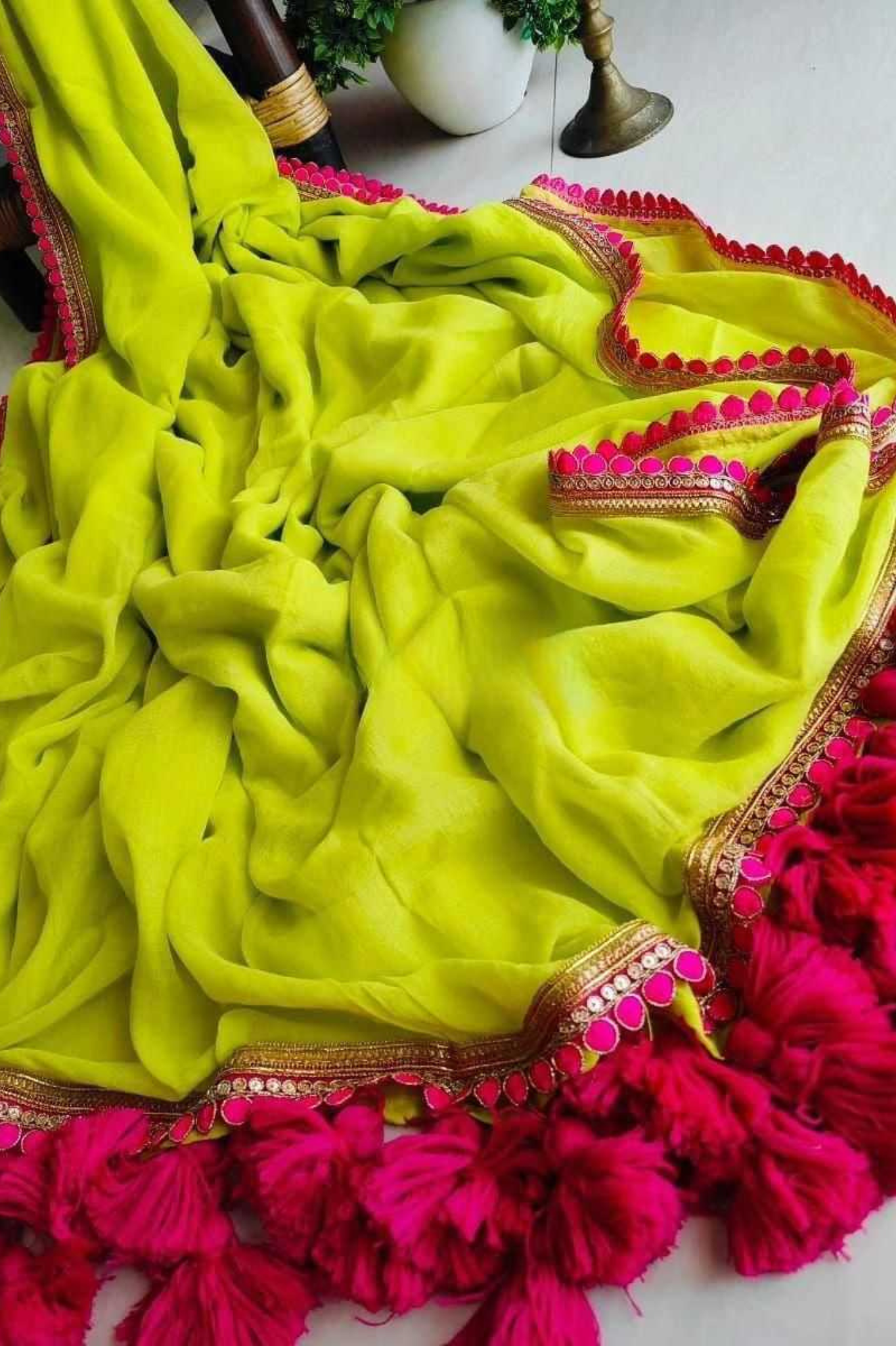 Neon Yellow Georgette Saree with Pink Lace Border & Tassels