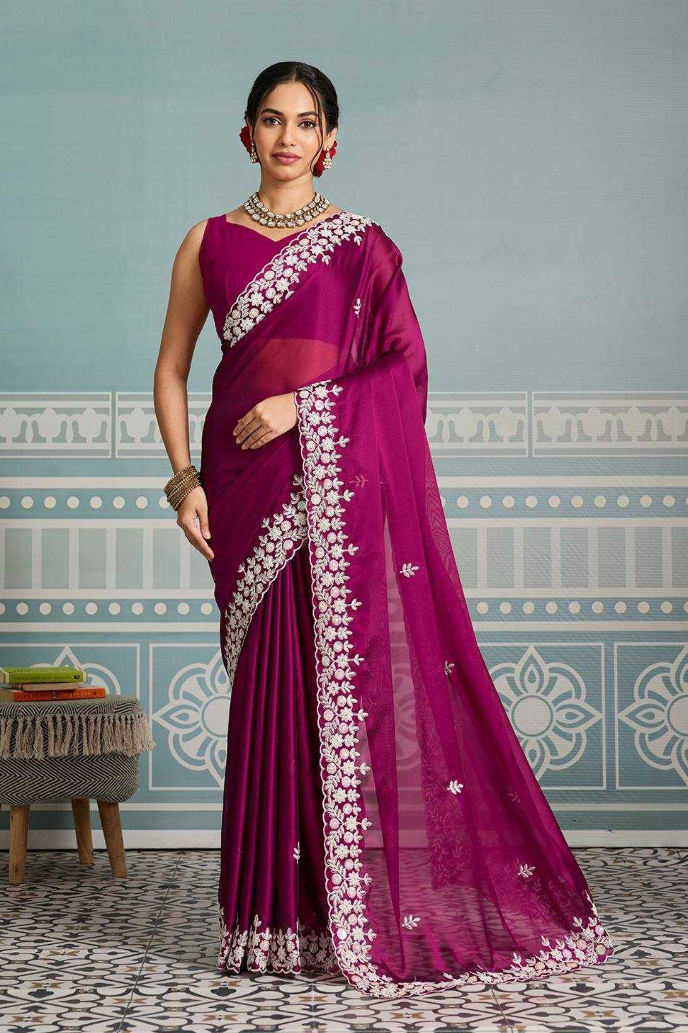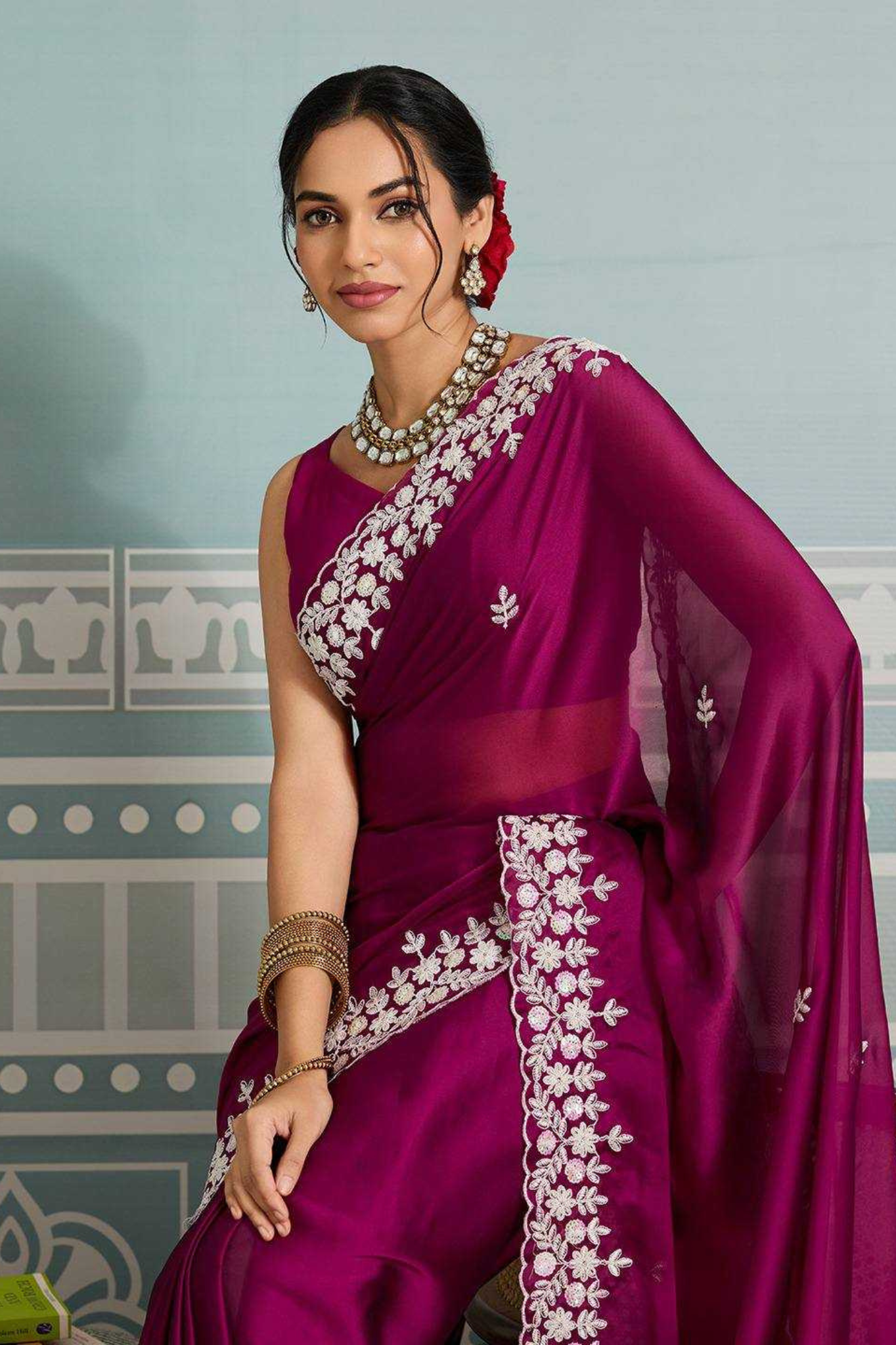 An elegant drape crafted from premium crunchy chiffon, this saree features a graceful scallop design with fine thread embroidery work, making it a timeless addition to your festive and wedding wardrobe. The satin digital print blouse complements the saree beautifully, adding a modern touch...