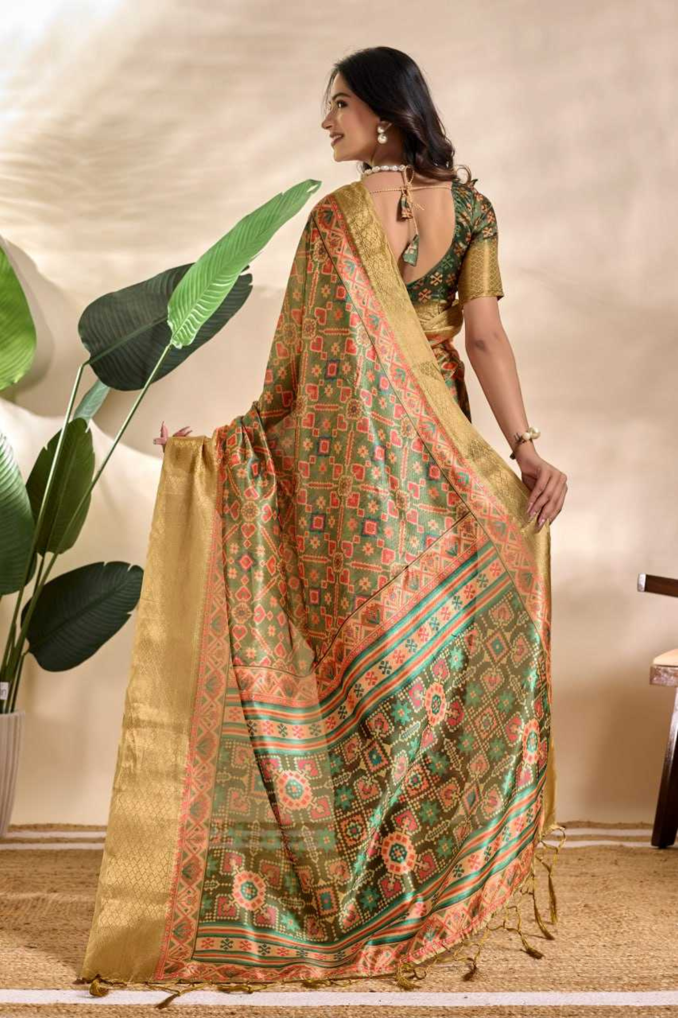 A masterpiece of elegance and tradition, this Patola-inspired soft silk saree features intricate geometric and floral motifs woven in vibrant hues that beautifully complement the rich olive-green base. The luxurious golden zari border and ornate pallu elevate its grandeur, making it a perfect choice for festive and cultural occasions.
