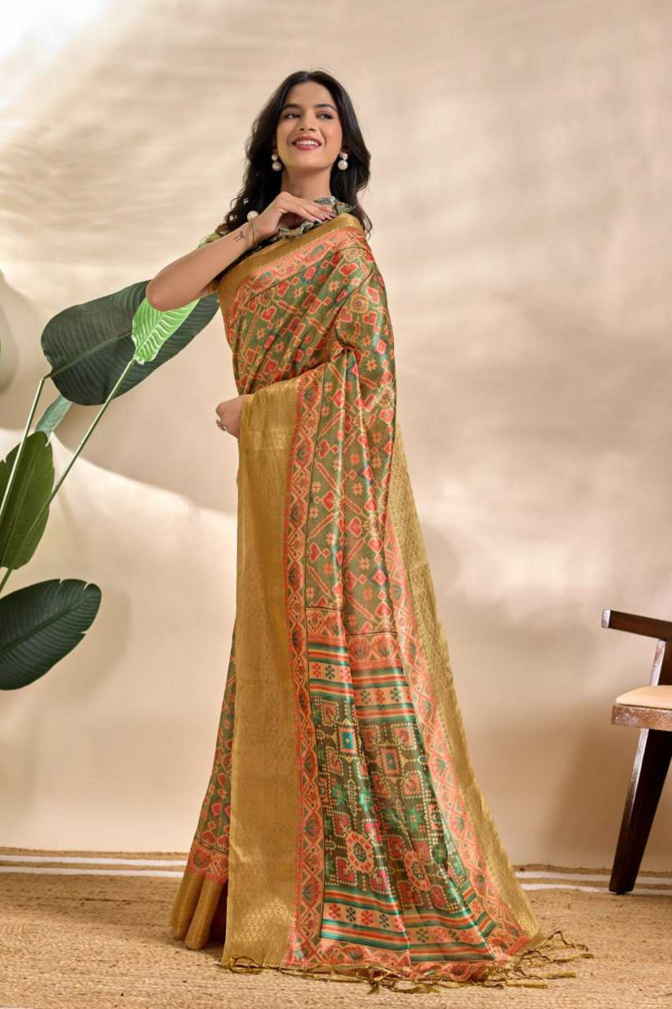 Olive Green Soft Silk Saree with Golden Zari Border & Patola-Inspired Design