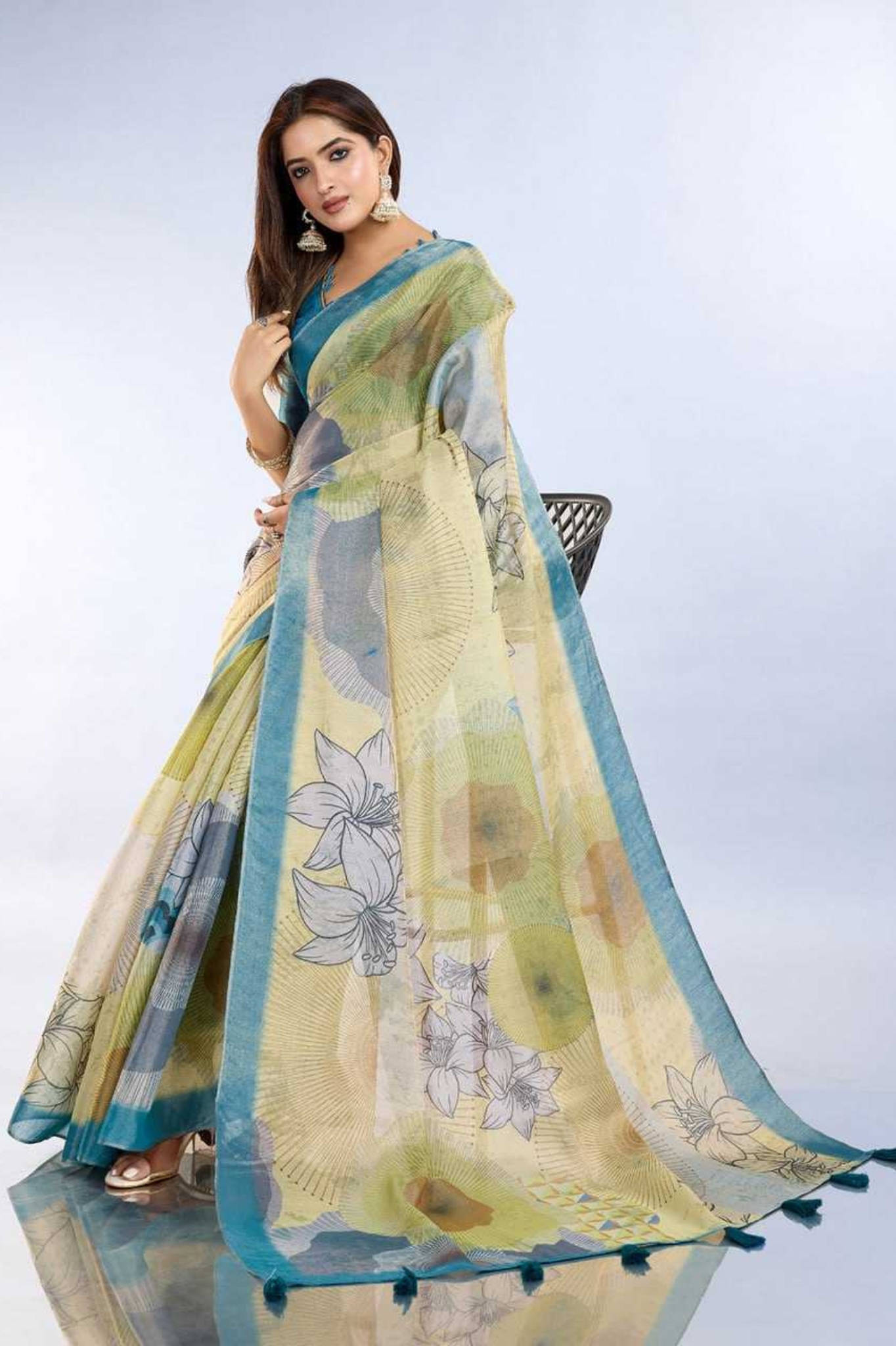 Bring a fresh and elegant vibe to your ethnic collection with this Erode Anmol Silk Saree, designed with a delicate fusion of floral outlines and abstract patterns. The soothing blend of teal, cream, and muted yellow creates a breezy, graceful aesthetic, making it a versatile choice for both daytime celebrations and evening gatherings.