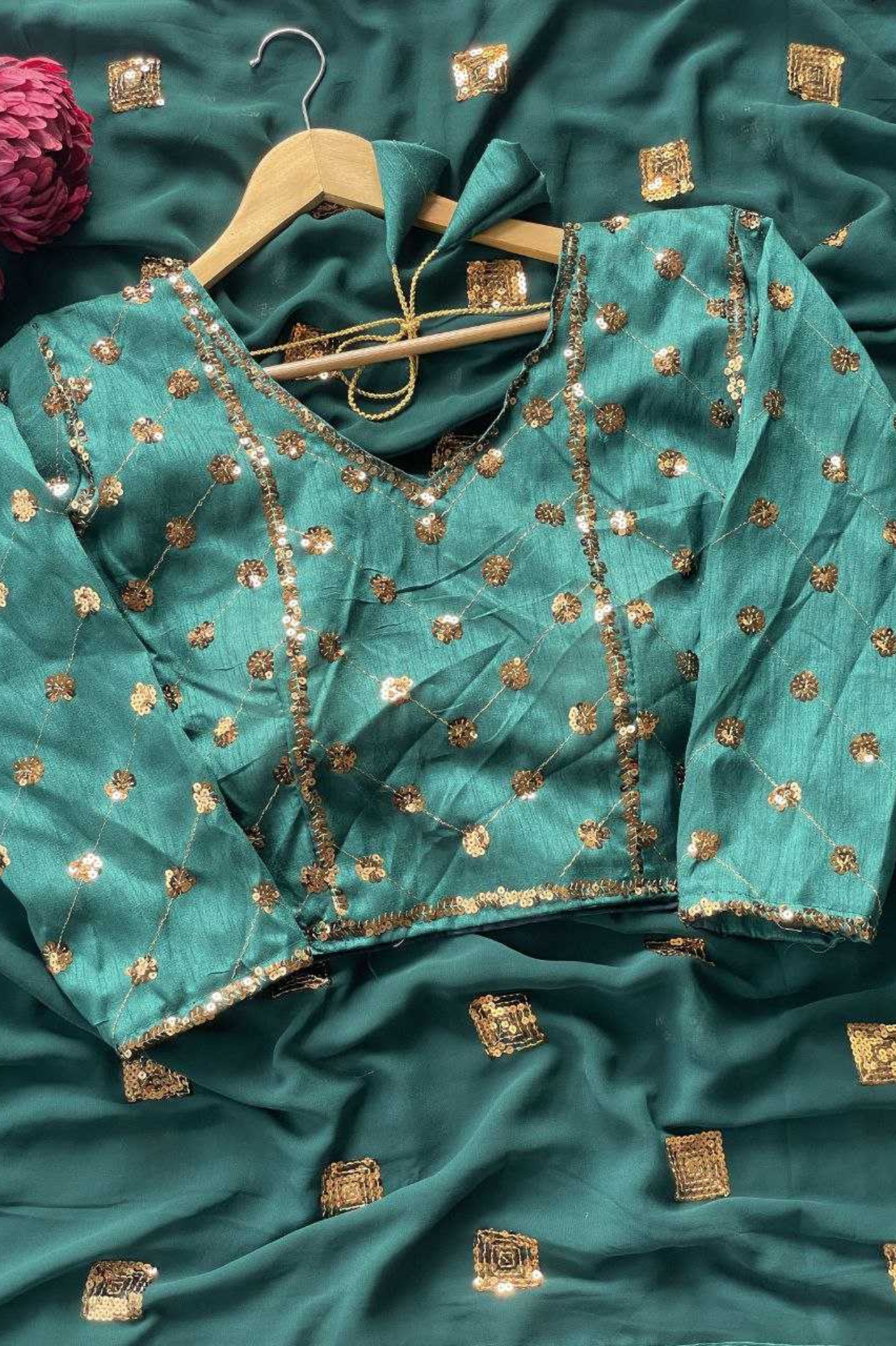 Make a statement at every celebration with this elegant party-wear saree, crafted in heavy-quality faux georgette and adorned with luxurious 5mm sequin embroidery box work. Designed for modern women who love glamour with grace, this saree delivers a rich, festive appeal with effortless drape.