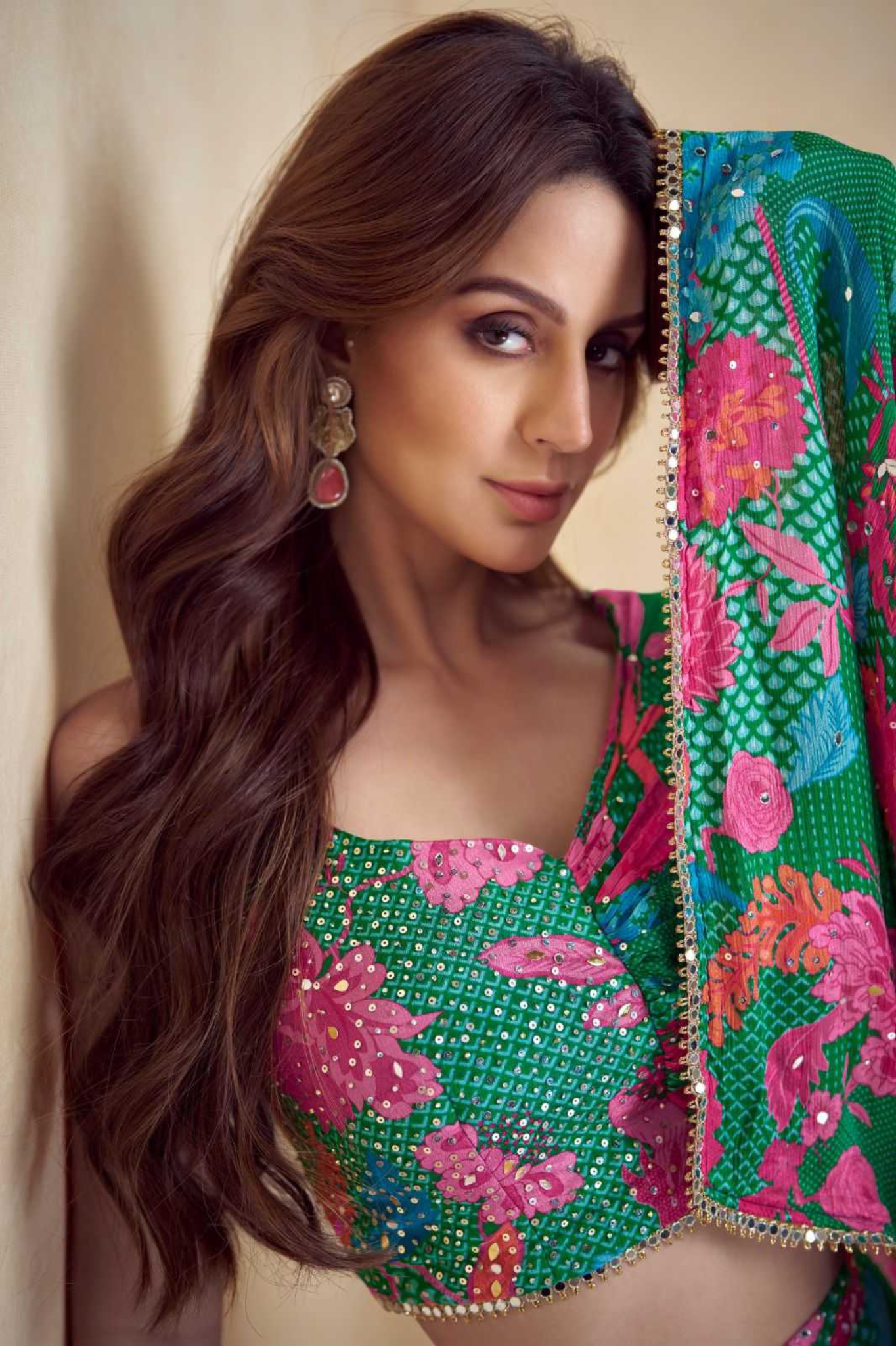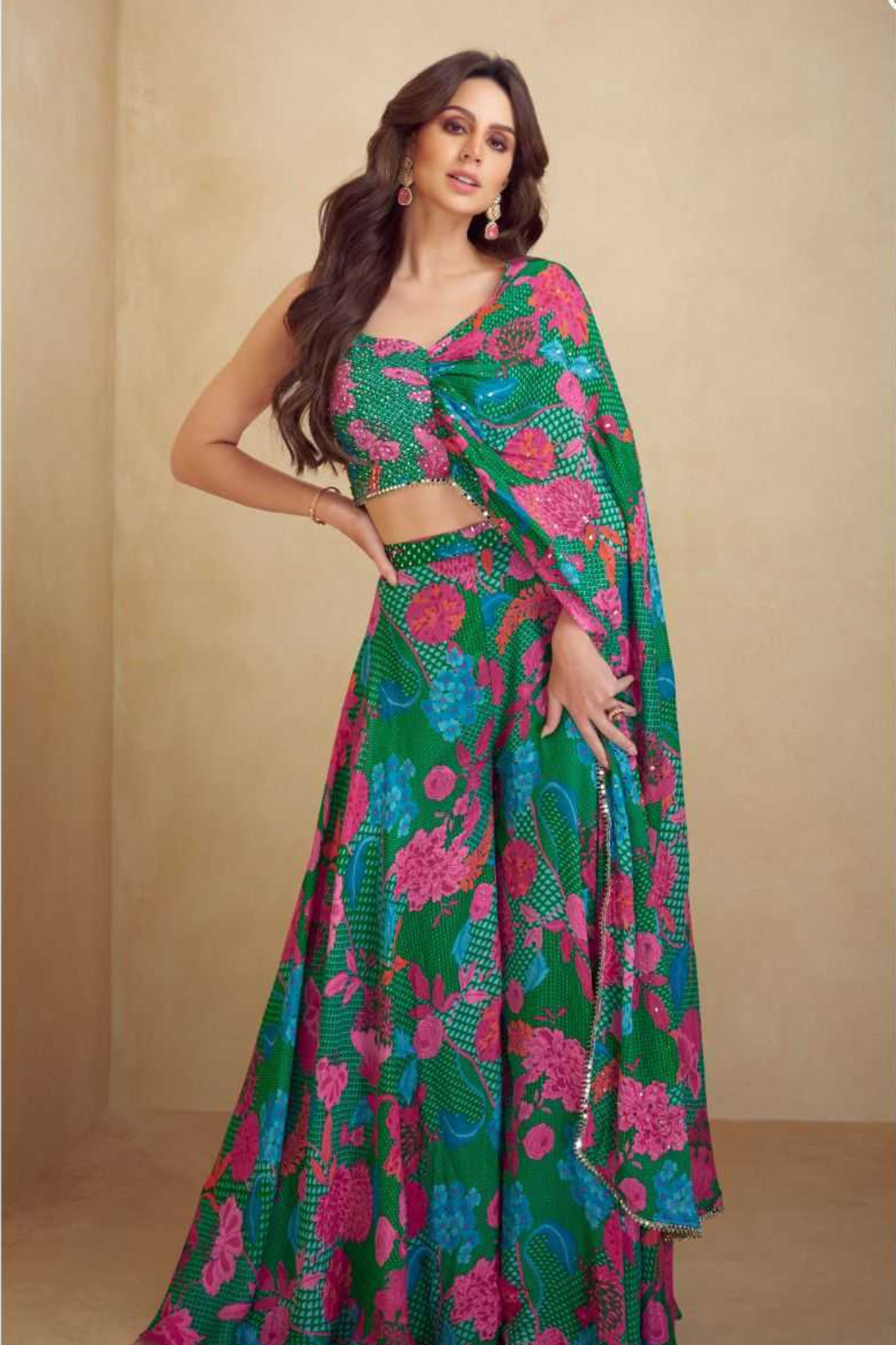 Make a bold festive statement with this vibrant Indo-Western palazzo set designed in luxurious Real Chinon Silk with digital floral prints. The set features a stylish crop top, paired with flowy palazzo pants, and a matching draped dupatta for a complete festive-ready look. The striking green base adorned with bright pink and blue floral patterns makes this outfit a showstopper for weddings, sangeet nights, or cocktail parties.
