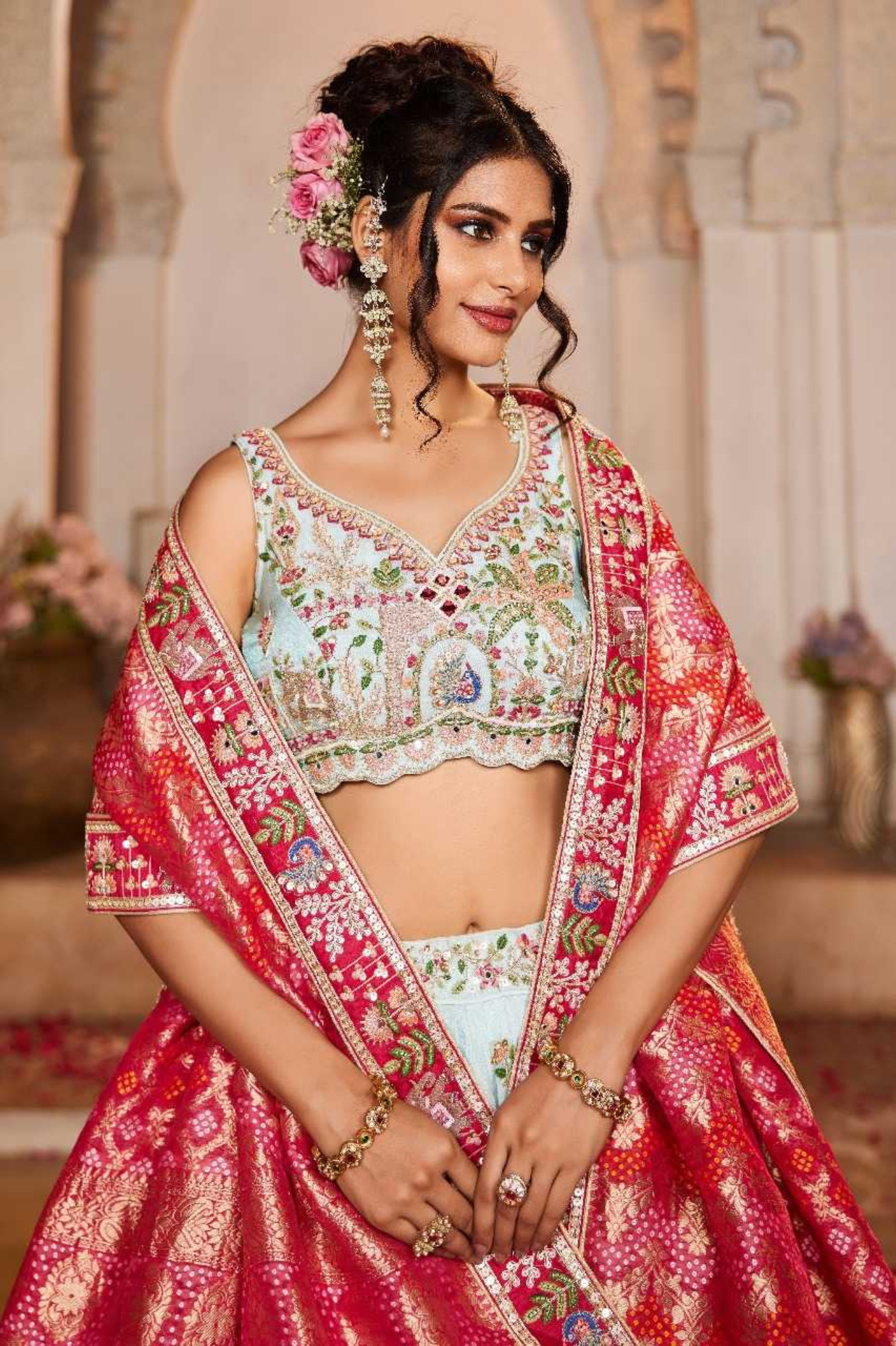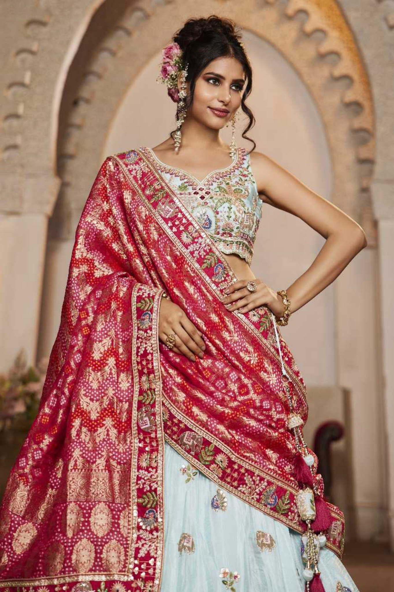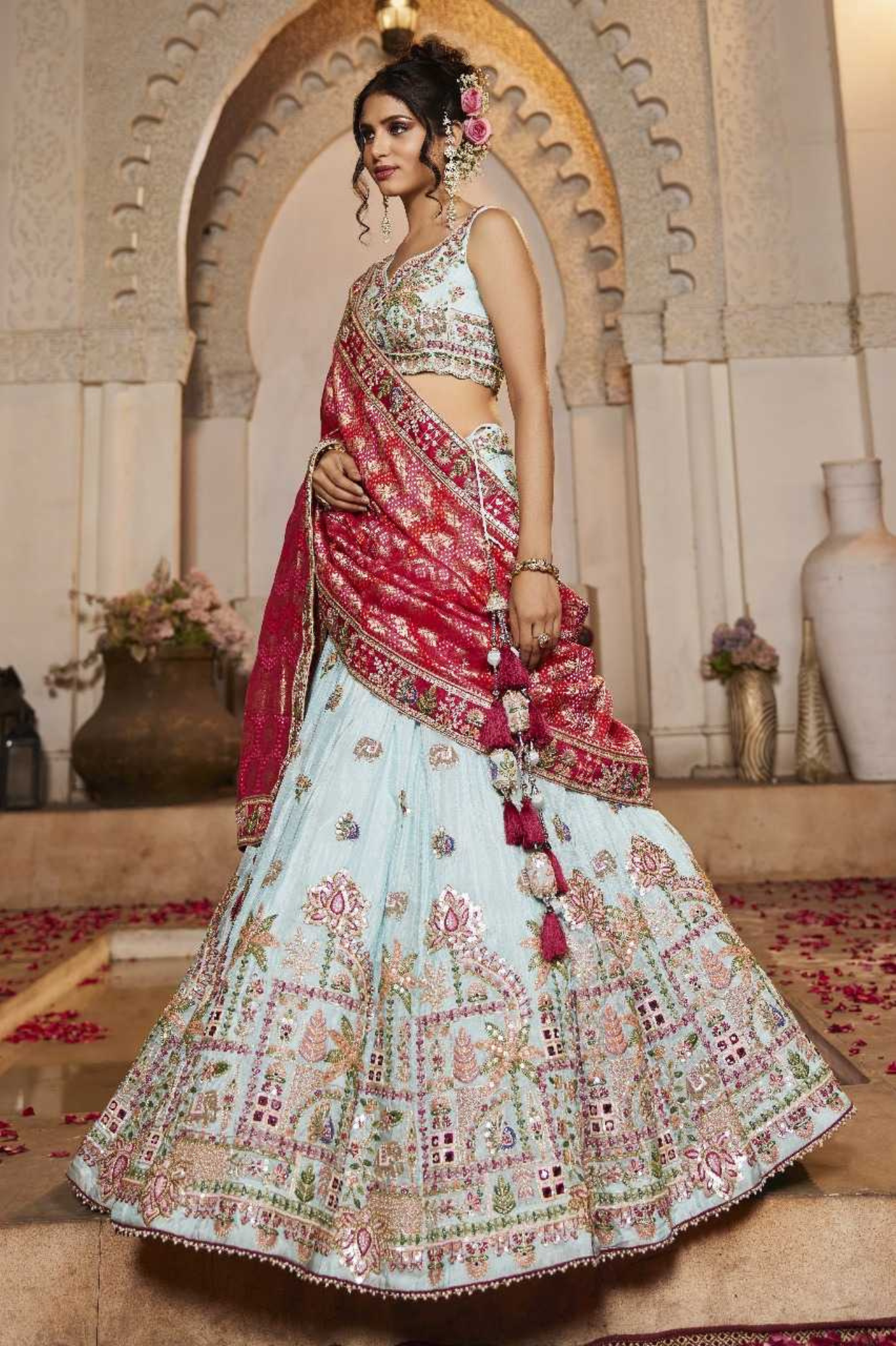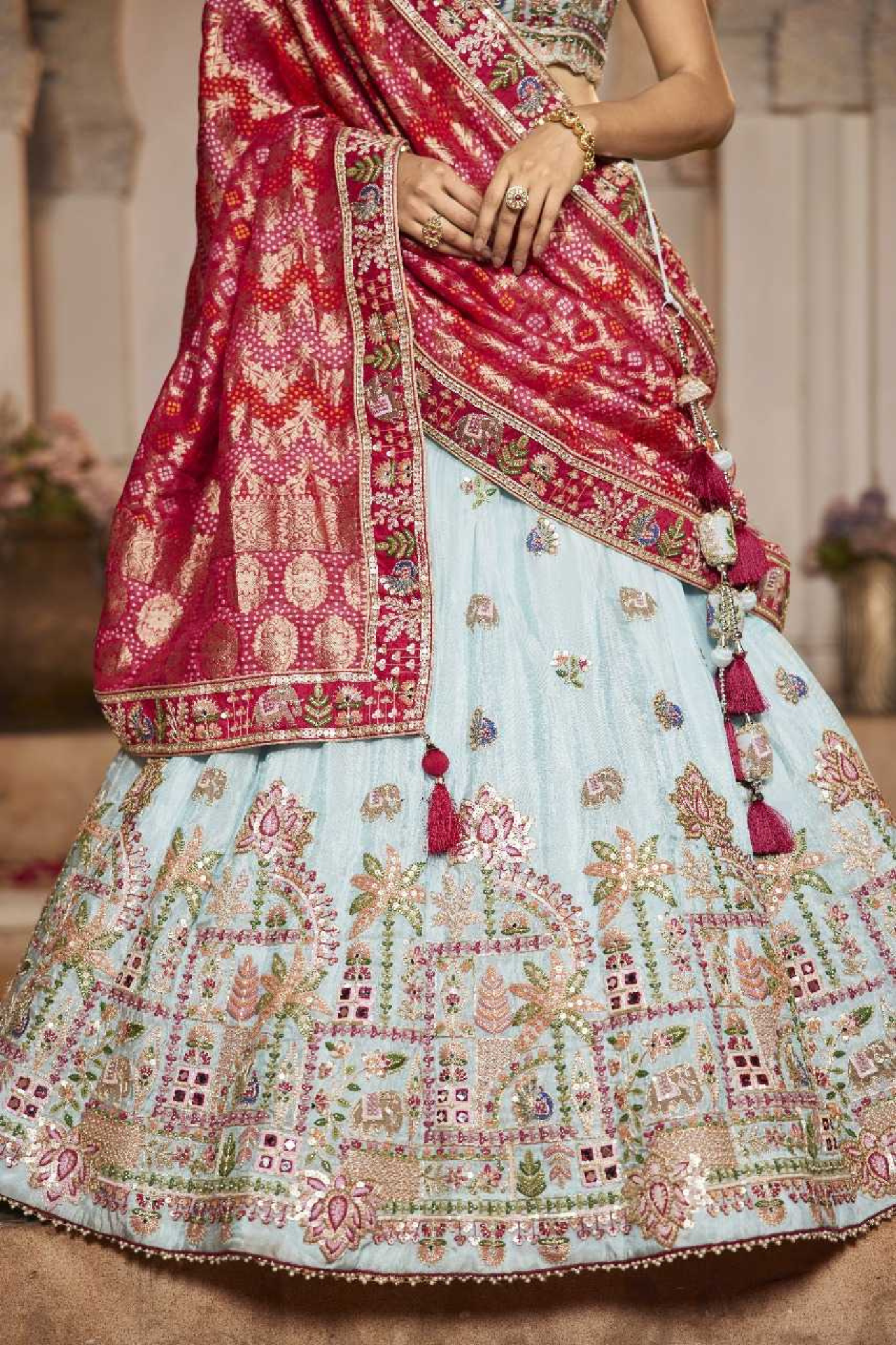 Step into elegance with this white tissue lehenga set, beautifully crafted with intricate embroidery, sequins, and zari detailing. The matching tissue blouse enhances the richness of the outfit with heavy embellishments, creating a regal bridal and festive look. The contrasting viscose rayon dupatta in vibrant red, adorned with intricate borders and tassels, adds a striking finishing touch. Perfect for weddings, sangeet, and festive occasions, this ensemble embodies luxury and tradition.