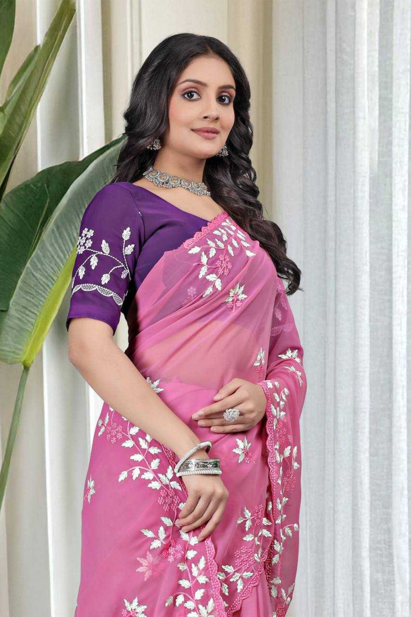 This stunning pink georgette saree features delicate floral threadwork and a scalloped border that gives a graceful, festive look. Paired with a rich contrast blouse, it’s perfect for weddings, receptions, festive events, and special occasions.