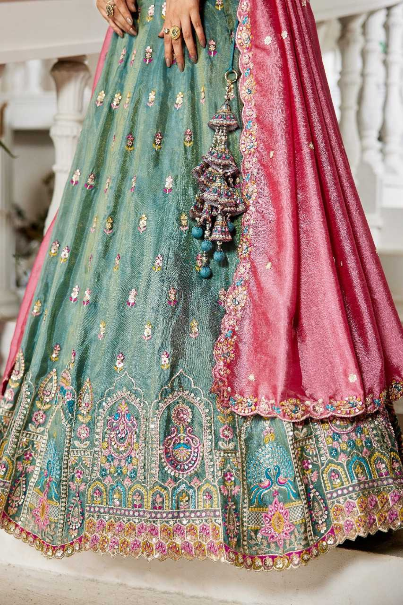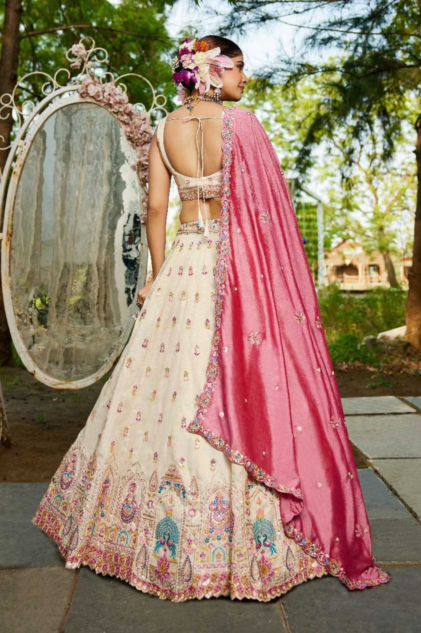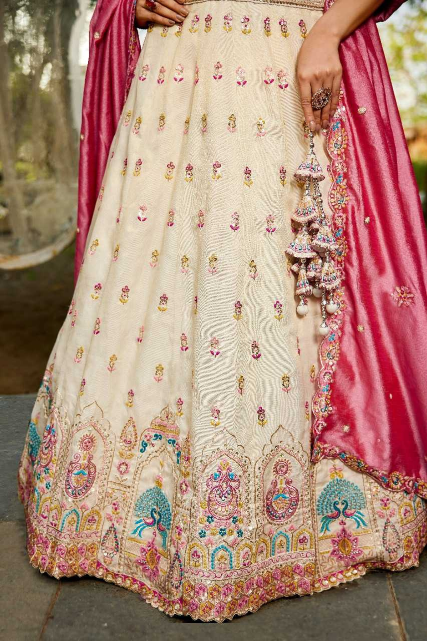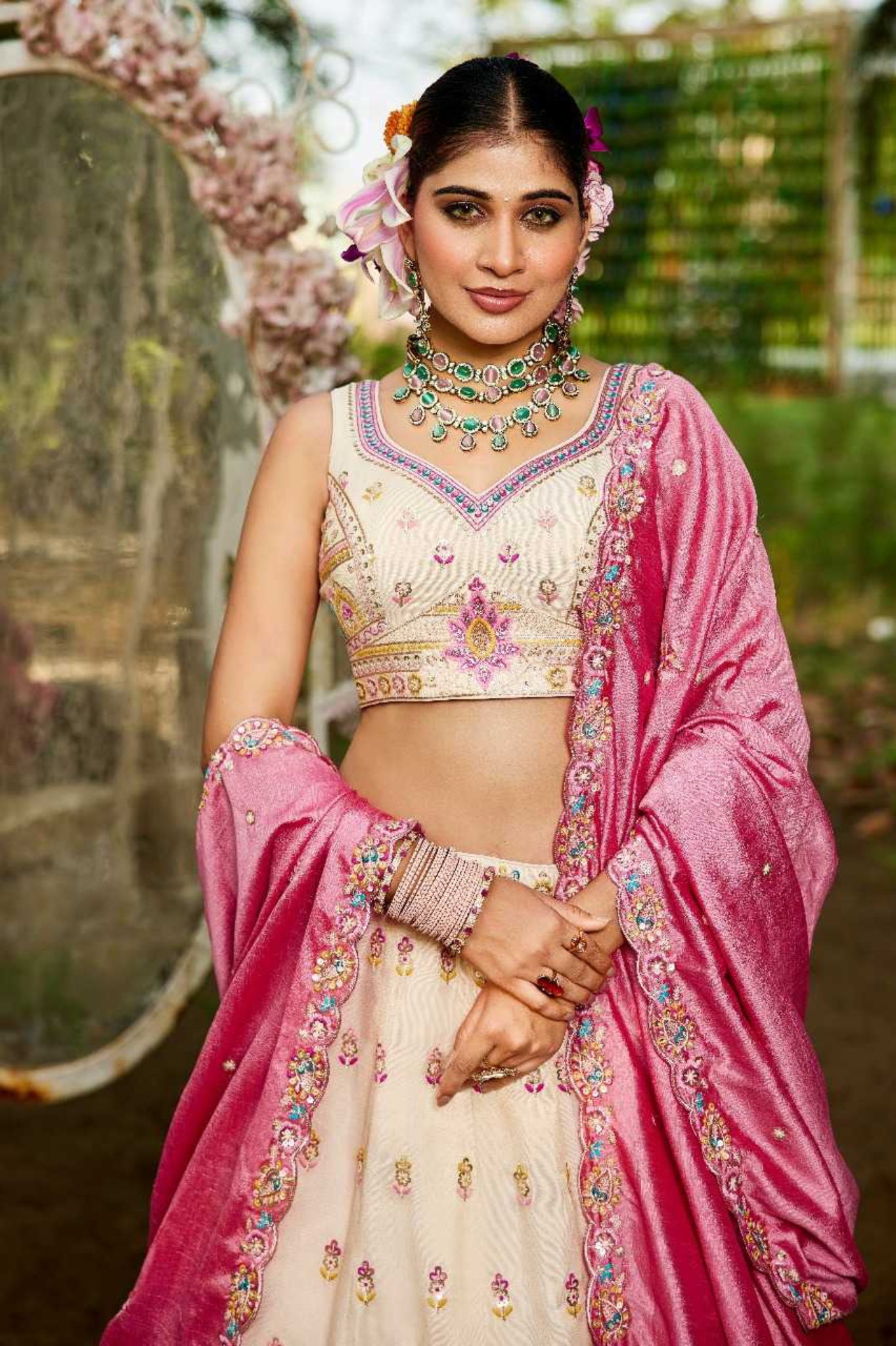 Step into regal elegance with this cream tissue lehenga featuring intricate embroidery and heavy border detailing. The matching tissue blouse is adorned with delicate motifs, while the contrasting pink tissue dupatta with embellished border adds a graceful charm. Perfect for weddings, engagements, and festive occasions.