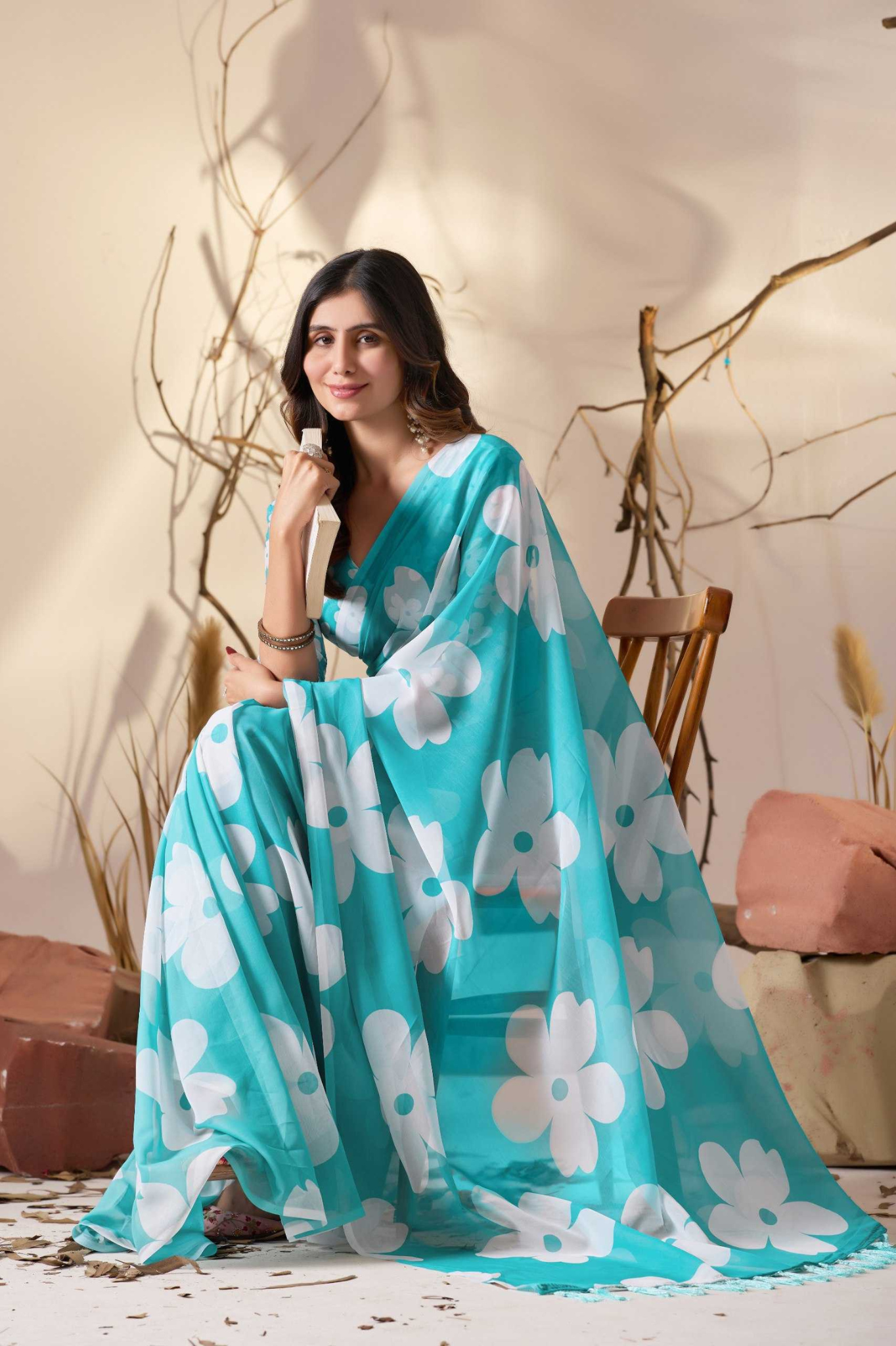 Soft Georgette Aqua Blue Saree with Bold White Floral Digital Print & Tassel Pallu