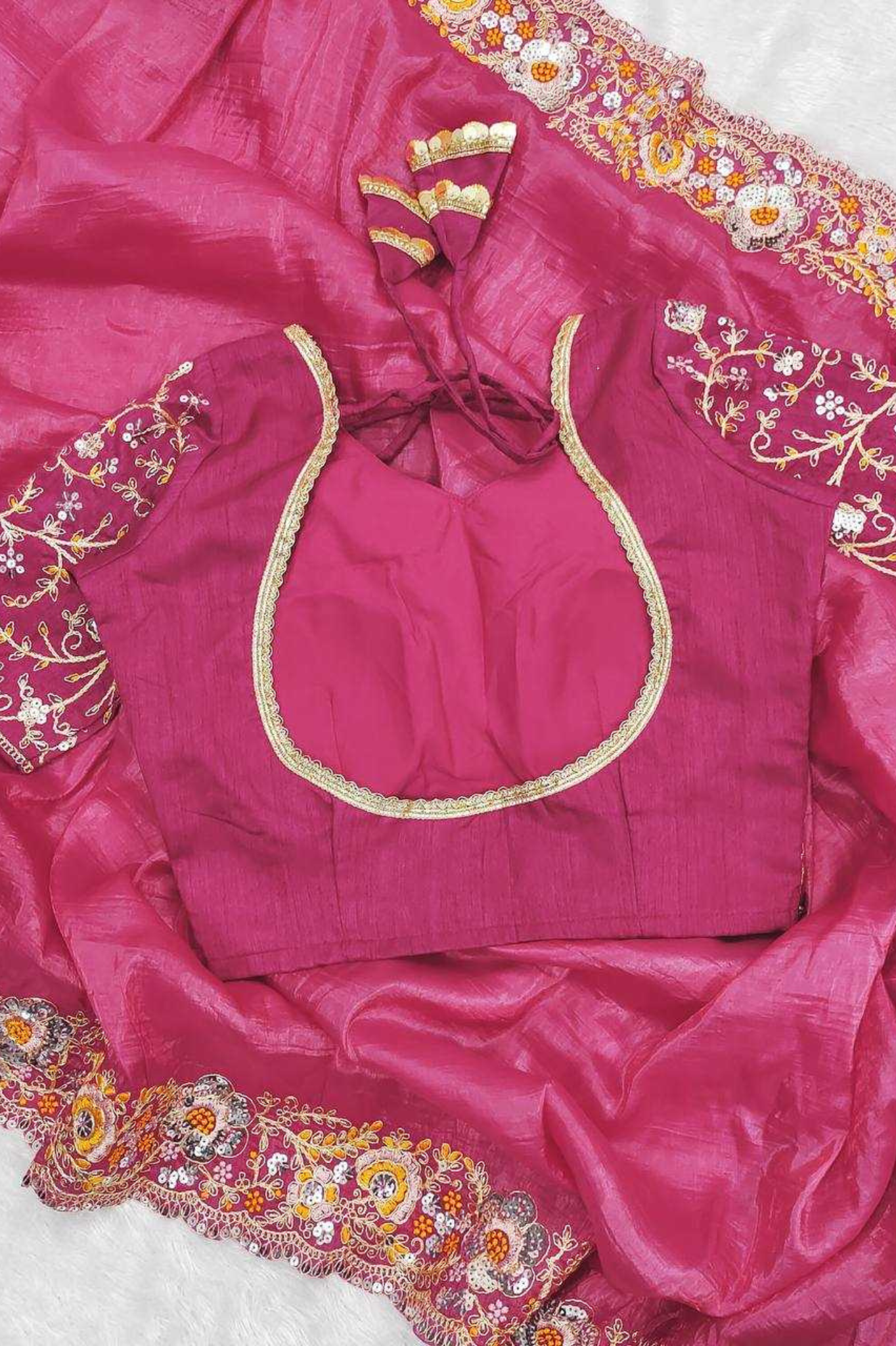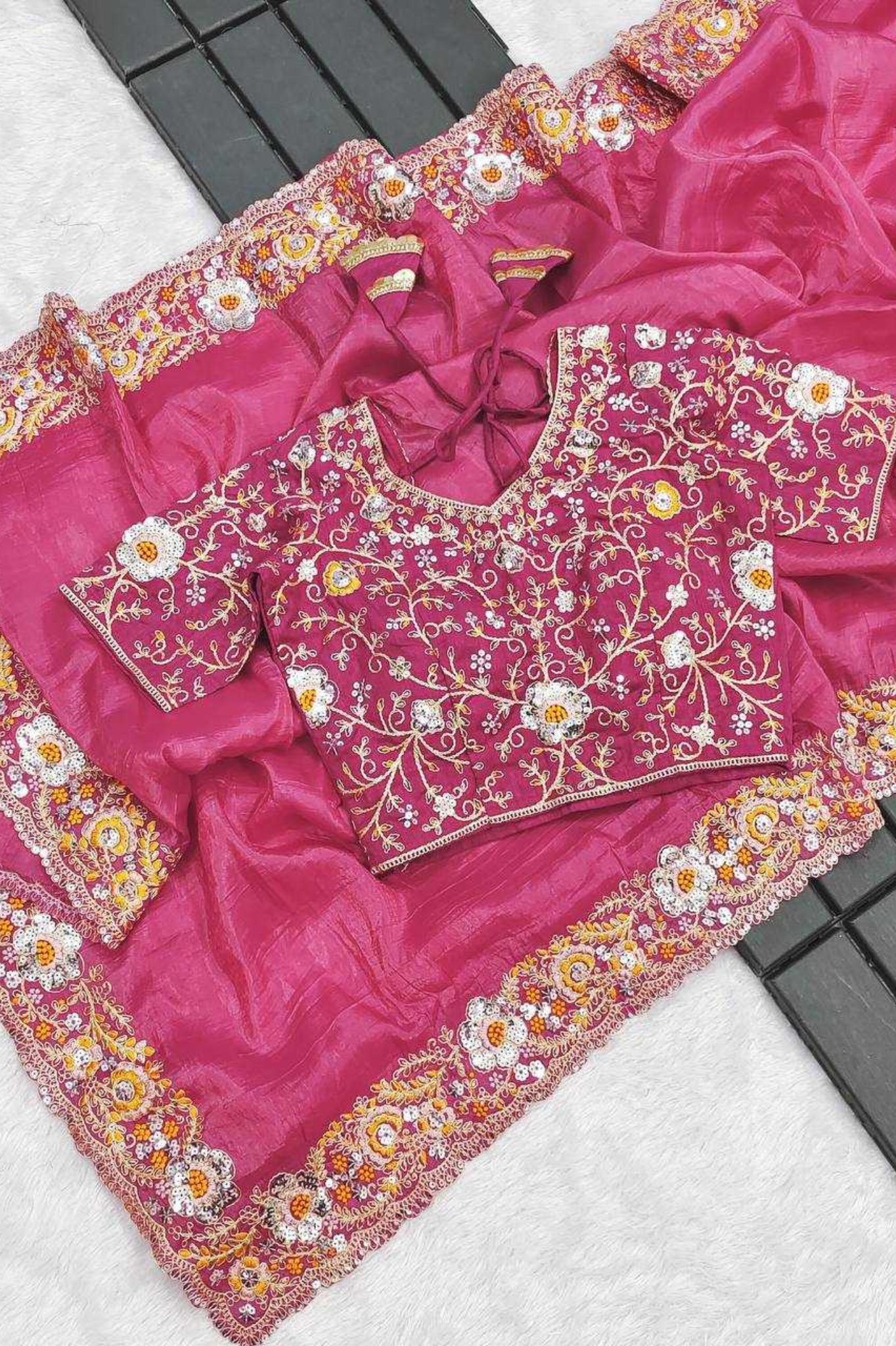 The saree is paired with a matching unstitched blouse piece crafted in the same Premium Gold Crush fabric, embellished with intricate embroidery and sequins detailing for a complete, regal look.
