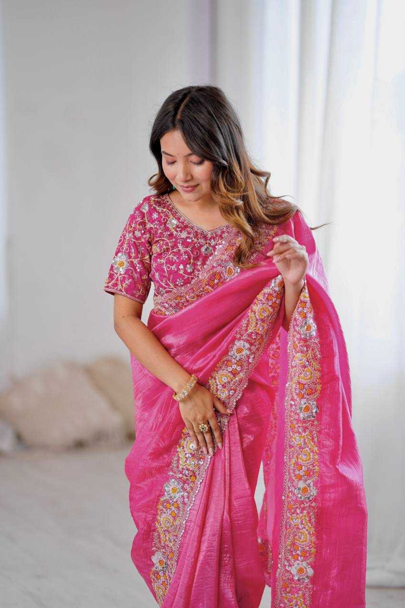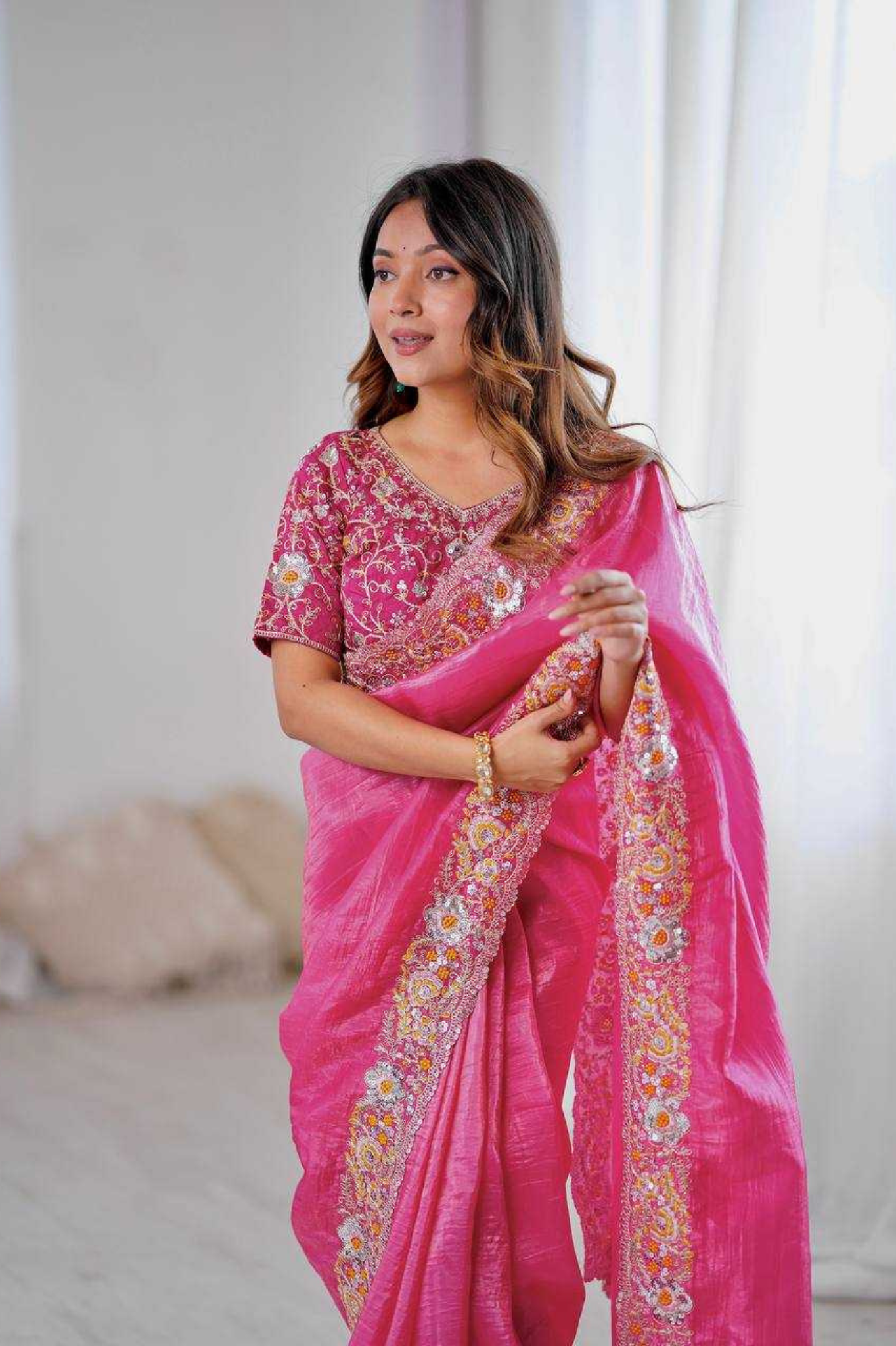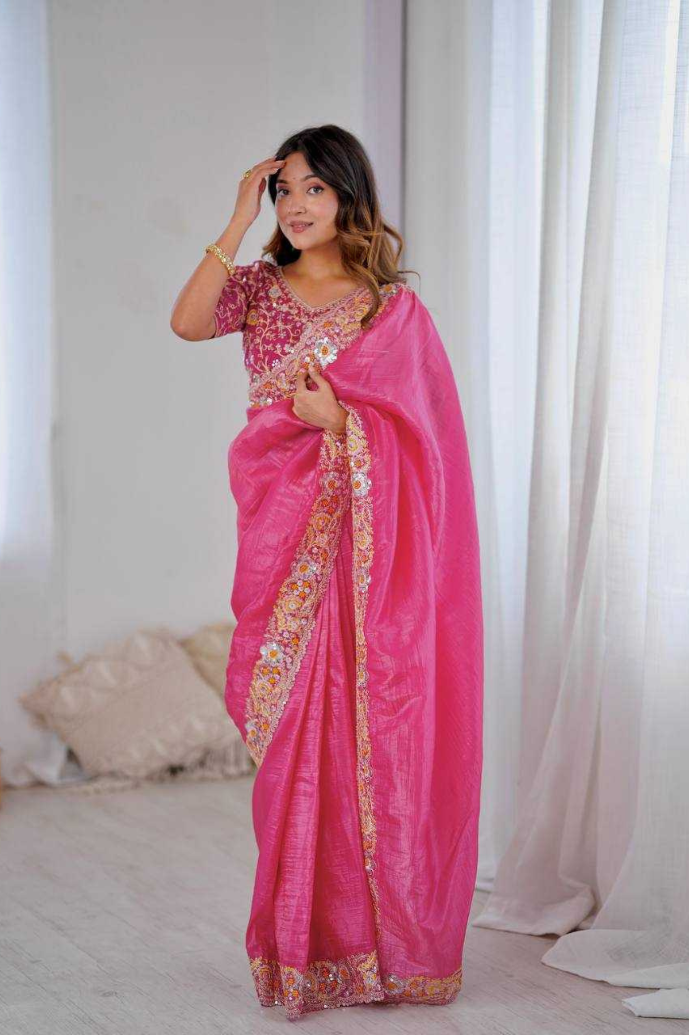 Where tradition meets celebration, and every drape dazzles. Turn heads this festive season with the luminous beauty of our Tissue Shimmer Saree, intricately woven with zari work and finished with a delicate sequin lace border. Lightweight yet statement-making, this saree is your ideal pick...