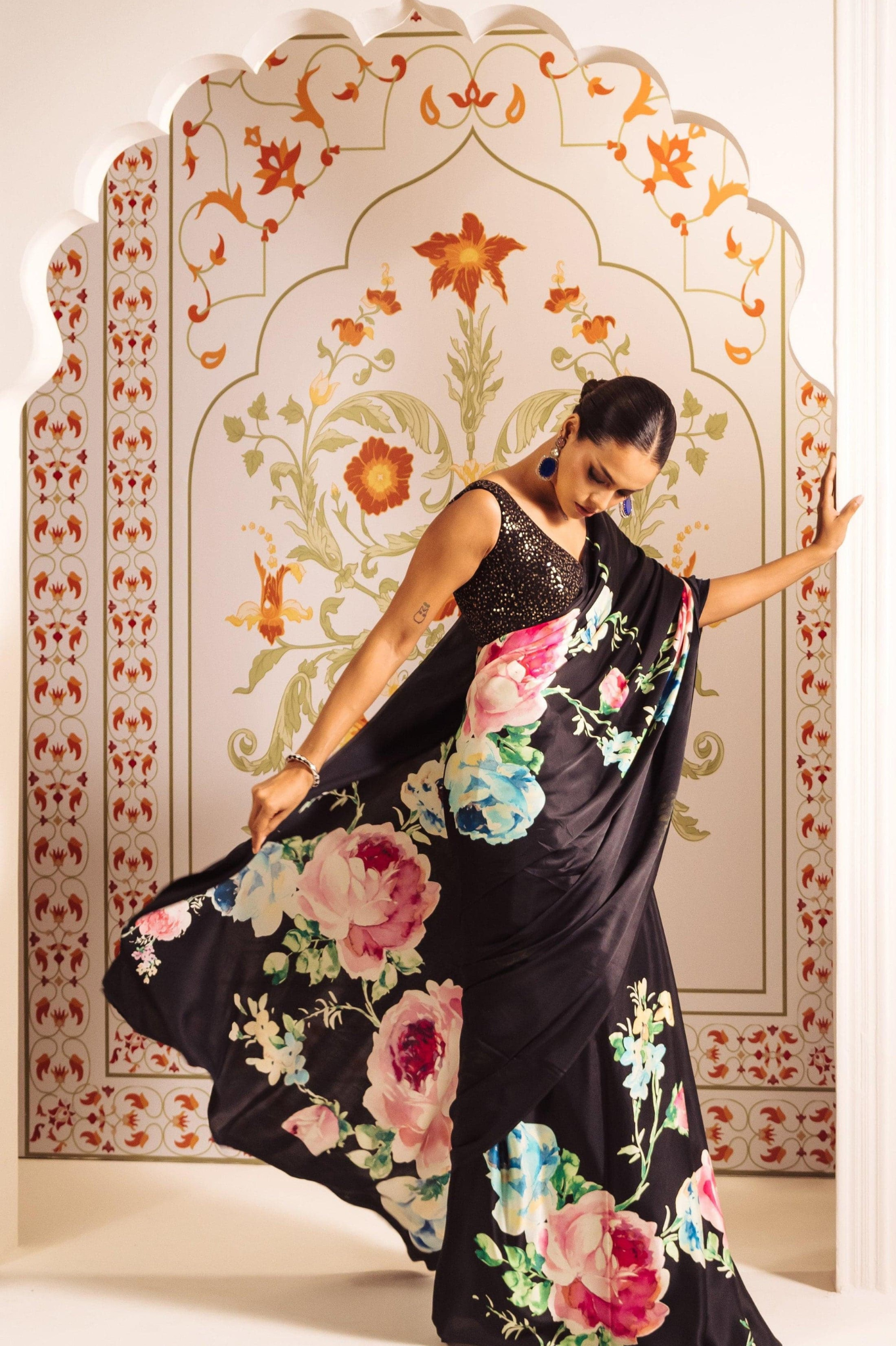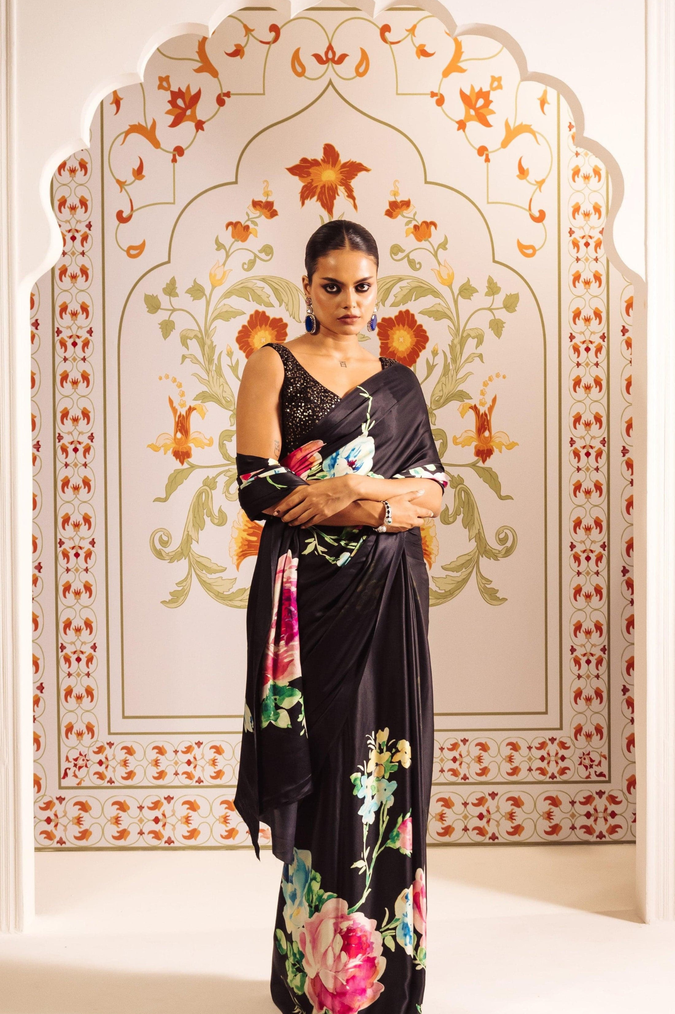 Ivory Floral Digital Print Japan Satin Saree with Matching Blouse