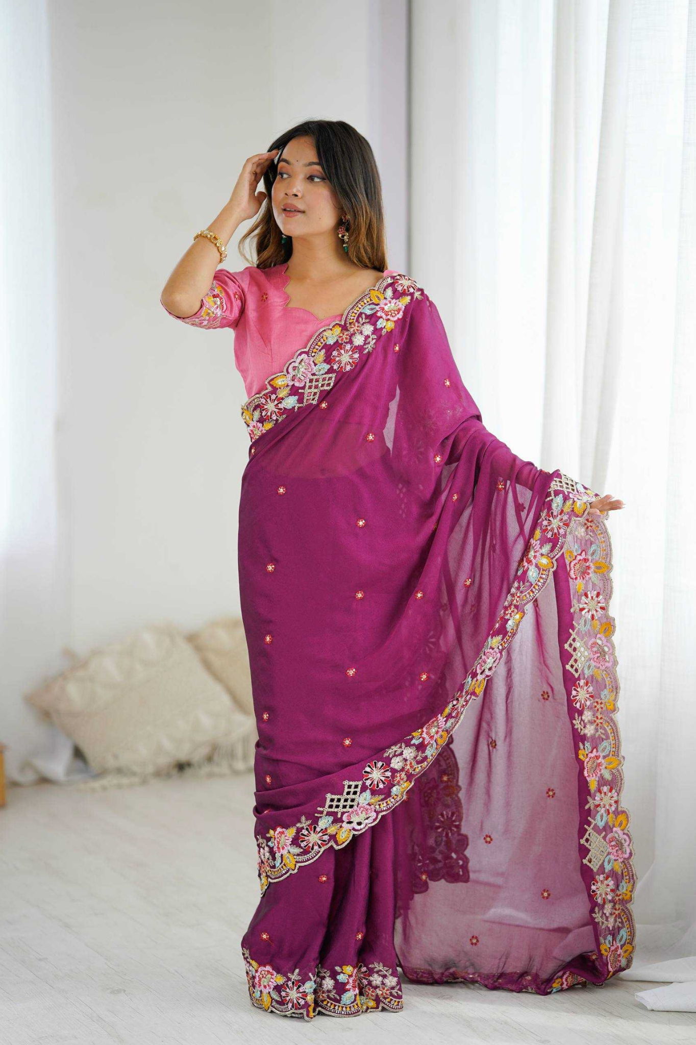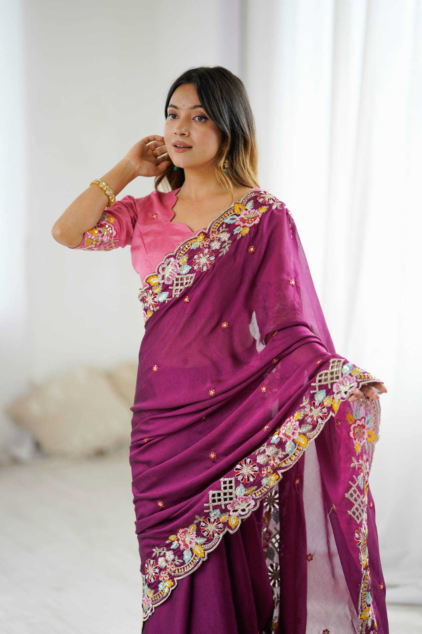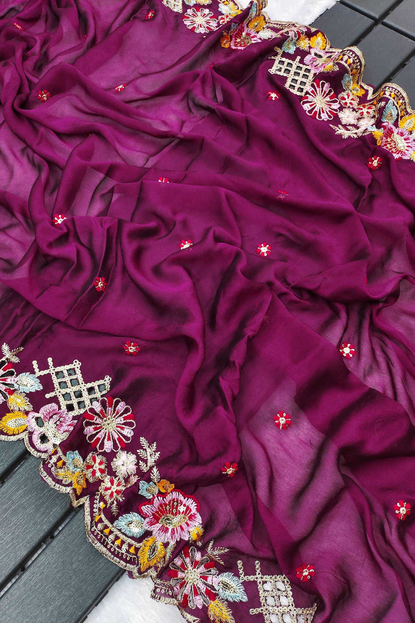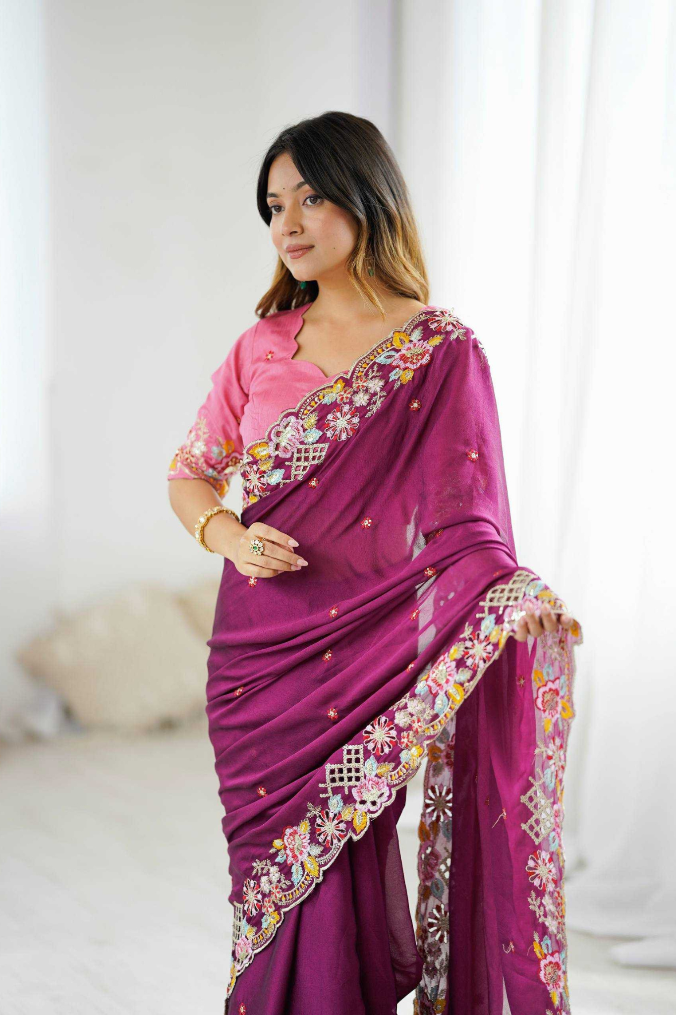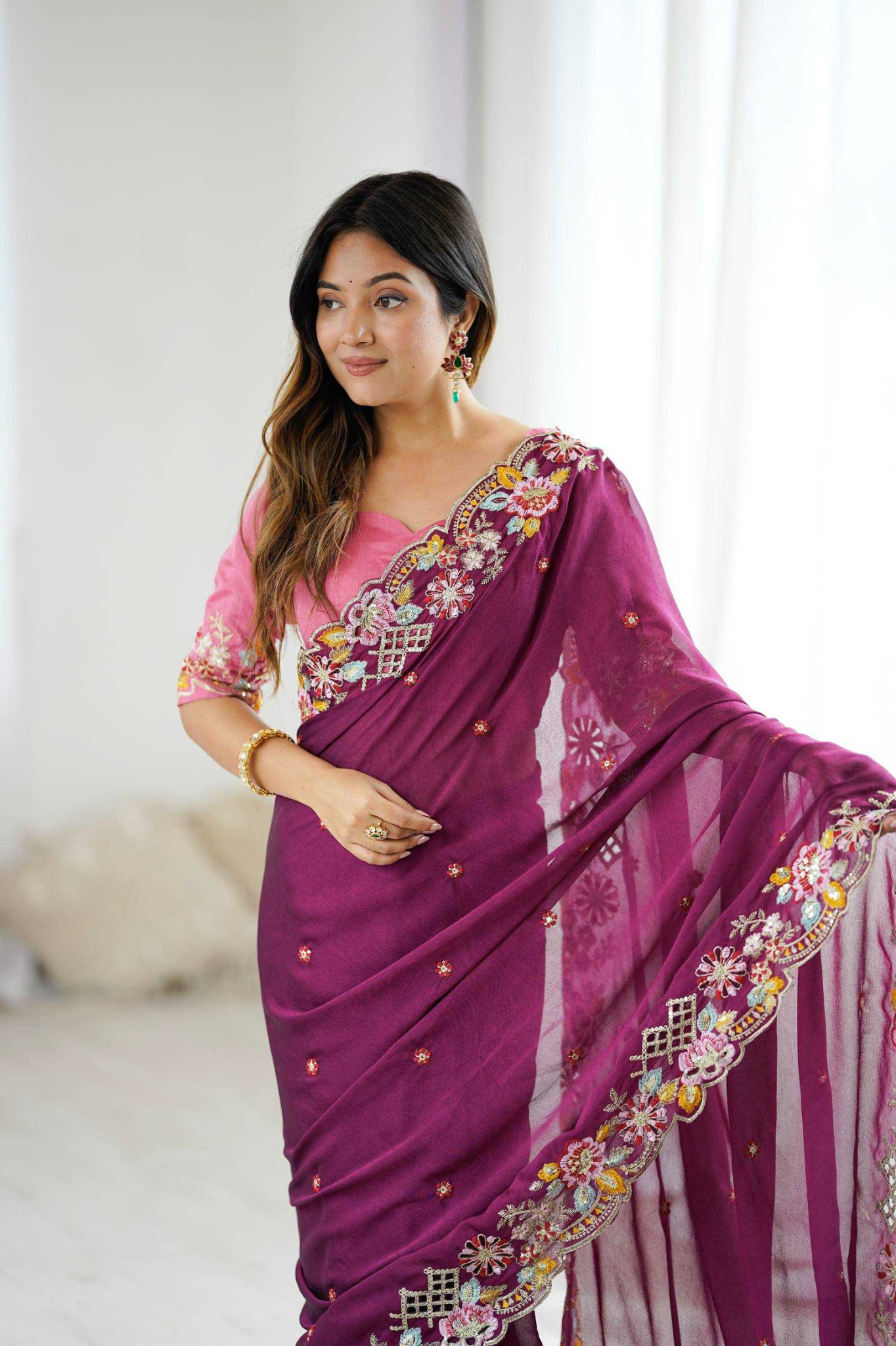 An elegant drape crafted from premium crunchy chiffon, this saree features a graceful scallop design with fine thread embroidery work, making it a timeless addition to your festive and wedding wardrobe. The satin digital print blouse complements the saree beautifully, adding a modern touch...
