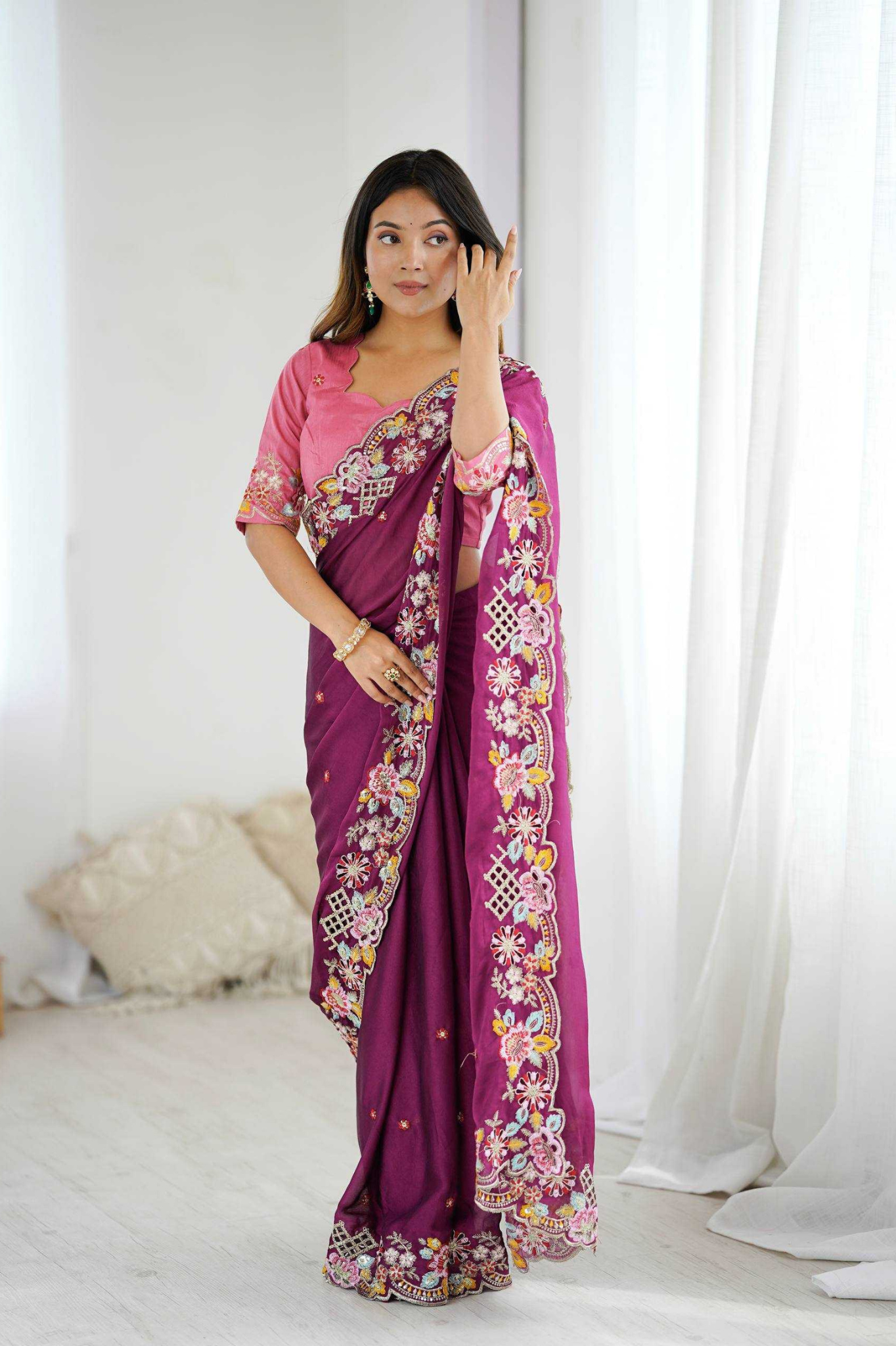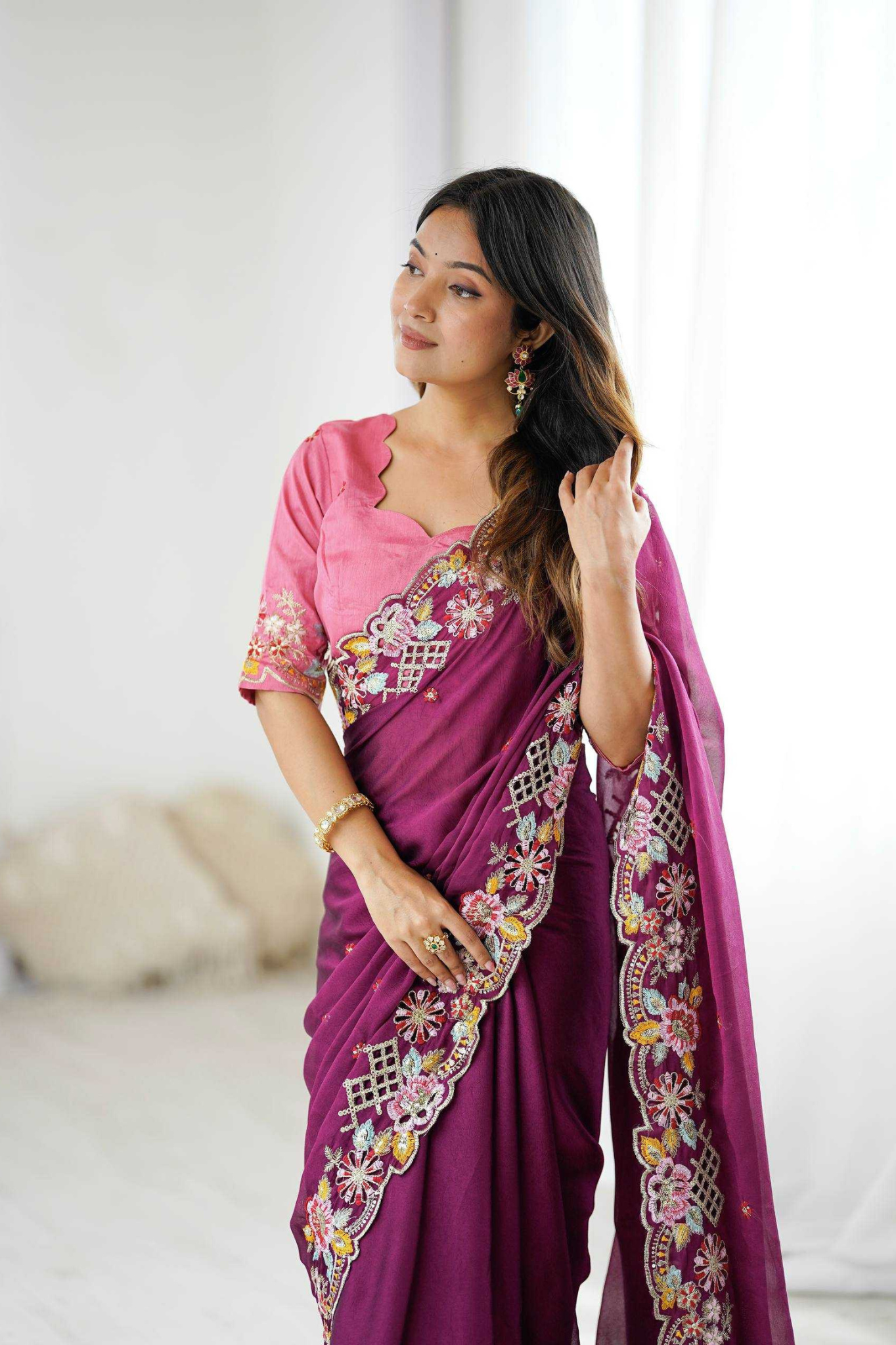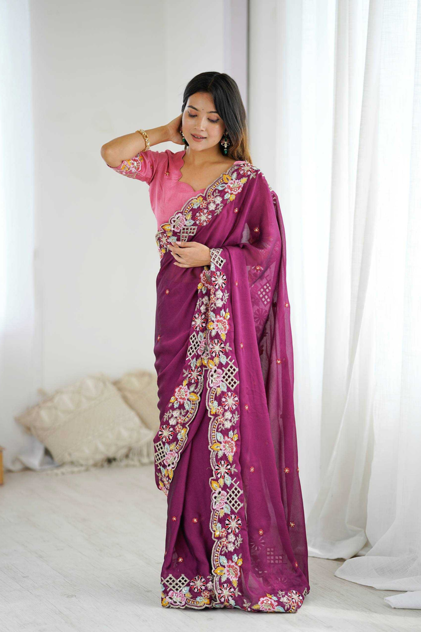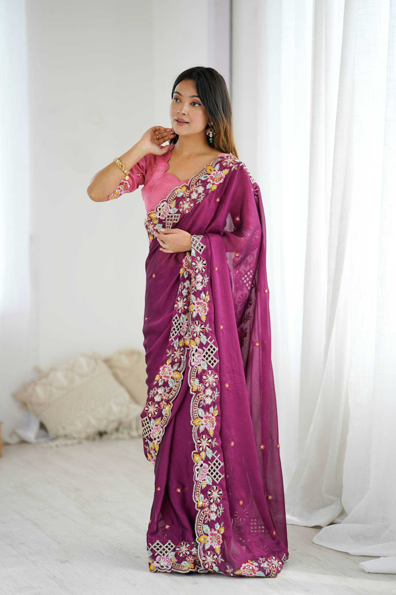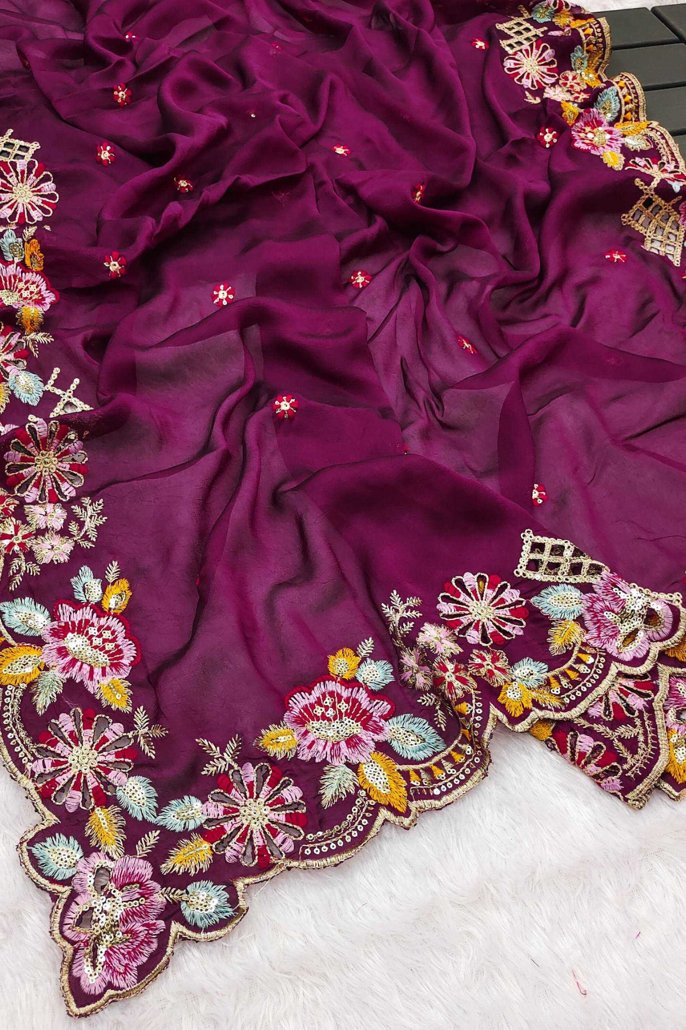 An elegant drape crafted from premium crunchy chiffon, this saree features a graceful scallop design with fine thread embroidery work, making it a timeless addition to your festive and wedding wardrobe. The satin digital print blouse complements the saree beautifully, adding a modern touch...