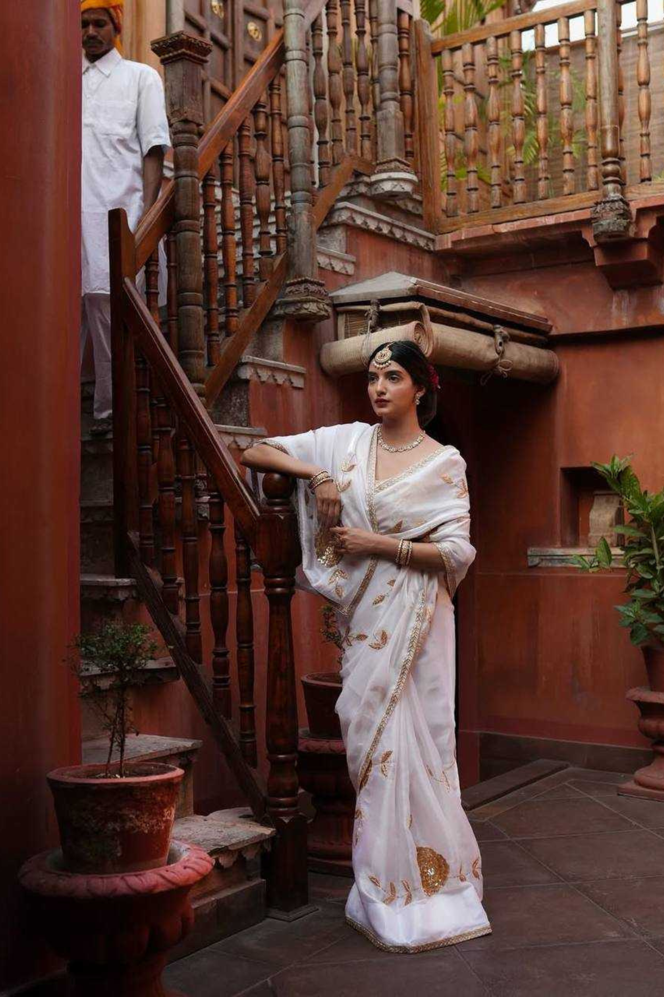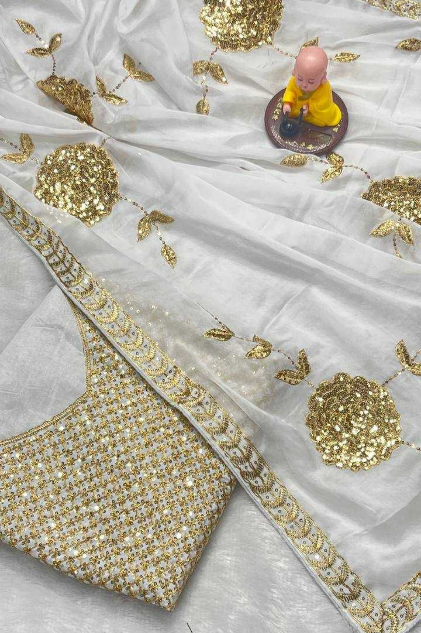 Premium White Georgette Saree with Golden Zari Embroidery & Sequin Detailing