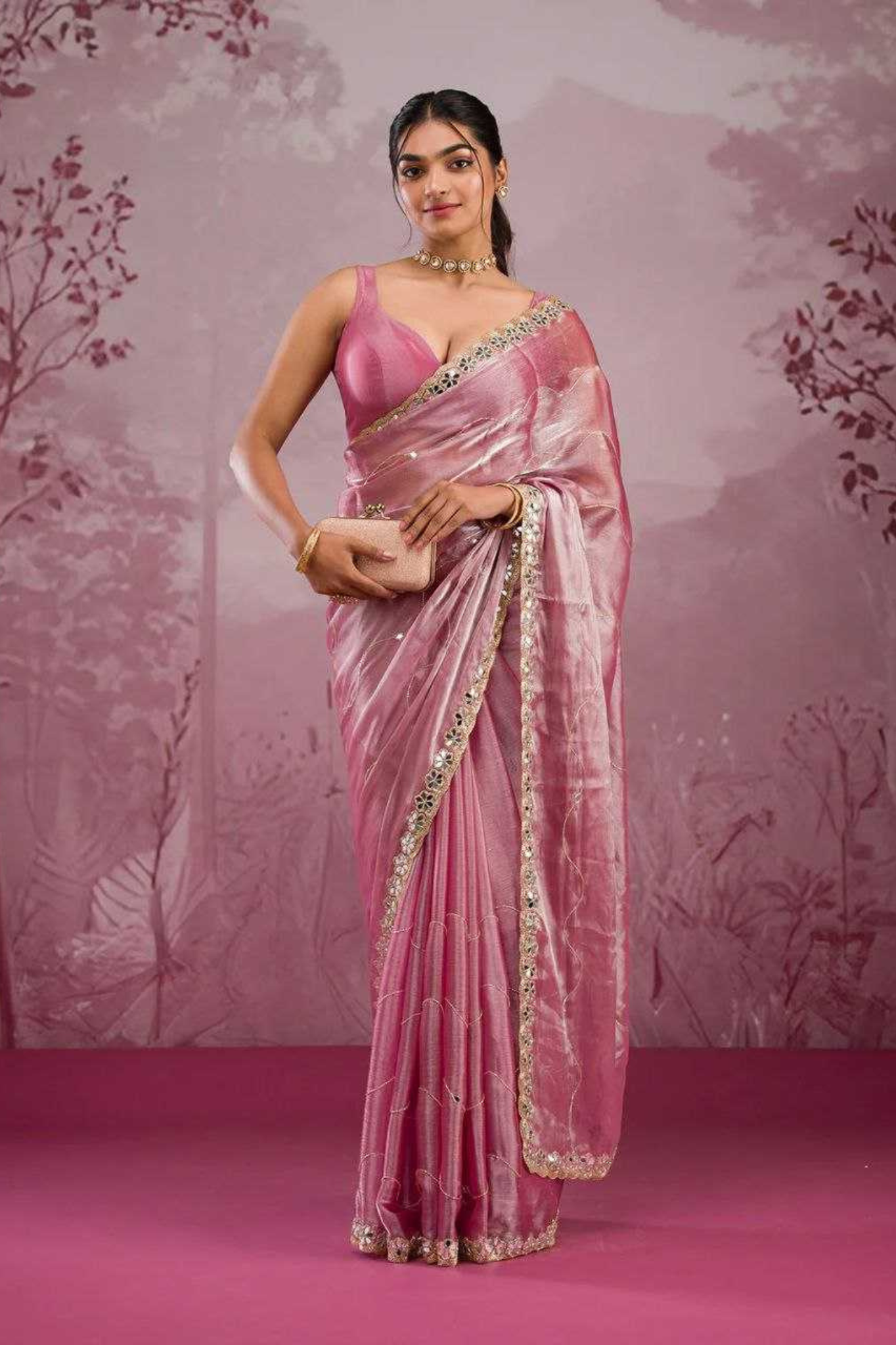 Step into the spotlight with this stunning Pink silk saree, exquisitely embellished with glitter dori work and real mirror detailing...